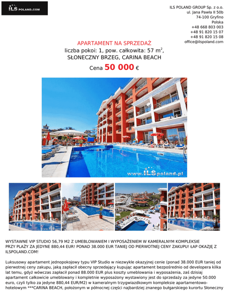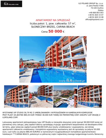 APARTAMENT NA SPRZEDAŻ liczba pokoi: 1, pow. całkowita: 57 m2, SŁONECZNY BRZEG, CARINA BEACH Cena 50 ILS POLAND GROUP Sp. z o.o. ul. Jana Pawła II 50b 74-100 Gryfino Polska +48 668 803 003 +48 91 820 15 07 +48 91 820 15 08 [email protected] 000 € WYSTAWNE VIP STUDIO 56,79 M2 Z UMEBLOWANIEM I WYPOSAŻENIEM W KAMERALNYM KOMPLEKSIE PRZY PLAŻY ZA JEDYNE 880,44 EUR! PONAD 38.000 EUR TANIEJ OD PIERWOTNEJ CENY ZAKUPU! ŁAP OKAZJĘ Z ILSPOLAND.COM! Luksusowy apartament jednopokojowy typu VIP Studio w niezwykle okazyjnej cenie (ponad 38.000 EUR taniej od pierwotnej ceny zakupu, jaką zapłacił obecny sprzedający kupując apartament bezpośrednio od developera kilka lat temu, gdyż wówczas zapłacił ponad 88.000 EUR plus koszty umeblowania i wyposażenia, zaś dzisiaj apartament całkowicie umeblowany i kompletnie wyposażony wystawiony jest do sprzedaży za jedyne 50.000 euro, czyli tylko za jedyne 880,44 EUR/M2) w kameralnym trzygwiazdkowym kompleksie apartamentowohotelowym ***CARINA BEACH, położonym w północnej części najbardziej znanego bułgarskiego kurortu Słoneczny Brzeg nad Morzem Czarnym w Bułgarii, przy samej plaży. ILS POLAND GROUP Sp. z o.o. ul. Jana Pawła II 50b 74-100 Gryfino Polska +48 668 803 003 +48 91 820 15 07 +48 91 820 15 08 [email protected] INFORMACJE PODSTAWOWE O LOKALIZACJI: Słoneczny Brzeg - bułgarski kurort na wybrzeżu Morza Czarnego, około 35 kilometrów na północ od Burgas (gmina Nesebyr). Słoneczny Brzeg to największy i najbardziej popularny kurort Bułgarii, z około 200 hotelami i 120 restauracjami. Jego budowa rozpoczęła się w 1958 roku, w miejscu, gdzie w starożytności i w średniowieczu znajdowały się studnie, zaopatrujące Neseber (staroż. Mesambrię) w wodę. W czasach obecnych największe grupy turystów stanowią Niemcy, Skandynawowie, Brytyjczycy, a także Polacy, Czesi i Słowacy. Miasto jest nazywane Las Vegas Wschodniej Europy. Dyskoteki, kluby, restauracje, parki rozrywki i zespoły hotelowe z basenami oświetlają po zmroku całe wybrzeże. W okolicy znajdują się 2 Aquaparki. Miasto praktycznie połączone jest z Nesebyrem - wjazd do tego miasta od strony Brzegu symbolizuje stary Wiatrak. OPIS APARTAMENTU OFEROWANEGO DO SPRZEDAŻY: 1. Wystawny apartament jednopokojowy typu Vip Studio o powierzchni całkowitej 56,79 m2 (obszerną galerię aż 38 fotografii udostępniamy wyłącznie w naszym firmowym serwisie WWW.ILSPOLAND.COM), luksusowo wykończony, oferowany z całkowitym umeblowaniem i wyposażeniem, położony na pierwszym piętrze (drugiej kondygnacji) w eleganckim kompleksie przy plaży, 500 m od centrum najbardziej znanego i popularnego turystycznie bułgarskiego kurortu Słoneczny Brzeg, 2. Klimatyzowane (klimatyzacja sterowana indywidualnie), przestronne, stylowo urządzone wnętrze z łazienką, domofonem, dostępem do Internetu, 3. Zaledwie 24 km od międzynarodowego lotniska w mieście w Burgas, 4. Składa się z dużego salonu z jadalnią z aneksem kuchennym, przedpokoju, łazienki z wanną i WC, 5. Mieszkanie posiada balkon z bezpośrednim widokiem na morze, basen, plażę, Sloneczny Brzeg, Nesebar i całą zatokę. 6. Sprzedawane jest w pełni wyposażone- klimatyzacja, meble, zabudowa kuchenna na wymiar, sprzet RTV i AGD (tv, lodówka, płyta, piekarnik, itp.) WAŻNE: Apartament sprzedawany jest w całości z wyposażeniem i umeblowaniem w bardzo dobrym stanie technicznym widocznym na zdjęciach z wewnątrz mieszkania, prezentowanych tylko w naszym firmowym serwisie WWW.ILSPOLAND.COM, a składa się z dużego salonu z aneksem kuchennym, przedpokoju, łazienki z wanną i WC oraz balkonu z widokiem na morze, basen, plażę, Sloneczny Brzeg, Nesebar i całą zatokę. OPIS KOMPLEKSU ***CARINA BEACH: Carina Beach to kameralny kompleks o eleganckiej architekturze, wybudowany w 2007 roku w najlepszej i najbardziej prestiżowej lokalizacji w Słonecznym Brzegu, przy samym morzu i plaży w północnej części kurortu w bezposrednim sąsiedztwie najbardziej eleganckich hoteli, a zarazem w cichym i spokojnym miejscu. Właściciele apartamentów i goście na terenie kompleksu Carina Beach, mają do swojej dyspozycji: ● ● ● ● ● ● ● ● całodobową recepcję wraz z holem recepcyjnym, całodobową ochronę i monitoring, parking strzeżony, restaurację, basen na wolnym powietrzu z sekcją dla dzieci, bar przy basenie, kantor wymiany walut, windę, etc.. ILS POLAND GROUP Sp. z o.o. ul. Jana Pawła II 50b 74-100 Gryfino Polska +48 668 803 003 +48 91 820 15 07 +48 91 820 15 08 [email protected] UWAGA: Oferta indywidualna z rynku wtórnego z ILS POLAND GROUP ponad 38.000 EUR taniej od pierwotnej ceny zakupu, jaką zapłacił obecny sprzedający kupując apartament bezpośrednio od developera kilka lat temu, gdyż wówczas zapłacił ponad 88.000 EUR plus koszty umeblowania i wyposażenia, zaś dzisiaj apartament całkowicie umeblowany i kompletnie wyposażony wystawiony jest do sprzedaży za jedyne 50.000 euro, czyli tylko za jedyne 880,44 EUR/M2, a koszt zarządu i utrzymania, tzw. czynsz wynosi jedyne 12 euro/m2 apartamentu na rok! WAŻNE: Wszystkie nieruchomości prezentowane w ofertach pochodzą bezpośrednio od sprzedających, obejmują wyłącznie pełną własność i są sprawdzone pod względem formalno prawnym oraz są wolne od wad prawnych i praw osób trzecich, a zakup z naszą firmą obejmuje pełną gwarancję bezpieczeństwa w dowolnym kraju z którego prezentujemy daną nieruchomość i obejmuje kompleksową obsługę oraz opiekę polskiego rezydenta firmy ILS POLAND GROUP! ZAINTERESOWANY? DZWOŃ! +48 608 363 366, WIĘCEJ INFORMACJI I OFERT? ZOBACZ! WWW.ILSPOLAND.COM UWAGA: Oferta dostępna wyłącznie w banku ofert ILS POLAND GROUP, zaś obszerną galerię aż 38 fotografii i dokładną lokalizację oraz więcej informacji i szerszą gamę ofert prezentujemy wyłącznie w naszym firmowym serwisie: WWW.ILSPOLAND.COM Symbol ILS6426 Typ nieruchomości APARTAMENT Rodzaj transakcji SPRZEDAŻ