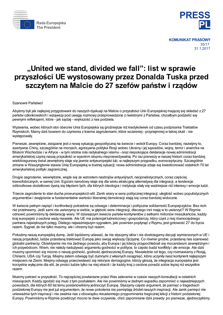 Rada Europejska The President PRESS PL KOMUNIKAT PRASOWY 35/17 31.1.2017 „United we stand, divided we fall”: list w sprawie przyszłości UE wystosowany przez Donalda Tuska przed szczytem na Malcie do 27 szefów państw i rządów Szanowni Państwo! Abyśmy byli jak najlepiej przygotowani do naszych dyskusji na Malcie o przyszłości Unii Europejskiej mającej się składać z 27 państw członkowskich i wziąwszy pod uwagę rozmowy przeprowadzone z niektórymi z Państwa, chciałbym podzielić się pewnymi refleksjami, które - jak sądzę - większość z nas podziela. Wyzwania, wobec których stoi obecnie Unia Europejska są groźniejsze niż kiedykolwiek od czasu podpisania Traktatów Rzymskich. Mamy dziś bowiem do czynienia z trzema zagrożeniami, które wcześniej - przynajmniej w takiej skali - nie występowały. Pierwsze, zewnętrzne, związane jest z nową sytuacją geopolityczną na świecie i wokół Europy. Coraz bardziej, nazwijmy to, asertywne Chiny, szczególnie na morzach, agresywna polityka Rosji wobec Ukrainy i jej sąsiadów, wojny, terror i anarchia na Bliskim Wschodzie i w Afryce - w tym istotna rola radykalnego islamu - oraz niepokojące deklaracje nowej administracji amerykańskiej czynią naszą przyszłość w wysokim stopniu nieprzewidywalną. Po raz pierwszy w naszej historii coraz bardziej wielobiegunowy świat zewnętrzny staje się jawnie antyeuropejski lub, w najlepszym przypadku, eurosceptyczny. Szczególnie zmiana w Waszyngtonie stawia Unię Europejską w trudnej sytuacji; nowa administracja zdaje się kwestionować ostatnich 70 lat amerykańskiej polityki zagranicznej. Drugie zagrożenie, wewnętrzne, wiąże się ze wzrostem nastrojów antyunijnych, nacjonalistycznych, coraz częściej ksenofobicznych, w samej Unii. Egoizm narodowy staje się dla wielu atrakcyjną alternatywą dla integracji, a tendencje odśrodkowe dodatkowo żywią się błędami tych, dla których ideologia i instytucje stały się ważniejsze niż interesy i emocje ludzi. Trzecie zagrożenie to stan ducha proeuropejskich elit. Zanik wiary w sens politycznej integracji, uległość wobec populistycznych argumentów i zwątpienie w fundamentalne wartości liberalnej demokracji stają się coraz bardziej widoczne. W świecie pełnym napięć i konfrontacji potrzebne są odwaga i determinacja i polityczna solidarność Europejczyków. Bez nich nie przetrwamy. Jeśli sami nie uwierzymy w siebie, w głęboki sens integracji, dlaczego inni mają w to uwierzyć? W Rzymie odnowić powinniśmy tę deklarację wiary. W dzisiejszym świecie państw-kontynentów z setkami milionów mieszkańców, każdy kraj europejski z osobna waży niewiele. Ale UE ma potencjał ludnościowy i gospodarczy, który czyni z niej równorzędnego partnera największych potęg. Dlatego najważniejszym sygnałem, jaki powinien popłynąć z Rzymu, jest gotowość 27 do bycia razem. Sygnał, że nie tylko musimy, ale i chcemy być razem. Pokażmy naszą europejską dumę. Jeśli będziemy udawać, że nie słyszymy słów i nie dostrzegamy decyzji wymierzonych w UE i naszą przyszłość, ludzie przestaną traktować Europę jako swoją większą Ojczyznę. Co równie groźne, przestaną nas szanować globalni partnerzy. Obiektywnie nie ma żadnego powodu, aby Europa i jej liderzy przypochlebiali się mocarstwom zewnętrznym i ich przywódcom. Wiem, nie należy nadużywać argumentu godności w polityce, to często budzi konflikty i złe emocje. Ale dziś musimy upomnieć się mocno o naszą godność, godność zjednoczonej Europy. Niezależnie od tego, czy rozmawiamy z Rosją, Chinami, USA czy Turcją. Miejmy zatem odwagę być dumnymi z własnych osiągnięć, które uczyniły nasz kontynent najlepszym miejscem na Ziemi. Miejmy odwagę przeciwstawić się retoryce demagogów, którzy głoszą, że integracja europejska jest korzystna wyłącznie dla elit, że prości ludzie tylko na niej stracili i że każdy kraj z osobna poradzi sobie lepiej niż wszystkie razem. Musimy patrzeć w przyszłość. To najczęściej powtarzane przez Was zalecenie w czasie naszych konsultacji w ostatnich miesiącach. Każdy zgodzić się musi z tym postulatem. Ale nie powinniśmy w żadnym wypadku zapomnieć o najważniejszych powodach, dla których 60 lat temu postanowiliśmy jednoczyć Europę. Słyszymy często argument, że pamięć o tragediach podzielonej Europy nie jest już argumentem, że nowe pokolenia nie pamiętają źródeł naszych inspiracji. Ale zanik pamięci nie unieważnia tych inspiracji i nie zwalnia nas z obowiązku nieustannego przypominania tragicznej lekcji z historii podzielonej Europy. Powinniśmy w Rzymie powtórzyć mocno te dwie oczywiste, choć zapomniane dziś prawdy: po pierwsze, zjednoczyliśmy się po to, by uniknąć kolejnej dziejowej katastrofy, a po drugie, że czas zjednoczonej Europy był najlepszym okresem w całej wielowiekowej historii Europy. Należy wyraźnie podkreślić, że rozpad UE nie doprowadziłby do przywrócenia mitycznej, pełnej suwerenności jej krajów członkowskich, ale do realnego uzależnienia każdego z nich od wielkich potęg światowych: Stanów Zjednoczonych, Rosji, Chin. Niezależni możemy być tylko razem. Musimy zatem podjąć stanowcze i spektakularne kroki, które by zmieniły zbiorowe emocje i ożywiły dążenie do podniesienia integracji europejskiej na wyższy poziom. W tym celu musimy przywrócić obywatelom Unii poczucie bezpieczeństwa zewnętrznego i wewnętrznego oraz dobrobyt społeczno-ekonomiczny. Wymaga to definitywnego uszczelnienia granic zewnętrznych Unii; usprawnienia współpracy służb odpowiedzialnych za zwalczanie terroryzmu oraz za utrzymanie porządku i spokoju na obszarze bez granic wewnętrznych; zwiększenia wydatków na obronę; wzmocnienia polityki zagranicznej Unii jako całości oraz lepszego koordynowania polityki zagranicznej poszczególnych państw; a także - co nie mniej ważne - sprzyjania inwestycjom, włączeniu społ