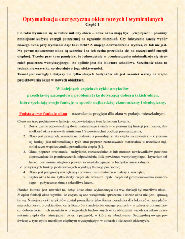 Optymalizacja energetyczna okien nowych i wymienianych Część 1 Co roku wymienia się w Polsce miliony okien – nowe okna mają być „cieplejsze” i powinny zmniejszać zużycie energii potrzebnej na ogrzanie mieszkań. Czy faktycznie każdy wybór nowego okna przy wymianie daje taki efekt? Z mojego doświadczenia wynika, że tak nie jest. Na pewno nowoczesne okna są szczelne i ta ich cecha przekłada się na oszczędność energii cieplnej. Trzeba przy tym pamiętać, że jednocześnie w pomieszczeniu minimalizuje się strumień powietrza wentylacyjnego, co ogólnie jest dla lokatora szkodliwe. Szczelność okna to jednak nie wszystko, co decyduje o jego efektywności. Temat jest rozległy i dotyczy nie tylko starych budynków ale jest również ważny na etapie projektowania okien w nowych obiektach. W kolejnych częściach cyklu artykułów przedstawię szczegółową problematykę dotyczącą doboru takich okien, które spełniają swoje funkcje w sposób najbardziej ekonomiczny i ekologiczny. Podstawowe funkcje okna - rozważania przyjęto dla okna w pokoju mieszkalnym. Okno ma trzy podstawowe funkcje i odpowiadające tym funkcjom kryteria: 1. Dostarczenie odpowiedniej ilości naturalnego światła – kryterium tej funkcji jest norma, aby wielkość okna stanowiła minimum 1/8 powierzchni podłogi pomieszczenia, 2. Okno jest przegrodą zewnętrzną budynku i powoduje straty ciepła na zewnątrz – kryterium tej funkcji jest minimalizacja tych strat poprzez zastosowanie materiałów o możliwie najmniejszym współczynniku przenikania ciepła [U], 3. Okno poprzez otwieranie, uchylanie, rozszczelnianie lub montaż nawiewników powinno doprowadzać do pomieszczenia odpowiednią ilość powietrza wentylacyjnego, kryterium tej funkcji jest norma objętości powietrza wentylacyjnego w budynku mieszkalnym. Z powyższych funkcji podstawowych wynikają funkcje pochodne; 4. Okno jest przegrodą zewnętrzną i powinno minimalizować hałasy z zewnątrz, 5. Szyba okna to nie tylko straty ciepła ale również zyski ciepła od promieniowania słonecznego – pożyteczne zimą a szkodliwe latem. Bardzo istotne jest również to, żeby koszt okna wykonanego dla ww. funkcji był możliwie niski. Z opisu funkcji okna wynika, że często są one wzajemnie sprzeczne i dobór okna nie jest sprawą łatwą. Niniejszy cykl artykułów został pomyślany jako forma poradnika dla lokatorów, zarządców nieruchomości, projektantów, certyfikatorów i audytorów energetycznych - w zakresie optymalizacji doboru okien i ich montażu w przegrodach budowlanych oraz obliczenia współczynników przenikania ciepła dla istniejących okien i przegród, w które są wbudowane. Szczególną uwagę poświęcę w tym cyklu mostkom cieplnym występującym w oknach i ościeżach okiennych. Współczynnik przenikania ciepła okna – Uw Na początek przeprowadźmy takie optymalizacje okien, które pozwolą na uzyskanie najlepszego współczynnika przenikania ciepła jak najmniejszym kosztem. Projektując okno, należy pamiętać, że jego konstrukcja wpływa nie tylko na walory estetyczne budynku i ilość światła, jaka dostaje się do wnętrza domu. W istotny sposób decyduje również o przenikaniu i stratach ciepła. Izolacyjność cieplną okien określa się za pomocą współczynnika przenikania ciepła U, który wyraża się w jednostkach W(m2 * K) i definiuje się jako ilość ciepła przenikającą w ciągu 1 godziny przez 1m2 płaskiej przegrody przy różnicy temperatury powietrza po obu jej stronach wynoszącej 1K (1°C). Jednoznacznie należy stwierdzić, że im mniejsza wartość U, tym większa izolacyjność termiczna okna. Producenci okien i projektanci aż do 2007 roku, kiedy wydano PN-EN ISO 10077-1:2007 „Cieplne właściwości użytkowe okien, drzwi i żaluzji - Obliczanie współczynnika przenikania ciepła”, przyjmowali, że współczynnik przenikania ciepła okna to współczynnik szyby - to był błąd. Niestety, pojawia się również obecnie w zestawieniach stolarki okiennej, stanowiących załącznik do projektu budynku. Wprawdzie to właśnie izolacyjność termiczna szyby w dużej mierze wpływa na to, czy okno możemy określić jako „ciepłe”, czy też nie, jednak parametrem stanowiącym podstawę do ocen i porównań powinien być tylko współczynnik Uw. Dlatego też nawet w obrębie jednego budynku, w którym zaprojektowane zostały okna o takich samych parametrach cieplnych szyb, każde z okien może mieć zupełnie inny współczynnik przenikania ciepła. Według obowiązującej aktualnie normy PN-EN ISO 10077-1:2007 - obliczanie współczynnika przenikania ciepła wykonuję się według poniższego wzoru. [1] Gdzie: Uw (window) - średni współczynnik przenikania ciepła okna [W/(m² * K)] Uf (frame) - współczynnik przenikania ciepła ramy, [W/(m² * K)] Ug (glass) - średni współczynnik przenikania ciepła szyby, [W/(m² * K)] Ψg - liniowy współczynnik przenikania ciepła mostka na styku szyby z ramą okna, [W/(m * K)] Af (frame) - pole powierzchni ramy o współczynniku Uf, [m²] Ag (glass)– pole powierzchni szyby, [m²] lg - długość liniowego mostka cieplnego na styku szyby z ramą, [m] A = Ag + Aw - powierzchnia całkowita okna, [m²] Na zdjęciu pokazano układ okien po ich wymianie z drewnianych na PCV w typowym wielorodzinnym budynku mieszkalnym. Pierwotnie zgodnie z projektem był to zestaw 3 typowych okien; O36 (1765x1435mm) + O35 (1465x1435mm) + OB5 (865x2195mm). Jak widać, po wymianie, na każdej kondygnacji występują różne okna, co świadczy o braku jakiejkolwiek organizacji tej wymiany, każdy lokator wstawił okna według własnego gustu. Na 3 i 5 kondygnacji zachowano pierwotny podział okien według projektu, co można uznać za zasadne z powodów architektonicznych, na kondygnacjach 2 i 4 jest to podział zbliżony do projektu, na 1 i 6 kondygnacji podział jest całkowicie odmienny. W tym przypadku do analizy wybrałem okna na 1 