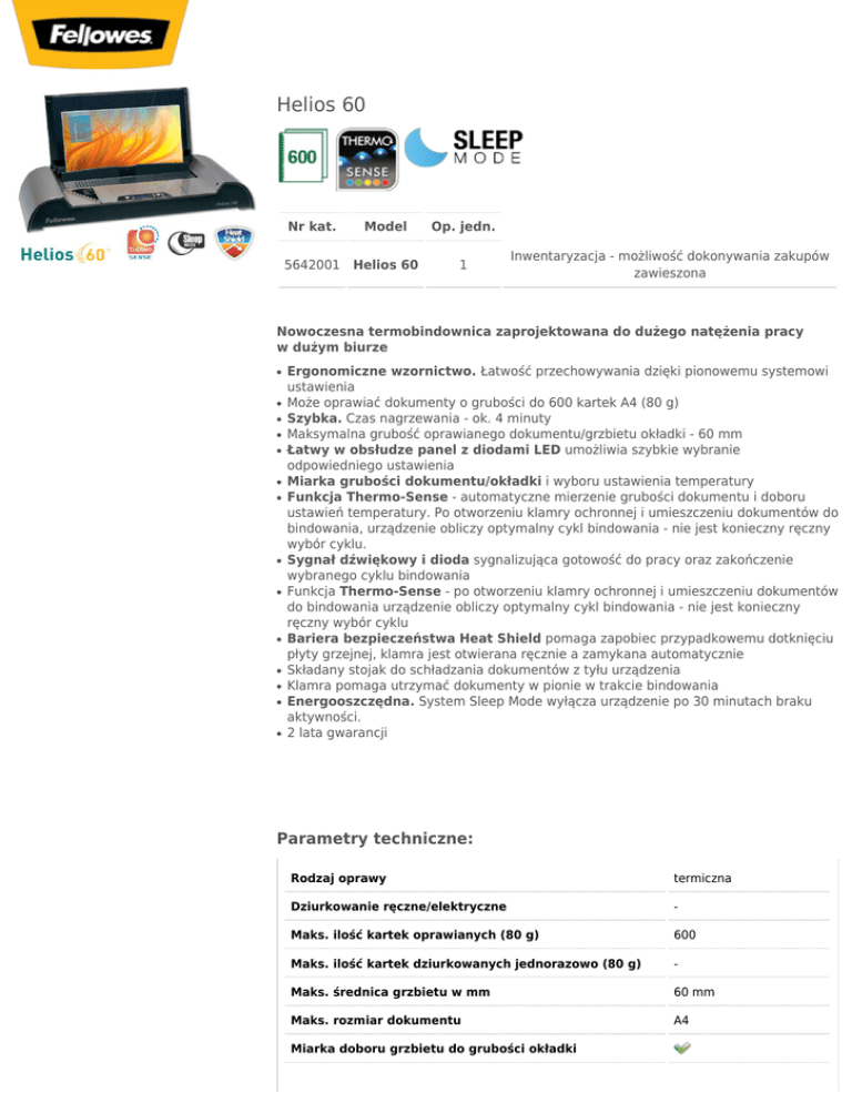 Helios 60 Nr kat. Model 5642001 Helios 60 Op. jedn. 1 Inwentaryzacja - możliwość dokonywania zakupów zawieszona Nowoczesna termobindownica zaprojektowana do dużego natężenia pracy w dużym biurze ● ● ● ● ● ● ● ● ● ● ● ● ● ● Ergonomiczne wzornictwo. Łatwość przechowywania dzięki pionowemu systemowi ustawienia Może oprawiać dokumenty o grubości do 600 kartek A4 (80 g) Szybka. Czas nagrzewania - ok. 4 minuty Maksymalna grubość oprawianego dokumentu/grzbietu okładki - 60 mm Łatwy w obsłudze panel z diodami LED umożliwia szybkie wybranie odpowiedniego ustawienia Miarka grubości dokumentu/okładki i wyboru ustawienia temperatury Funkcja Thermo-Sense - automatyczne mierzenie grubości dokumentu i doboru ustawień temperatury. Po otworzeniu klamry ochronnej i umieszczeniu dokumentów do bindowania, urządzenie obliczy optymalny cykl bindowania - nie jest konieczny ręczny wybór cyklu. Sygnał dźwiękowy i dioda sygnalizująca gotowość do pracy oraz zakończenie wybranego cyklu bindowania Funkcja Thermo-Sense - po otworzeniu klamry ochronnej i umieszczeniu dokumentów do bindowania urządzenie obliczy optymalny cykl bindowania - nie jest konieczny ręczny wybór cyklu Bariera bezpieczeństwa Heat Shield pomaga zapobiec przypadkowemu dotknięciu płyty grzejnej, klamra jest otwierana ręcznie a zamykana automatycznie Składany stojak do schładzania dokumentów z tyłu urządzenia Klamra pomaga utrzymać dokumenty w pionie w trakcie bindowania Energooszczędna. System Sleep Mode wyłącza urządzenie po 30 minutach braku aktywności. 2 lata gwarancji Parametry techniczne: Rodzaj oprawy termiczna Dziurkowanie ręczne/elektryczne - Maks. ilość kartek oprawianych (80 g) 600 Maks. ilość kartek dziurkowanych jednorazowo (80 g) - Maks. średnica grzbietu w mm 60 mm Maks. rozmiar dokumentu A4 Miarka doboru grzbietu do grubości okładki Pionowy system dziurkowania/włożenia dokumentu Dżwignia dziurkująca - Przechowywanie w pionie Czas nagrzewania w min. 4 Klamra bezpieczeństwa Heat Shield Automatyczne wyłączenie, gdy urządzenie nie jest używane Funkcja automatycznego optymalnego wyboru cyklu oprawy - Thermo-Sense Wybór różnych cykli oprawy Podstawka do schładzania dokumentów Jednoczesne bindowanie kilku dokumentów Gwarancja na urządzenie w latach 2 Wymiary urządzenia w mm 92x518x258 Waga urządzenia w kg 2,82 Nr kat. 5642001 Maks. ilość kartek oprawianych (80 g) 600 Miejsce użytkowania Biuro Sygnał gotowości do pracy - dioda i sygnał dźwiękowy
