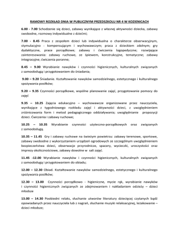 RAMOWY ROZKŁAD DNIA W PUBLICZNYM PRZEDSZKOLU NR 4 W KOZIENICACH 6.00 - 7.00 Schodzenie się dzieci, zabawy wynikające z własnej aktywności dziecka, zabawy swobodne, rozmowy indywidualne z dziećmi; 7.00 - 8.45 Praca z zespołem dzieci lub indywidualna o charakterze obserwacyjnym, stymulacyjno - kompensującym i wychowawczym; praca z dzieckiem zdolnym; gry dydaktyczne, prace porządkowe; zabawy i ćwiczenia logopedyczne; rozwijające zainteresowania: zabawy ruchowe, ze śpiewem, konstrukcyjne, tematyczne; zabawy integracyjne; ćwiczenia poranne; 8.45 – 9.00 Wyrabianie nawyków i czynności higienicznych, kulturalnych związanych z samoobsługą i przygotowaniem do śniadania; 9.00 – 9.20 Śniadanie. Kształtowanie nawyków samodzielnego, estetycznego i kulturalnego spożywania posiłków; 9.20 – 9.35 Czynności porządkowe, wspólne planowanie zajęć, przygotowanie pomocy do zajęć 9.35 – 10.25 Zajęcia edukacyjno – wychowawcze organizowane przez nauczyciela, wynikające z tygodniowego rozkładu zajęć i aktywności dzieci, z uwzględnieniem zróżnicowania form i metod pedagogicznego oddziaływania; uwzględnianie propozycji dzieci. Ćwiczenia i zabawy ruchowe; 10.25 – 10.35 z samoobsługą. Wyrabianie czynności użyteczno-porządkowych oraz związanych 10.35 – 11.45 Gry i zabawy ruchowe na świeżym powietrzu: zabawy terenowe, sportowe, zabawy swobodne z wykorzystaniem urządzeń ogrodowych ze szczególnym uwzględnieniem bezpieczeństwa dzieci, obserwacje przyrodnicze, spacery, wycieczki, uroczystości oraz imprezy okolicznościowe, zabawy dowolne w sali zajęć. 11.45 -12.00 Wyrabianie nawyków i czynności higienicznych, kulturalnych związanych z samoobsługą i przygotowaniem do obiadu; 12.00 – 12.30 Obiad. Kształtowanie nawyków samodzielnego, estetycznego i kulturalnego spożywania posiłków; 12.30 – 13.00 Czynności porządkowo - higieniczne, mycie rąk, wyrabianie nawyków i czynności higienicznych związanych ze zdejmowaniem i nakładaniem odzieży – dzieci młodsze 13.00 – 14.30 Poobiedni relaks, słuchanie utworów literatury dziecięcej czytanych bądź opowiadanych przez nauczyciela lub z nagrań, słuchanie muzyki relaksacyjnej, leżakowanie – dzieci młodsze; 13.00 – 14.30 Zabawy i ćwiczenia uwzględniające zainteresowania dzieci, oddziaływanie nauczycieli wyzwalające samorzutną aktywność dzieci, wspierające indywidualny rozwój i uzdolnienia dzieci, słuchanie opowiadań nauczyciela na podstawie literatury dziecięcej lub czytanych fragmentów książek, zabawy i gry dydaktyczne, graficzne, majsterkowanie, zabawy i gry językowe, zajęcia w małych zespołach; pobyt na świeżym powietrzu; 14.30 – 14.45 Czynności samoobsługowe porządkowe i higieniczne; przygotowanie do podwieczorku; 14.45 – 15.00 Podwieczorek Kształtowanie nawyków samodzielnego, estetycznego i kulturalnego spożywania posiłków; 15.00 – 17.00 Zabawy swobodne w kącikach zainteresowań, zabawy integracyjne, tematyczne, zajęcia w małych zespołach; zajęcia o charakterze wychowawczym; obserwacje pedagogiczne, pobyt na świeżym powietrzu, prace porządkowe, rozchodzenie się dzieci.