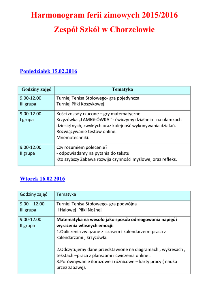 Harmonogram ferii zimowych 2015/2016 Zespół Szkół w Chorzelowie Poniedziałek 15.02.2016 Godziny zajęć Tematyka 9.00-12.00 III grupa Turniej Tenisa Stołowego- gra pojedyncza Turniej Piłki Koszykowej 9.00-12.00 I grupa Kości zostały rzucone – gry matematyczne. Krzyżówka „ŁAMIGŁÓWKA ”- ćwiczymy działania na ułamkach dziesiętnych, zwykłych oraz kolejność wykonywania działań. Rozwiązywanie testów online. Mnemotechniki. 9.00-12:00 II grupa Czy rozumiem polecenie? - odpowiadamy na pytania do tekstu Kto szybszy Zabawa rozwija czynności myślowe, oraz refleks. Wtorek 16.02.2016 Godziny zajęć Tematyka 9.00 – 12.00 III grupa Turniej Tenisa Stołowego- gra podwójna i Halowej Piłki Nożnej 9.00-12.00 II grupa Matematyka na wesoło jako sposób odreagowania napięć i wyrażenia własnych emocji: 1.Obliczenia związane z czasem i kalendarzem- praca z kalendarzami , krzyżówki. 2.Odczytujemy dane przedstawione na diagramach , wykresach , tekstach –praca z planszami i ćwiczenia online . 3.Porównywanie ilorazowe i różnicowe – karty pracy ( nauka przez zabawę). 9:00-12:00 I grupa Gra w słówka rozwijanie pomysłowości uczniów. - Gromadzimy słownictwo, poznajemy formę, piszemy spójnie, logicznie, na temat ( opowiadanie: odtwórcze, twórcze; opis: przedmiotu, postaci itp.; list; kartka ; zaproszenie; ogłoszenie ) - Przypomnienie podstawowych zasad ortograficznych. - Utrwalenie pisowni – krzyżówki, rebusy z wykorzystaniem ortogramów itp. - Praca ze słownikiem ortograficznym. Środa 17.02.2016 Godziny zajęć 9.00 – 12.00 Tematyka Wszyscy grają w siatkówkę-mini siatkówka na wesoło . III grupa 9.00-12.00 I grupa 9.00-12.00 II grupa Orzeł czy reszka – zabawa ćwicząca działania na liczbach ujemnych. 1.Własności trójkątów i czworokątów-ćwiczenia z zastosowaniem platformy edukacyjnej e-nauczyciel. 2.Obliczanie pól i obwodów trójkątów i czworokątów- ćwiczenia z zastosowaniem platformy edukacyjnej e-nauczyciel. 3. Rozwiązanie zadań w kontekście- ćwiczenia z zastosowaniem platformy edukacyjnej e-nauczyciel. Doskonała pamięć –zabawa utrwalająca przymiotniki. Omówienie znaków przestankowych, ich roli; podstawowych zasad interpunkcji. Czwartek 18.02.2016 Godziny zajęć Tematyka 9.00 – 12.00 Szkolny Turniej w unihokeja. Gry i zabawy na wesoło. 9.00-12.00 Gry i zabawy matematyczne. Geometryczna podróż, Geometryczny Piotruś I, II, III (3h) II grupa 9.00-12.00 I grupa Mistrz gramatyki. - Czasownik (odmiana, budowa) i rzeczownik. - Podmiot i orzeczenie. - Zdanie pojedyncze i złożone. Piątek 19.02.2016 Godziny zajęć Tematyka 9.00 – 12.00 Turniej piłki ręcznej – Szkoła Podstawowa i Gimnazjum . III grupa 9.00-12.00 II grupa Piłka w ruchu - liczymy rytmicznie. Szukamy par - działania arytmetyczne. Złamać kod ułamka. Układanki tangramowe „ origami ” 9.00-12.00 Jakim jestem uczniem ? –utrwalenie przymiotnika. I grupa Organizatorzy: P. Mariusz Woźniak P. Bernadeta Łaz P. Elżbieta Babula