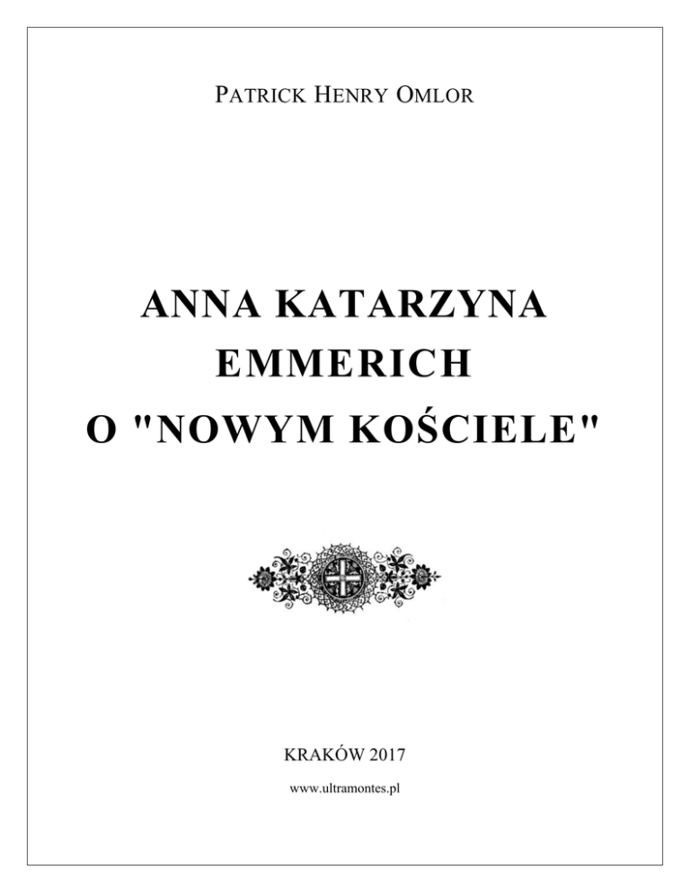 PATRICK HENRY OMLOR ANNA KATARZYNA EMMERICH O "NOWYM KOŚCIELE" KRAKÓW 2017 www.ultramontes.pl Anna Katarzyna Emmerich o "nowym kościele" (1) PATRICK HENRY OMLOR Anna Katarzyna Emmerich (1774-1824), świętobliwa niemiecka mistyczka, miała wizje i mistyczne doznania, w których widziała narodziny tego co nazywa "mrocznym kościołem" oraz "czarnym, fałszerskim kościołem". Słowo fałszerski przywodzi na myśl coś więcej niż samo pojęcie fałszu (zawsze istniały fałszywe kościoły i fałszywe formy kultu); fałszerski sugeruje zamiar podawania się za autentyk, oryginał, oraz intencję imitowania rzeczy prawdziwej. Nie rościmy sobie pretensji do posiadania zdolności interpretowania proroctwa z całkowitą trafnością, ani też nigdy nie opieraliśmy na proroctwach naszej argumentacji i sposobu przedstawiania poszczególnych zagadnień. Tym bardziej nie zamierzamy teraz "stwarzać precedensu" opartego na wizjach Anny Katarzyny Emmerich, gdyż próba zinterpretowania proroctwa zawsze wiąże się z ryzykiem całkowicie błędnego odczytania jego rzeczywistego znaczenia. Lecz z pewnością wolno nam zastanowić się czy siostra Emmerich przeczuwała powstanie współczesnego, ekumenicznego kościoła. Poniższe fragmenty pochodzą z drugiego tomu "Żywota Anny Katarzyny Emmerich" (The Life of Anne Catherine Emmerich) autorstwa wielebnego ojca C. E. Schmögera CSsR, który po raz pierwszy pojawił się w druku w 1867 roku. "Zobaczyłam dziwaczny, osobliwie wyglądający kościół będący w trakcie budowy. (...) Nie widziałam żadnego anioła pomagającego w budowie, lecz wielką liczbę najdzikszych duchów taszczących ku sklepieniu przedmioty najprzeróżniejszego rodzaju, gdzie osoby o krótkich kościelnych okryciach odbierały je i umieszczały w różnych miejscach. Nic nie było przyniesione z góry; wszystko pochodziło z ziemi i mrocznych rejonów, a cała konstrukcja była dziełem błędnych duchów. (...) Spostrzegłam, że wiele z narzędzi nowego kościoła, takich jak włócznie i strzały, miało zostać użyte przeciwko żywemu Kościołowi. (...) W jaskini poniżej (zakrystii) jacyś ludzie wyrabiali chleb, ale nic z tego nie wychodziło. (...) Wszystko w tym kościele należało do ziemi i do niej powracało; wszystko było martwe, wszystko było dziełem ludzkich umiejętności, był to kościół najnowszego formatu, kościół będący dziełem ludzkiej pomysłowości, j a k b y n o w y i n n o w i e r c z y k o ś c i ó ł w R z y m i e " (ss. 282-283). 2 "Boję się, że Ojciec Święty będzie musiał wiele wycierpieć przed śmiercią, ponieważ widzę jak czarny, fałszerski, nieprawdziwy kościół odnosi coraz większe powodzenie, widzę jego zgubny wpływ na społeczeństwo" (s. 292). "Wybudowali wielki, osobliwy, kuriozalny kościół, który miał obejmować wszystkie wyznania na równych prawach: ewangelicy, katolicy i wszystkie sekty – prawdziwa wspólnota bezbożników z jednym pasterzem i jedną owczarnią. Miał tam być papież, płatny papież, pozbawiony wszelkiej władzy. Wszystko zostało przygotowane, wiele rzeczy ukończono; lecz zamiast ołtarza były tylko ohyda i spustoszenie. Tak miał wyglądać ten nowy kościół, i to dlatego podłożył on ogień pod stary; jednakże Bóg zamierzył inaczej. Umarł on po spowiedzi i zadośćuczynieniu – i ożył na nowo" (s. 353). "Kiedy doświadczałam tej wizji wówczas z jeszcze większą wyrazistością w najmniejszych szczegółach zobaczyłam ponownie obecnego Papieża i mroczny kościół jego czasów w Rzymie" (s. 279). "Widziałam zgubne konsekwencje tego fałszywego kościoła; zobaczyłam, jak się rozrasta; widziałam heretyków wszelkiego rodzaju napływających do Rzymu. Widziałam nieustannie narastającą letniość duchowieństwa, ciągle poszerzający się krąg ciemności. (...) Znowu zobaczyłam w widzeniu Bazylikę Św. Piotra podkopywaną, pustoszoną według planu wymyślonego przez tajną sektę i jednocześnie niszczoną przez burze; lecz została ocalona w chwili największego niebezpieczeństwa. Następnie ujrzałam Błogosławioną Dziewicę rozciągającą nad nią swój płaszcz. W tej ostatniej scenie nie widziałam już panującego Papieża, tylko jednego z jego następców, łagodnego, lecz bardzo stanowczego człowieka, który wiedział jak przyciągnąć do siebie kapłanów i który odpędził złych daleko od siebie" (s. 281). "Ujrzałam jak w Niemczech pośród duchownych kierujących się światową mądrością i oświeconych protestantów tworzą się plany połączenia wyznań religijnych, zniesienia władzy papieskiej..." (s. 346). "Zobaczyłam tajne stowarzyszenie podkopujące wielki kościół (św. Piotra), a w pobliżu nich straszną bestię wyłaniającą się z morza" (s. 290). "Widziałam w ostatnich dniach zdumiewające rzeczy związane z Kościołem. Bazylika Św. Piotra była niemal doszczętnie zniszczona przez sektę, lecz jej działania, z kolei, okazywały się bezowocne, a wszystko co należało do nich, ich fartuszki i narzędzia, palone przez katów na publicznym miejscu hańby. (...) W tym widzeniu ujrzałam Matkę Bożą 3 gorliwie działającą na rzecz Kościoła, że moje nabożeństwo do Niej niezwykle się wzmogło" (s. 292). "Chcą wprowadzić na urzędy złych biskupów. Na tym samym miejscu chcą przekształcić katolicki Kościół w luterański zbór" (s. 299). "Kiedy ujrzałam Bazylikę Św. Piotra w stanie ruiny i tylu duchownych uwijających się, potajemnie, nad zniszczeniem Kościoła, byłam tak załamana, że bardzo płakałam błagając żarliwie Jezusa o zmiłowanie" (s. 300). "Widzę małego czarnego człowieka jak we własnym kraju popełnia wiele kradzieży i nagminnie dopuszcza się fałszerstw. Religia jest tam tak przebiegle podkopywana i tłamszona, iż pozostało zaledwie stu wiernych kapłanów. Nie potrafię tego wyrazić, ale widzę narastającą mgłę i wzmagającą się ciemność. (...) 
