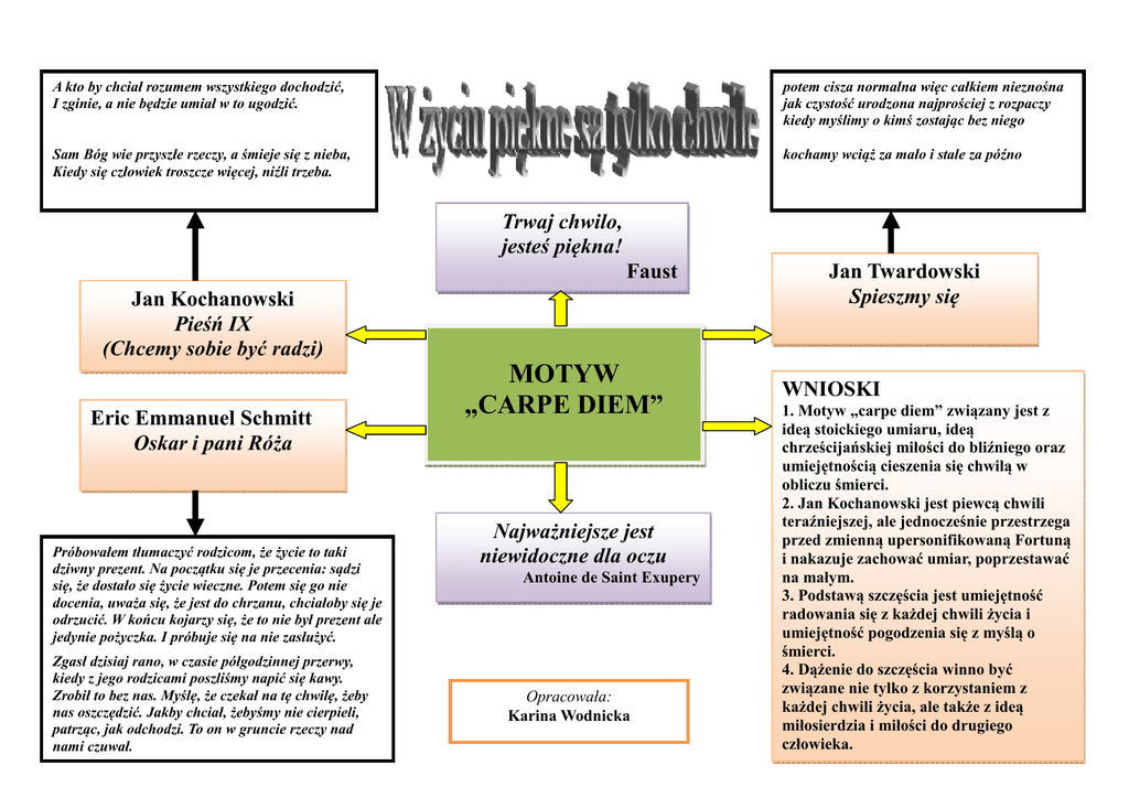 A kto by chciał rozumem wszystkiego dochodzić, I zginie, a nie będzie umiał w to ugodzić. potem cisza normalna więc całkiem nieznośna jak czystość urodzona najprościej z rozpaczy kiedy myślimy o kimś zostając bez niego Sam Bóg wie przyszłe rzeczy, a śmieje się z nieba, Kiedy się człowiek troszcze więcej, niźli trzeba. kochamy wciąż za mało i stale za późno Trwaj chwilo, jesteś piękna! Faust Jan Kochanowski Pieśń IX (Chcemy sobie być radzi) Eric Emmanuel Schmitt Oskar i pani Róża Próbowałem tłumaczyć rodzicom, że życie to taki dziwny prezent. Na początku się je przecenia: sądzi się, że dostało się życie wieczne. Potem się go nie docenia, uważa się, że jest do chrzanu, chciałoby się je odrzucić. W końcu kojarzy się, że to nie był prezent ale jedynie pożyczka. I próbuje się na nie zasłużyć. Zgasł dzisiaj rano, w czasie półgodzinnej przerwy, kiedy z jego rodzicami poszliśmy napić się kawy. Zrobił to bez nas. Myślę, że czekał na tę chwilę, żeby nas oszczędzić. Jakby chciał, żebyśmy nie cierpieli, patrząc, jak odchodzi. To on w gruncie rzeczy nad nami czuwał. MOTYW „CARPE DIEM” Najważniejsze jest niewidoczne dla oczu Antoine de Saint Exupery Opracowała: Karina Wodnicka Jan Twardowski Spieszmy się WNIOSKI 1. Motyw „carpe diem” związany jest z ideą stoickiego umiaru, ideą chrześcijańskiej miłości do bliźniego oraz umiejętnością cieszenia się chwilą w obliczu śmierci. 2. Jan Kochanowski jest piewcą chwili teraźniejszej, ale jednocześnie przestrzega przed zmienną upersonifikowaną Fortuną i nakazuje zachować umiar, poprzestawać na małym. 3. Podstawą szczęścia jest umiejętność radowania się z każdej chwili życia i umiejętność pogodzenia się z myślą o śmierci. 4. Dążenie do szczęścia winno być związane nie tylko z korzystaniem z każdej chwili życia, ale także z ideą miłosierdzia i miłości do drugiego człowieka.