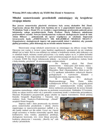 Wiosną 2015 roku odbyły się XXIII Dni Ziemi w Sosnowcu Młodzi sosnowiczanie prześledzili zmieniający się krajobraz swojego miasta Raz jeszcze sosnowieckie placówki oświatowe były areną obchodów Dni Ziemi. Tegoroczna edycja Dni Ziemi była bardziej niż te w poprzednich latach związana z Wydziałem Nauk o Ziemi UŚ, co wynikło z zapowiadanego przekazania pałeczki przez inicjatorkę całego przedsięwzięcia Panią Profesor Marię Pulinową młodszemu pracownikowi uczelni. Nowym koordynatorem wydarzeń ekologicznych został dr hab. Adam Hibszer – pełnomocnik do spraw współpracy ze szkołami. Imprezom towarzyszyło hasło „ZMIENIAJĄCY SIĘ KRAJOBRAZ MOJEGO MIASTA”. Organizatorzy ekologicznych imprez tak poprowadzili dzieci i młodzież, aby poznała głębiej przemiany, jakie dokonują się na terenie miasta Sosnowca. Skierowanie uwagi młodych sosnowiczan na zmieniające się oblicze swojej Małej Ojczyzny jest ważne w świecie coraz bardziej zagubionych, spieszących się nie wiadomo dokąd i po co ludzi. Był to czas refleksji czy zmiany w krajobrazie miasta, jakie dokonuj a się w ostatnich latach, możemy ocenić pozytywnie i czy mamy wpływ na to, w jakim kierunku one podążają. W tym roku mieszkańców i gości przemieszczających się po terenie Sosnowca o trwaniu XXIII Dni Ziemi informowały plakaty , na których symboliczny zielony listek z kulą ziemską „przyleciał” do nowoczesnego centrum miasta. Do bieżącej edycji Dni Ziemi postanowiono – tradycyjnie pod koniec marca włączyć Międzynarodową Wystawę i Giełdę Minerałów, Skał i Skamieniałości. Było to już 55te (!!!) spotkanie miłośników ciekawych okazów geologicznych i wytwórców biżuterii z mieszkańcami miasta, regionu i dalej. W kwietniu, w okolicach Międzynarodowego Dnia Ziemi, kilku wykładowców WNoZ – w „Noc z geografią przed maturą” – systematyzowało wiedzę uczniów, którzy niebawem przystępowali do nowej formuły egzaminu maturalnego, odtąd wyłącznie na poziomie rozszerzonym. Dokładnie 22 kwietnia, kiedy na całym świecie mówi się o potrzebie wzmożonej troski o środowisko przyrodnicze, Muzeum Wydziałowe przyjmowało grupy szkolne na zajęcia warsztatowe. Dzień później Katedra Geografii Regionalnej i Turyzmu oraz studenci Koła Naukowo-Podróżniczego „Denali” urządzili Dzień Geografa. Imprezy małe i duże przetoczyły się również przez sosnowieckie przedszkola i szkoły. Znowu organizujący je nauczyciele-pasjonaci zadbali o to, aby każdy znalazł coś dla siebie. Uczyć się i bawić mogli uczestnicy w bardzo różnorodny sposób. Były konkursowe testy wiedzy, pojedyncze prelekcje, ekologiczne korowody, tzw. żywe lekcje przyrody, konkursy plastyczne i warsztaty. „Bawiły się” całe szkoły i przedszkola. W tym przekazie najwięcej uwagi warto poświęcić najmłodszym uczestnikom sosnowieckich Dni Ziemi. Bo właśnie w takiej formie przedszkolacy przeżywają czasami swoje pierwsze ukierunkowane na zabawę ale i też na naukę spotkania z przyrodą i ekologią. Adresatami i uczestnikami XXIII Dni Ziemi byli także uczniowie sosnowieckich szkół. Wspaniałe imprezy miały miejsce co najmniej w 12 szkołach. Wśród działań zgłoszonych do koordynatora było kilka szkół podstawowych (m.in. SP 8, 20, 21, 23, 40 i 46), kilka gimnazjów (Gim 2, 6, 15) oraz szkoły ponadgimnazjalne (CKZiU, licea im. B. Prusa i im. St. Staszica). Zatrzymajmy się przy wybranych imprezach. PRZEDSZKOLA Tradycją jest już to, że uczestnikami imprez przedszkolnych są dzieci z placówek zaprzyjaźnionych, niekoniecznie sąsiednich. W niektórych sosnowieckich przedszkolach działa grono niezwykle aktywnych nauczycielek, które realizują elementy autorskich programów ukierunkowanych na troskę o środowisko naturalne naszego miasta i regionu. W kolejne kwietniowe dni w przedszkolach trwała szczególna zabawa, wzmocniona udziałem całego personelu, słychać było śpiewy, radosne rozwiązywanie zagadek, krzyżówek, rebusów. Tak rozbudza się u najmłodszych troskę o przyszły stan naszego otoczenia. Tak uczy się ekologicznych zachowań. W przedszkolu „na Juliuszu” (PM 34) kol. Bożena Gajdzik od 15 lat koordynuje mityngi ekologiczne przypadające na czas trwania DZ. Również i w tym roku przedszkolaki z 4 placówek drużynowo rozwiązywały przyrodnicze zagadki związane z zielonym krajobrazem swojego otoczenia, bowiem PM 34 dosłownie sąsiaduje z lasem. Zachętą do wyjścia w las był – jak co roku - autorski wiersz koleżanki: - Miasto nasze ukochane z krajobrazów jest utkane... Zajęcia współprowadził leśniczy. Dodatkowo były zabawy ruchowe, kalkowanie kory aby umieć potem rozpoznawać drzewa (umiejętność przydatna na całe życie!). Dla kol. Gajdzik widok zaangażowanych i rozentuzjazmowanych dzieci, które pod koniec mityngu otrzymują medal „Tropiciela przyrody w lesie”, to bodziec do organizowania takich imprez w następnych latach. W „Wizji” przedszkola przy Gwiezdnej (PM 40) zapisano m.in. że W tym przedszkolu dziecko poznaje przyrodę, uczy się obcować z nią, aby od najmłodszych lat dbać o nią. I tak rzeczywiście jest, czemu przewodzi umiejąca doskonale wydobyć możliwości twórcze dzieci kol. Izabella Rejzowicz wraz z zespołem. Było to zabawowe „Odkrywanie przyrody Sosnowca” Miał również miejsce konkurs plastyczny pt. „Przyroda Sosnowca wiosną”. W Przedszkolu Miejskim Nr 45 kolejny raz trzy niestrudzone nauczycielki tej placówki: Beata Witko, Katarzyna Nizioł i Ewa Fudała-Łabuś ogłosiły Ogólnopolski Konkurs Plastyczny „W krainie dinozaurów”. Nadesłano ponad dwieście prac z różnych zakątków Polski. Zwyciężyła praca chłopca z niewielkiego Stąporkowa. Tradycją – prawie wyłącznie w tym przedszkolu – są podczas Dni Ziemi wspólne warsztaty dzieci i ich rodziców. W największej sali budynku przedszkola na Środuli (PM 51) dzieci z 4 różnych p