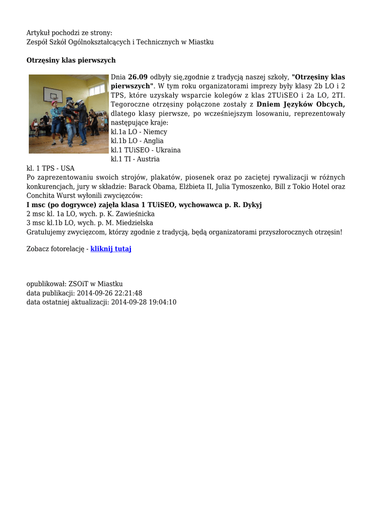 Artykuł pochodzi ze strony: Zespół Szkół Ogólnokształcących i Technicznych w Miastku Otrzęsiny klas pierwszych Dnia 26.09 odbyły się,zgodnie z tradycją naszej szkoły, "Otrzęsiny klas pierwszych". W tym roku organizatorami imprezy były klasy 2b LO i 2 TPS, które uzyskały wsparcie kolegów z klas 2TUiSEO i 2a LO, 2TI. Tegoroczne otrzęsiny połączone zostały z Dniem Języków Obcych, dlatego klasy pierwsze, po wcześniejszym losowaniu, reprezentowały następujące kraje: kl.1a LO - Niemcy kl.1b LO - Anglia kl.1 TUiSEO - Ukraina kl.1 TI - Austria kl. 1 TPS - USA Po zaprezentowaniu swoich strojów, plakatów, piosenek oraz po zaciętej rywalizacji w różnych konkurencjach, jury w składzie: Barack Obama, Elżbieta II, Julia Tymoszenko, Bill z Tokio Hotel oraz Conchita Wurst wyłonili zwycięzców: I msc (po dogrywce) zajęła klasa 1 TUiSEO, wychowawca p. R. Dykyj 2 msc kl. 1a LO, wych. p. K. Zawieśnicka 3 msc kl.1b LO, wych. p. M. Miedzielska Gratulujemy zwycięzcom, którzy zgodnie z tradycją, będą organizatorami przyszłorocznych otrzęsin! Zobacz fotorelację - kliknij tutaj opublikował: ZSOiT w Miastku data publikacji: 2014-09-26 22:21:48 data ostatniej aktualizacji: 2014-09-28 19:04:10