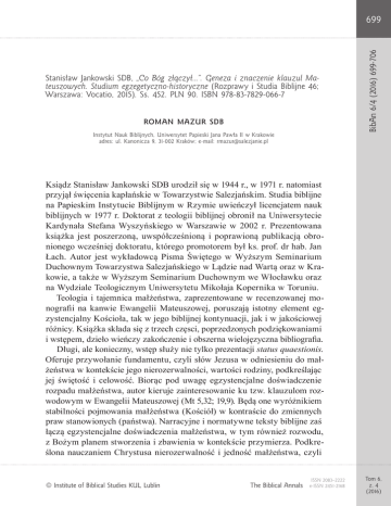 Stanisław Jankowski SDB, „Co Bóg złączył...”. Geneza i znaczenie klauzul Mateuszowych. Studium egzegetyczno-historyczne (Rozprawy i Studia Biblijne 46; Warszawa: Vocatio, 2015). Ss. 452. PLN 90. ISBN 978-83-7829-066-7 ROMAN MAZUR SDB Instytut Nauk Biblijnych, Uniwersytet Papieski Jana Pawła II w Krakowie adres: ul. Kanonicza 9, 31-002 Kraków; e-mail: [email protected] BibAn 6/4 (2016) 699-706 699 Ksiądz Stanisław Jankowski SDB urodził się w 1944 r., w 1971 r. natomiast przyjął święcenia kapłańskie w Towarzystwie Salezjańskim. Studia biblijne na Papieskim Instytucie Biblijnym w Rzymie uwieńczył licencjatem nauk biblijnych w 1977 r. Doktorat z teologii biblijnej obronił na Uniwersytecie Kardynała Stefana Wyszyńskiego w Warszawie w 2002 r. Prezentowana książka jest poszerzoną, uwspółcześnioną i poprawioną publikacją obronionego wcześniej doktoratu, którego promotorem był ks. prof. dr hab. Jan Łach. Autor jest wykładowcą Pisma Świętego w Wyższym Seminarium Duchownym Towarzystwa Salezjańskiego w Lądzie nad Wartą oraz w Krakowie, a także w Wyższym Seminarium Duchownym we Włocławku oraz na Wydziale Teologicznym Uniwersytetu Mikołaja Kopernika w Toruniu. Teologia i tajemnica małżeństwa, zaprezentowane w recenzowanej monografii na kanwie Ewangelii Mateuszowej, poruszają istotny element egzystencjalny Kościoła, tak w jego biblijnej kontynuacji, jak i w jakościowej różnicy. Książka składa się z trzech częsci, poprzedzonych podziękowaniami i wstępem, dzieło wieńczy zakończenie i obszerna wielojęzyczna bibliografia. Długi, ale konieczny, wstęp służy nie tylko prezentacji status quaestionis. Oferuje przywołanie fundamentu, czyli słów Jezusa w odniesieniu do małżeństwa w kontekście jego nierozerwalności, wartości rodziny, podkreślając jej świętość i celowość. Biorąc pod uwagę egzystencjalne doświadczenie rozpadu małżeństwa, autor kieruje zainteresowanie ku tzw. klauzulom rozwodowym w Ewangelii Mateuszowej (Mt 5,32; 19,9). Będą one wyróżnikiem stabilności pojmowania małżeństwa (Kościół) w kontraście do zmiennych praw stanowionych (państwa). Narracyjne i normatywne teksty biblijne zaś łączą egzystencjalne doświadczenia małżeństwa, w tym również rozwodu, z Bożym planem stworzenia i zbawienia w kontekście przymierza. Podkreślona nauczaniem Chrystusa nierozerwalność i jedność małżeństwa, czyli © Institute of Biblical Studies KUL, Lublin The Biblical Annals ISSN 2083–2222 e-ISSN 2451-2168 Tom 6, z. 4 (2016) 700 B ook R ev i ew s Roman Mazur SDB Vol. 6, no. 4 (2016) przedmiot wspomnianych klauzul, rozumiane są różnorako w Kościołach chrześcijańskich. Dodatkowo biblijne rozumienie małżeństwa wpisane jest w rozwój i wpływ kultur potężnych sąsiednich imperiów na sposób wyrażenia odmienności i podobieństw dotyczących przedmiotu poszukiwań. Pomocne w zrozumieniu przekazu biblijnego jest studium językowe na poziomie kulturowo-historycznym (wpływ języka tłumaczenia Septuaginty na wyrażenie treści semickiej) oraz semantycznym (wielowarstwowość treściowa). Na tym etapie autor zwraca uwagę na konieczność powrotu do rozumienia relacji Izraela z Bogiem przedstawionej za pomocą obrazu relacji małżeńskiej. Stąd już we wstępie wskazuje na konieczność rozumienia klauzul Mateuszowych w kontekście konfesyjnym, a nie prawno-moralnym. Dokładne poznanie i zrozumienie Sitz im Leben wspomnianych klauzul wydaje się nie tylko zabiegiem metodologicznie poprawnym, ale również koniecznym na drodze zrozumienia specyficznej sytuacji, która wyjaśnia palestyńską genezę, a stąd okoliczności zastosowania klauzul w pierwotnym judeochrześcijańskim środowisku Kościoła. Wydaje się, że dobrym fundamentem w tej materii była reforma dotycząca małżeństw mieszanych w czasach Ezdrasza i Nehemiasza. To zaś przekłada się na powtórzenie tej samej zasady, bonum fidei maius, na czasy funkcjonowania wczesnych wspólnot Kościoła judeochrześcijańskiego. Wówczas rozwodem był rozwiązywany konflikt w małżeństwie, w którym jedna strona przyjmowała chrześcijaństwo, druga zaś pozostawała wierna judaizmowi. Innymi słowy, klauzule Mateuszowe mogą być rozumiane jako przywilej Mateuszowy (w porównaniu lub zestawieniu z przywilejem Pawłowym) w kontekście judeochrześcijan palestyńskich oraz bezpośredniej diaspory. W pierwszej części, zatytułowanej „Klauzule w świetle historii ich interpretacji”, już na początku została podkreślona obecność klauzul w trzech Ewangeliach synoptycznych. Niewielka liczba (pięc) tworzących je słów nie zmienia faktu, że mamy do czynienia z dwoma formami oraz dwoma tradycjami obecnymi właśnie u Mateusza (Mt 5,32 i 19,9). Przegląd wyjaśnień klauzul opiera się w zasadzie na różnym rozumieniu kolejnych trzech terminów oraz relacji pomiędzy nimi. Precyzyjnie chodzi o: (1) ἀπολύω (tłumaczonego m.in. jako „odesłać”, oczywiście w kontekście odesłania żony); (2) παρεκτός – pierwsza klauzula i μὴ ἐπί – druga klauzula (niekiedy tłumaczonych inkluzywnie, ekskluzywnie lub jako pomijające, czyli: oba zwroty z jednakowym sensem „poza przypadkiem nierządu”). Ta właśnie opinia, która zdaje się logicznie tłumaczyć trudność, generuje następną, a mianowicie (3) kłopot z oddaniem pojęcia πορνεία. Tutaj odnotowuje się dwie grupy rozumienia terminu: (3a) znaczenie dosłowne, czyli niemoralne prowadzenie się żony, oraz (3b) małżeństwo nieważne z różnych przyczyn. Wydaje się jednak, że The Biblical Annals 701 można mówić o trzecim znaczeniu tego terminu, czyli przenośnym i teologicznym, obecnym przykładowo u proroków Ozeasza, Jeremiasza i Ezechiela. To tłumaczenie-rozumienie wydaje się autorowi pracy najwłaściwsze. Dlatego kolejnym krokiem jest szczegółowa prezentacja wspomnianych wyżej stanowisk z dokładną analizą, poszukiwa