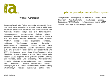 Weseli, Agnieszka Agnieszka Weseli aka Furja - historyczka seksualności (tematy m.in. wychowanie seksualne na terenach polskich w XIX wieku, prostytucja, przymusowa prostytucja oraz homoseksualizm w KL Auschwitz, obecność lesbijek oraz osób transseksualnych i transgenderowych w społeczeństwie i kulturze polskiej, seksualność lesbijska, lesbianizm a sadomasochizm). Publikacje m.in. "Rita Baum", "Przegląd Historyczny", "Zadra", "Katedra", "Polityka", antologie polskie i zagraniczne. Tłumaczka, redaktorka. Współtworzyła projekty "Poradnia Antyhomofobiczna", kalendarium "LESteśmy w Polsce" i "Fakty przeciwko mitom o lesbijkach i gejach" Porozumienia Lesbijek (LBT) oraz pierwszy w Polsce festiwal queerotyczny FAQ! (maj 2007). Współautorka - wraz z Agatą Engel-Bernatowicz, Alicją Długołęcką i Agnieszką Kramm - albumu "Kiedy kobieta kocha kobietę" (2008). Z uporem działa społecznie (Manify, Ladyfesty, Dni Równości, obozy Ulicy Siostrzanej). Współzałożycielka i członkini kolektywu społeczno-kulturalnej centry queerowej UFA: www.u-f-a.pl). Autorka i współautorka realizacji interaktywnych (m.in. "Porno", "WYkroczeNIA", "Słodkie sztuki"). Współtwórczyni kabaretu queerowego Barbie Girls. Weseli, Agnieszka Zaangażowana w reaktywację OLA-Archiwum i pisma "Furia Pierwsza". Współrealizatorka niezależnego projektu badawczego "QUEERstoria - (nie)zapomniana historia LBTQ". Studiuje psychologię zorientowaną na proces. strona: 1 / 1