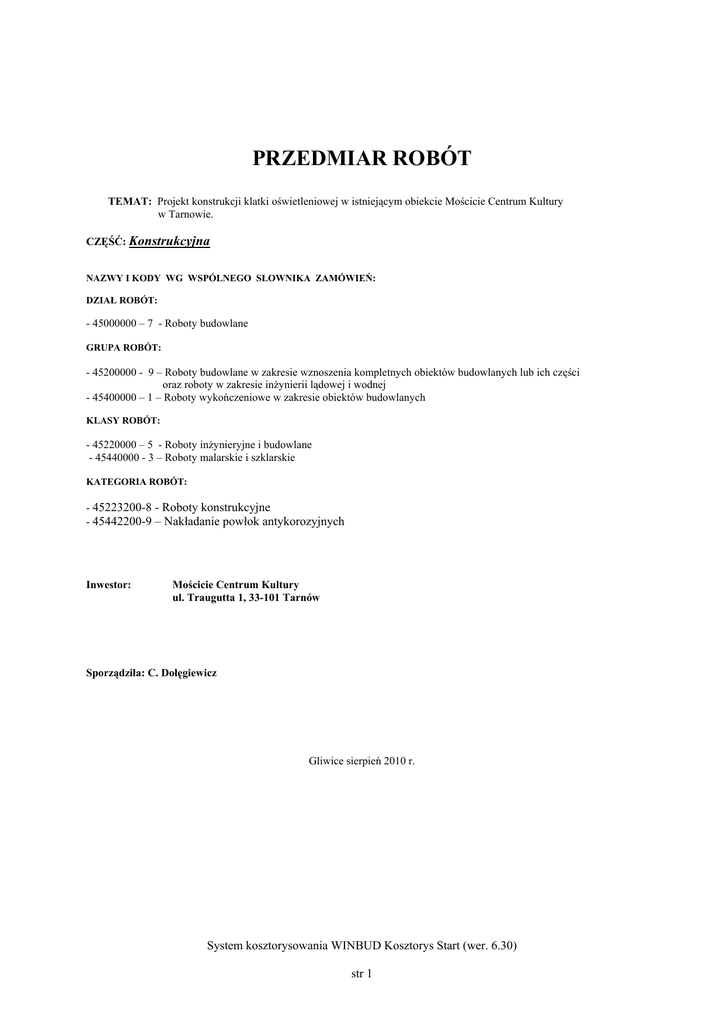 PRZEDMIAR ROBÓT TEMAT: Projekt konstrukcji klatki oświetleniowej w istniejącym obiekcie Mościcie Centrum Kultury w Tarnowie. CZĘŚĆ: Konstrukcyjna NAZWY I KODY WG WSPÓLNEGO SŁOWNIKA ZAMÓWIEŃ: DZIAŁ ROBÓT: - 45000000 – 7 - Roboty budowlane GRUPA ROBÓT: - 45200000 - 9 – Roboty budowlane w zakresie wznoszenia kompletnych obiektów budowlanych lub ich części oraz roboty w zakresie inżynierii lądowej i wodnej - 45400000 – 1 – Roboty wykończeniowe w zakresie obiektów budowlanych KLASY ROBÓT: - 45220000 – 5 - Roboty inżynieryjne i budowlane - 45440000 - 3 – Roboty malarskie i szklarskie KATEGORIA ROBÓT: - 45223200-8 - Roboty konstrukcyjne - 45442200-9 – Nakładanie powłok antykorozyjnych Inwestor: Mościcie Centrum Kultury ul. Traugutta 1, 33-101 Tarnów Sporządziła: C. Dołęgiewicz Gliwice sierpień 2010 r. System kosztorysowania WINBUD Kosztorys Start (wer. 6.30) str 1 Książka Przedmiarów Lp. Podst Opis i wyliczenia j.m Poszcz Razem POMOST - ROBOTY KONSTRUKCYJNE (oraz roboty dodatkowe związane z montażem elementów stalowych) 45223200-8 - Roboty konstrukcyjne 1 AW 0 Pomiary geodezyjne RAZEM 2 KNR 0202 1605-04-050 Rusztowania wewnętrzne rurowe,jednopomostowe do robót wykonywanych na sufitach o wysokości do 9 m. 5,0*30,0 Przeniesienie + 3 AW 8 Efektywny czas pracy rusztowań obmiar szacunkowy 60,0 Przeniesienie + 4 KNR 0401 0346-03-020 Wykucie gniazd o głębokości 1 cegły dla belek stalowych w ścianach na zaprawie cementowowapiennej 4 Przeniesienie + 5 KNR 0401 0337-04-040 6 KNR 0401 0313-04-040 Wykonanie przesklepień otworów w ścianach z cegieł. Dostarczenie i obsadzenie belek stalowych do I NP 180 mm 1,20*2*2 Wykonanie przesklepień otworów w ścianach z cegieł. Obmurowanie końców belek stalowych I NP 200-260 mm jako oddzielna robota 0,30*4 Przeniesienie + 8 KNR 4-01 0329-03-060 9 KNR 0508 0802-03-020 szt szt szt m m m m m m Wykucie otworów w ścianach z cegieł o grubości ponad 1/2 cegły na zaprawie wapiennej lub cementowowapiennej,dla otworów drzwiowych i okiennych 1,0*2,0*0,30*2 m3 m3 Przeniesienie + m3 Mechaniczne wykonanie ślepych otworów o objętości do 0,1 dm3 w cegle 3*2 Przeniesienie + 10 KNR 0508 0807-12-020 m-g m-g m-g m-g Wykucie bruzd poziomych o głębokości i szerokości 1/2 X 1 cegły w ścianach na zaprawie cementowej 1,20*2*2 m m Przeniesienie + m Przeniesienie + 7 KNR 0401 0313-07-040 m2 m2 m2 Mechaniczne wiercenie otworów w metalu. Głębokość wiercenia do 15 mm, średnica otworu 14 mm 3*2*2 Przeniesienie + szt szt szt 150,00 ------------150,00 RAZEM 150,00 60,00 ------------60,00 RAZEM 60,00 4,00 ------------4,00 RAZEM 4,00 4,80 ------------4,80 RAZEM 4,80 4,80 ------------4,80 RAZEM 4,80 1,20 ------------1,20 RAZEM 1,20 1,20 ------------1,20 RAZEM 1,20 6,00 ------------6,00 RAZEM 6,00 szt szt szt System kosztorysowania WINBUD Kosztorys Start (wer. 6.30) str 2 1,00 12,00 ------------12,00 11 KNR 0508 0809-01-020 12 KNR 0401 0704-01-050 Osadzenie w podłożu kołków rozporowych plastikowych w gotowych ślepych otworach. Montaż na ścianach lub stropach - OSADZENIE ŚRUB M-16 3*2*2 szt szt Przeniesienie + szt Powlekanie siatki cięto-ciągnionej zaprawą cementową na ścianach i stropach 1,0*0,30*2 Przeniesienie + 13 KNR 0401 0704-03-050 Wypełnienie oczek siatki cięto-ciągnionej zaprawą cementową na ścianach i stropach 1,0*0,30*2 Przeniesienie + 14 AW 4 Zakup stali na wykonanie stelażu do podwieszenia kładki WIESZAKI I BELKI 0,07216*1,02*1,018*2 0,03284*1,02*1,018*1 0,04729*1,02*1,018*1 0,01867*1,02*1,018*2 0,01681*1,02*1,018*2 0,02033*1,02*1,018*2 0,3158*1,02*1,018*2 0,03181*1,02*1,018*3 0,03112*1,02*1,018*4 0,07288*1,02*1,018*2 0,31483*1,02*1,018*2 0,13212*1,02*1,018*2 0,16735*1,018*1,02*2 Przeniesienie + 15 KNR 0205 0201-01-034 Estakady stalowe dla rurociągów. Montaż konstrukcji stalowej podpór scalonych o masie do 2,0 t - analogia montaż stelażu WIESZAKI I BELKI 0,07216*1,02*1,018*2 0,03284*1,02*1,018*1 0,04729*1,02*1,018*1 0,01867*1,02*1,018*2 0,01681*1,02*1,018*2 0,02033*1,02*1,018*2 0,3158*1,02*1,018*2 0,03181*1,02*1,018*3 0,03112*1,02*1,018*4 0,07288*1,02*1,018*2 0,31483*1,02*1,018*2 0,13212*1,02*1,018*2 0,16735*1,018*1,02*2 Przeniesienie + 16 AW 4 Zakup konstrukcji stalowej na wykonanie pomostu (kładki) ELEM.PS1-1* 0,52292*1,02*1,018 ELEM.PS2-2* 0,53341*1,02*1,018 m2 m2 m2 m2 m2 m2 t t t t t t t t t t t t t t t t t t t t t t t t t t t t t t t t RAZEM 12,00 12,00 ------------12,00 RAZEM 12,00 0,60 ------------0,60 RAZEM 0,60 0,60 ------------0,60 RAZEM 0,60 0,1499 0,0341 0,0491 0,0388 0,0349 0,0422 0,6558 0,0991 0,1293 0,1514 0,6538 0,2744 0,3475 ------------2,6602 RAZEM 2,6602 0,1499 0,0341 0,0491 0,0388 0,0349 0,0422 0,6558 0,0991 0,1293 0,1514 0,6538 0,2744 0,3475 ------------2,6602 RAZEM 2,6602 t t t t System kosztorysowania WINBUD Kosztorys Start (wer. 6.30) str 3 0,543 0,5539 t t t t Suma Przeniesienie pomnożone 2 ------------1,0969 2,1937 RAZEM 17 KNR 0205 0201-10-034 Estakady stalowe dla rurociągów. Montaż konstrukcji stalowych pomostów i drabin - p. analogia ELEM.PS1-1* 0,52292*1,02*1,018 ELEM.PS2-2* 0,53341*1,02*1,018 Suma Przeniesienie pomnożone 2 t t t t t t t t 2,1937 0,543 0,5539 ------------1,0969 2,1937 RAZEM 18 AW 0 Zakup kratek pomostowych ocynkowanych 1,10*30,0 Przeniesienie + 19 KNR 0202 0702-09-050 Przekrycia kanałów płytami z blachy żeberkowej. - p. ANALOGIA MONTAŻ KRATEK POMOSTOWYCH KRATKI WG CEN ZAKUPU 1,10*30,0 Przeniesienie + 20 KNR 0401 0106-04-060 Usunięcie z parteru gruzu i ziemi bez względu na kategorię 1,0*2,0*0,30*2 1,20*0,06*0,25*2*2 Przeniesienie + 21 KNR 0401 0108-11-060 Wywiezienie gruzu spryzmowanego samochodami samowyładowczymi na odległość do 1 km 1,0*2,0*0,30*2 1,20*0,06*0,25*2*2 Przeniesienie + 22 KNR 0401 0108-12-060 Wywiezienie gruzu spryzmowanego samochodami samowyładowczymi na każdy następny 1 km - ZA DALSZE 9,0 KM 1,0*2,0*0,30*2 1,20*0,06*0,25*2*2 Przeniesienie + 23 AW 0 Opłata za składowanie gruzu 1,0*2,0*0,30