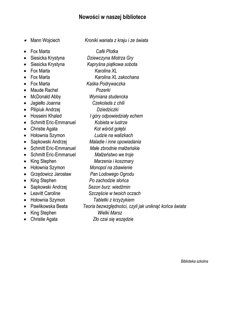 Nowości w naszej bibliotece Mann Wojciech Fox Marta Siesicka Krystyna Siesicka Krystyna Fox Marta Fox Marta Fox Marta Maude Rachel McDonald Abby Jagiełło Joanna Pilipiuk Andrzej Hosseini Khaled Schmitt Eric-Emmanuel Christie Agata Hołownia Szymon Sapkowski Andrzej Schmitt Eric-Emmanuel Schmitt Eric-Emmanuel King Stephen Hołownia Szymon Grzędowicz Jarosław King Stephen Sapkowski Andrzej Leavitt Caroline Hołownia Szymon Pawlikowska Beata King Stephen Christie Agata Kroniki wariata z kraju i ze świata Café Plotka Dziewczyna Mistrza Gry Kapryśna piątkowa sobota Karolina XL Karolina XL zakochana Kaśka Podrywaczka Pozerki Wymiana studencka Czekolada z chili Dziedziczki I góry odpowiedziały echem Kobieta w lustrze Kot wśród gołębi Ludzie na walizkach Maladie i inne opowiadania Małe zbrodnie małżeńskie Małżeństwo we troje Marzenia i koszmary Monopol na zbawienie Pan Lodowego Ogrodu Po zachodzie słońca Sezon burz: wiedźmin Szczęście w twoich oczach Tabletki z krzyżykiem Teoria bezwzględności, czyli jak uniknąć końca świata Wielki Marsz Zło czai się wszędzie Biblioteka szkolna