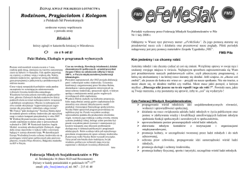 ZGINĄŁ KWIAT POLSKIEGO LOTNICTWA Rodzinom, Przyjaciołom i Kolegom z Polskich Sił Powietrznych serdeczne wyrazy współczucia z powodu straty Periodyk wydawany przez Federację Młodych Socjaldemokratów w Pile Nr 1 luty 2008 r. Bliskich którzy zginęli w katastrofie lotniczej w Mirosławcu O Oddajemy w Wasze ręce pierwszy numer „eFeMeSiaka”. Za jego pomocą staramy się przedstawiać nasze cele i działania oraz prezentować nasze poglądy. Pilski periodyk redagowany jest przy pomocy materiałów Zespołu Tygodnika „NIE”. co c h od zi Pakt Hulota, Ekologia w programach wyborczych Poziom wód morskich wzrasta rocznie o 3 mm, rzadziej pada śnieg, zmniejsza się warstwa zamarzniętej ziemi na Syberii i w Kanadzie. Fale upałów pojawiają się częściej, a cyklony wieją z większą siłą. NaleŜy, zdaniem naukowców, ograniczyć emisję dwutlenku gazu przynajmniej o jedną trzecią z produkowanych 25 mld ton rocznie. Coraz więcej europejskich polityków szuka punktu zaczepienia we wzrastającym zainteresowaniu wyborców kwestią środowiska naturalnego. Trzydzieści lat temu jedynie niewielka grupka polityków, głównie Zielonych słuchała naukowców którzy podnieśli alarm na temat niebezpieczeństw związanych z globalnym ociepleniem. Obecnie to niebezpieczeństwo zostało okrzyknięte "najpowaŜniejszym zagroŜeniem dla przyszłości i dobrobytu całego świata". We Francji "pakt ekologiczny" Nicolasa Hulota dąŜył do nadania sprawie ochrony środowiska jak najwyŜszej rangi w trakcie kampanii prezydenckiej w roku 2007. W Wielkiej Brytanii kwestie ochrony środowiska zostały zepchnięte na dalszy plan w powszechnych wyborach w 2005. W Niemczech kanclerz Angela Merkel, wcześniej adwokat polityki Zielonych, złagodziła swoje stanowisko w trakcie walki o oŜywienie będącej w zastoju ekonomii kraju. W demokracjach Europy Wschodniej kwestie ochrony środowiska nie są postrzegane wśród spraw politycznych jako pierwszoplanowe, twierdzi Petya Hristova, Bułgarska studentka na IEP w ParyŜu. Czas na rewolucję. Rewolucję świadomości, działań ekonomicznych i politycznych - grzmiał prezydent Jacques Chirac na zakończenie odbytej w lutym 2007r., w ParyŜu międzynarodowej konferencji klimatologów. Prezydent zaproponował, aby ONZ przyjęła deklarację praw i zobowiązań wobec środowiska. Uczestnicy konferencji, zorganizowanej przez Nicolasa Hulota, dziennikarza i autora programów telewizyjnych na temat ochrony środowiska, opracowali raport, w którym apelują o zmniejszenie emisji gazów węglowych wywołujących efekt cieplarniany. W pakcie Hulota znalazły się konkretne propozycje, które mają obniŜyć emisję gazów cieplarnianych do atmosfery oraz zmienić dotychczasowy model produkcji i konsumpcji francuskiego społeczeństwa. Nicolas Hulot opracował program przewidziany na najbliŜsze pięć lat. Przede wszystkim oczekuje wprowadzenia podatku dla producentów dwutlenku węgla, wymusza jego redukcję o jedną czwartą; zmianę systemu produkcji rolnej, którego celem powinna być przede wszystkim jakość Ŝywności i zmniejszenie jej kosztów transportu oraz obecność problematyki ekologicznej w debatach publicznych i programach edukacyjnych. Hulot oczekuje takŜe jak najszybszego powołania wicepremiera do spraw ochrony środowiska. Z pierwszej walki Nicolas Hulot wyszedł zwycięsko. Teraz przed nim batalia duŜo trudniejsza, bo jak wiadomo, politycy po wyborach mają zwyczaj zapominać o złoŜonych wcześniej obietnicach. kms Federacja Młodych Socjaldemokratów w Pile ul. Śródmiejska 16 (biuro SLD nad Rossmanem) DyŜury w kaŜdy poniedziałek w godzinach 1600-1700 email: [email protected], tel. 067 – 215 41 40 FMS Piła Kim jesteśmy i co chcemy robić Jesteśmy młodzi i nie chcemy czekać aŜ coś się zmieni. Wzięliśmy sprawy w swoje ręce i szukamy swojego miejsca w świecie. Najlepszym sposobem zaprezentowania się Wam jest przedstawienie naszych podstawowych celów, czyli płaszczyzny programowej, z którą się utoŜsamiamy i na której rzecz staramy się działać. Jeśli czujesz, Ŝe „chcesz coś zrobić”, ale jeszcze do końca nie wiesz co – przyjdź na nasze spotkanie. Nic nie tracisz, a moŜe okaŜe się, Ŝe idealnie trafiłeś czy trafiłaś. MoŜe masz jakiś pomysł, o którym myślisz: „Dlaczego nikt jeszcze na to nie wpadł i tego nie robi ?”. Powiedz nam, jakie są Twoje marzenia, a my postaramy się sprawić, Ŝeby to „coś” się wydarzyło ! Cele Federacji Młodych Socjaldemokratów: propagowanie wśród młodzieŜy idei socjaldemokratycznych: równości, wolności i sprawiedliwości społecznej, działanie na rzecz zwiększenia udziału ludzi młodych w Ŝyciu publicznym oraz pomoc w zdobywaniu wiedzy i kwalifikacji umoŜliwiających ludziom młodym spełnianie funkcji społecznych i zawodowych w społeczeństwie, upowszechnianie postaw proeuropejskich wśród ludzi młodych, ułatwiania młodym kontaktów z instytucjami i organizacjami międzynarodowymi, promocja kultury, w szczególności tworzonej przez ludzi młodych i do nich adresowanej, ochrona praw człowieka, propagowanie idei samorządności wśród ludzi młodych, promocja ekologii i ochrony środowiska, promocja kultury fizycznej, sportu i turystyki, szczególnie wśród ludzi młodych. Takie są początki Spotkanie ZałoŜycielskie odbyło się dnia 30 stycznia 2008r. Przewodniczącym Koła został Sławomir Bartol. Funkcję sekretarza powierzono Krzysztofowi Maciaszczykowi. Wiceprzewodniczącą Koła została Anna Stępkowska, natomiast członkiem zarządu został Artur Bystrzycki oraz Paweł Nowicki. Po spotkaniu ZałoŜycielskim nadszedł czas na Zjazd Wojewódzki (MS). Termin Zjazdu wyznaczony został na dzień 1.03.2008r. Delegatami powiatu pilskiego zostali Anna Stępkowska oraz Michał Szczechula. Kongres obradować będzie w Warszawie, w dniach 15 /16.03.2008r. FMS powycierał kurze, czas na SLD. niedziela¹, 13 stycznia 2008r.