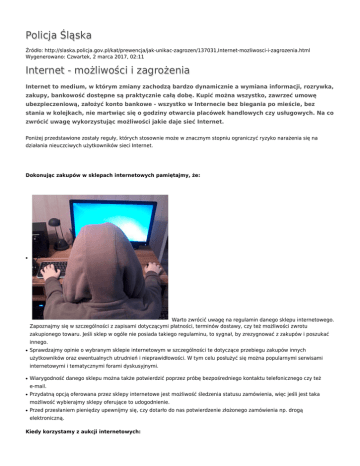 Policja Śląska Źródło: http://slaska.policja.gov.pl/kat/prewencja/jak-unikac-zagrozen/137031,Internet-mozliwosci-i-zagrozenia.html Wygenerowano: Czwartek, 2 marca 2017, 02:11 Internet - możliwości i zagrożenia Internet to medium, w którym zmiany zachodzą bardzo dynamicznie a wymiana informacji, rozrywka, zakupy, bankowość dostępne są praktycznie całą dobę. Kupić można wszystko, zawrzeć umowę ubezpieczeniową, założyć konto bankowe - wszystko w Internecie bez biegania po mieście, bez stania w kolejkach, nie martwiąc się o godziny otwarcia placówek handlowych czy usługowych. Na co zwrócić uwagę wykorzystując możliwości jakie daje sieć Internet. Poniżej przedstawione zostały reguły, których stosownie może w znacznym stopniu ograniczyć ryzyko narażenia się na działania nieuczciwych użytkowników sieci Internet. Dokonując zakupów w sklepach internetowych pamiętajmy, że: ● Warto zwrócić uwagę na regulamin danego sklepu internetowego. Zapoznajmy się w szczególności z zapisami dotyczącymi płatności, terminów dostawy, czy też możliwości zwrotu zakupionego towaru. Jeśli sklep w ogóle nie posiada takiego regulaminu, to sygnał, by zrezygnować z zakupów i poszukać innego. ● Sprawdzajmy opinie o wybranym sklepie internetowym w szczególności te dotyczące przebiegu zakupów innych użytkowników oraz ewentualnych utrudnień i nieprawidłowości. W tym celu posłużyć się można popularnymi serwisami internetowymi i tematycznymi forami dyskusyjnymi. ● Wiarygodność danego sklepu można także potwierdzić poprzez próbę bezpośredniego kontaktu telefonicznego czy też e-mail. ● Przydatną opcją oferowana przez sklepy internetowe jest możliwość śledzenia statusu zamówienia, więc jeśli jest taka możliwość wybierajmy sklepy oferujące to udogodnienie. ● Przed przesłaniem pieniędzy upewnijmy się, czy dotarło do nas potwierdzenie złożonego zamówienia np. drogą elektroniczną. Kiedy korzystamy z aukcji internetowych: ● Zawsze przed transakcją zapoznajmy się z komentarzami danego użytkownika portalu aukcyjnego oraz pamiętajmy, że sama ilość pozytywnych komentarzy nie jest jedynym wyznacznikiem uczciwości danego internauty. ● Pamiętajmy również o tym, że podobnie jak w świecie rzeczywistym w internecie nie ma tzw. „okazji”, nikt nam nie sprzeda samochodu czy roweru za połowę jego wartości skoro może otrzymać dużo wyższą cenę za oferowany towar. Dlatego też, nie wysyłajmy zaliczek czy przedpłat na konta osób, które takie okazje nam oferują. Zbyt niska cena też może sugerować ryzyko oszustwa. ● Na fakt, iż bierzemy udział w aukcji nieuczciwego sprzedawcy, może wskazywać też sam jej opis i załączone do niej zdjęcia, jeżeli nie są one wykonane przez sprzedającego, a pochodzą np. ze strony producenta danego przedmiotu lub aukcji innego użytkownika, może to świadczyć, iż sprzedający nie jest w posiadaniu wystawianego na sprzedaż towaru. ● Powinniśmy także zachować szczególną ostrożność, jeśli interesujący nas przedmiot oferowany jest na aukcji opisanej „łamaną polszczyzną” lub bez polskich znaków. ● Jeśli w trakcie trwania danej aukcji pojawią się jakiekolwiek wątpliwości co do uczciwości sprzedającego zastanówmy się nad rezygnacją z udziału w tej aukcji i ewentualnym odstąpieniem od transakcji. ● Wystrzegajmy się także finalizacji danej transakcji przez tzw. „zakup poza aukcją”, zachęceni przez sprzedającego niższą ceną danego towaru. W przypadku oszustwa, późniejsze dochodzenie swoich roszczeń, jak i postępowanie dowodowe w takiej sytuacji jest bardziej utrudnione. ● Przed dokonaniem zapłaty skontaktujmy się ze sprzedającym – im więcej informacji o sobie udostępnia (np. adres i telefon) tym mniejsze ryzyko dla nas jako kupujących. ● Opcję „przedpłaty na konto” wybierajmy tylko wtedy kiedy finalizujemy transakcję u doświadczonych i pozytywnie opiniowanych sprzedawców. ● Jeśli istnieje taka możliwość, wybierajmy funkcję depozytową portalu aukcyjnego i unikajmy transakcji z osobami, które nie chcą się zgodzić na taką formę płatności. ● Jeżeli wybraliśmy przesyłkę za zaliczeniem pocztowym – otwórzmy paczkę przy pracowniku poczty lub kurierze, w przypadku ujawnienia oszustwa, należy spisać protokół i złożyć zawiadomienie na Policji. ● Jeśli po aukcji zakończonej sprzedażą okaże się, że kupujący pochodzi z zagranicy, nie wysyłajmy towaru, dopóki pieniądze nie zostaną zaksięgowane na naszym koncie bankowym. Bardzo ostrożnie traktujmy informacje od kupującego zapewniającego nas o tym, że pieniądze zostały przelane, jednak z różnych przyczyn chwilowo wstrzymano ich zaksięgowanie, na co potwierdzeniem mają być przedstawiane przez kontrahenta, zazwyczaj spreparowane, dowody wpłat (najczęściej są to dokument w formacie *.pdf). ● Nie logujmy się na swoje konto w serwisie aukcyjnym z obcego komputera (np. w kafejce internetowej, u znajomego itp.), gdyż nie mamy pewności, że na danym komputerze nie jest uruchomione oprogramowanie do pozyskiwania informacji, które to powinny być znane tylko nam lub nawet czy jest na nim zainstalowany program antywirusowy z aktualnymi bazami złośliwego oprogramowania. ● Nie przekazujmy żadnych danych w odpowiedzi na zapytania od rzekomych administratorów serwisów aukcyjnego, są to preparowane przez oszustów e-maile służące przejęciu naszego konta użytkownika. Zasady bezpiecznego korzystania z bankowości elektronicznej: ● Pamiętajmy, żaden bank nigdy nie wysyła do swoich klientów pytań dotyczących haseł lub innych poufnych danych ani próśb o ich aktualizację. ● Sprawdźmy na stronie banku jakie zabezpieczenia stosowane są w serwisie internetowym. Przy każdym logowaniu bezwzględnie stosujmy się do zasad bezpieczeństwa tam opublikowanych. ● Komputer lub telefon ko