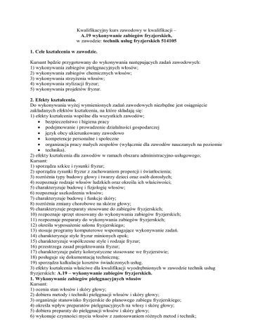 Kwalifikacyjny kurs zawodowy w kwalifikacji – A.19 wykonywanie zabiegów fryzjerskich, w zawodzie: technik usług fryzjerskich 514105 1. Cele kształcenia w zawodzie. Kursant będzie przygotowany do wykonywania następujących zadań zawodowych: 1) wykonywania zabiegów pielęgnacyjnych włosów; 2) wykonywania zabiegów chemicznych włosów; 3) wykonywania strzyżenia włosów; 4) wykonywania stylizacji fryzur; 5) wykonywania projektów fryzur. 2. Efekty kształcenia. Do wykonywania wyżej wymienionych zadań zawodowych niezbędne jest osiągnięcie zakładanych efektów kształcenia, na które składają się: 1) efekty kształcenia wspólne dla wszystkich zawodów; bezpieczeństwo i higiena pracy podejmowanie i prowadzenie działalności gospodarczej język obcy ukierunkowany zawodowo kompetencje personalne i społeczne organizacja pracy małych zespołów (wyłącznie dla zawodów nauczanych na poziomie technika). 2) efekty kształcenia dla zawodów w ramach obszaru administracyjno-usługowego; Kursant: 1) sporządza szkice i rysunki fryzur; 2) sporządza rysunki fryzur z zachowaniem proporcji i światłocienia; 3) rozróżnia typy budowy głowy i twarzy dzieci oraz osób dorosłych; 4) rozpoznaje rodzaje włosów ludzkich oraz określa ich właściwości; 5) charakteryzuje budowę i fizjologię włosów; 6) rozpoznaje uszkodzenia włosów; 7) charakteryzuje budowę i funkcje skóry; 8) rozróżnia zmiany chorobowe na skórze głowy; 9) charakteryzuje preparaty stosowane do zabiegów fryzjerskich; 10) rozpoznaje sprzęt stosowany do wykonywania zabiegów fryzjerskich; 11) rozpoznaje preparaty do wykonywania zabiegów fryzjerskich; 12) określa wyposażenie salonu fryzjerskiego; 13) stosuje programy komputerowe wspomagające wykonywanie zadań. 14) charakteryzuje style fryzur minionych epok; 15) charakteryzuje współczesne style i rodzaje fryzur; 16) przestrzega zasad projektowania fryzur; 17) charakteryzuje palety kolorystyczne stosowane we fryzjerstwie; 18) posługuje się dokumentacją techniczną; 19) sporządza kalkulacje kosztów świadczonych usług. 3) efekty kształcenia właściwe dla kwalifikacji wyodrębnionych w zawodzie technik usług fryzjerskich: A.19 – wykonywanie zabiegów fryzjerskich. 1. Wykonywanie zabiegów pielęgnacyjnych włosów Kursant: 1) ocenia stan włosów i skóry głowy; 2) dobiera metody i techniki pielęgnacji włosów i skóry głowy; 3) organizuje stanowisko fryzjerskie do planowego zabiegu fryzjerskiego; 4) określa wpływ preparatów pielęgnacyjnych na włosy i skórę głowy; 5) dobiera preparaty do pielęgnacji włosów i skóry głowy; 6) wykonuje czynności mycia włosów z zastosowaniem różnych metod i technik; 7) wykonuje zabiegi pielęgnacyjne włosów i skóry głowy; 8) udziela porad z zakresu codziennej pielęgnacji włosów. 2. Strzyżenie włosów, formowanie fryzur i ondulowanie Kursant: 1) określa indywidualne cechy urody klienta; 2) przeprowadza rozmowę konsultacyjną z klientem; 3) dobiera techniki, metody i sposoby strzyżenia włosów; 4) dobiera sprzęt fryzjerski do wykonywania zabiegów strzyżenia; 5) przestrzega zasad podziału włosów na sekcje i separacje do określonej linii fryzury; 6) ustala etapy strzyżenia; 7) wykonuje strzyżenie włosów damskich, męskich i dziecięcych; 8) wykonuje strzyżenie zarostu z uwzględnieniem kształtu twarzy klienta; 9) określa przeciwwskazania do wykonania zabiegów ondulacji i prostowania chemicznego włosów; 10) określa etapy ondulowania i prostowania chemicznego włosów; 11) dobiera techniki ondulowania i prostowania chemicznego włosów; 12) dobiera preparaty fryzjerskie do wykonywania zabiegów ondulowania i prostowania wodnego oraz chemicznego; 13) wykonuje zabiegi ondulowania i prostowania wodnego oraz chemicznego; 14) określa sposoby korygowania błędów podczas strzyżenia i ondulowania włosów; 15) dobiera preparaty do pielęgnacji włosów po chemicznych zabiegach fryzjerskich; 16) wykonuje fryzury okolicznościowe; 17) określa przeciwwskazania do zabiegu zagęszczania i przedłużania włosów; 18) wykonuje zagęszczanie i przedłużanie włosów. 3. Zmiana koloru włosów Kursant: 1) określa metody i techniki rozjaśniania i koloryzacji włosów; 2) określa wpływ zabiegów rozjaśniania i koloryzacji włosów na strukturę i wygląd włosów; 3) dobiera preparaty fryzjerskie do rozjaśniania i koloryzacji włosów; 4) dobiera kolor włosów do cech indywidualnych urody oraz fryzury klienta; 5) dobiera techniki rozjaśniania i koloryzacji włosów; 6) sporządza mieszaniny preparatów do rozjaśniania i koloryzacji włosów; 7) wykonuje zabiegi koloryzacji i rozjaśniania włosów; 8) wykonuje korektę koloru. 3. Minimalna liczba godzin kształcenia zawodowego 1) Efekty kształcenia wspólne dla wszystkich zawodów oraz efekty kształcenia wspólne dla zawodów w ramach obszaru administracyjno-usługowego stanowiące podbudowę do kształcenia w zawodzie lub grupie zawodów A.19. Wykonywanie zabiegów fryzjerskich 300 godz. 800 godz. 1) W szkole liczbę godzin kształcenia zawodowego należy dostosować do wymiaru godzin określonego w przepisach w sprawie ramowych planów nauczania w szkołach publicznych danego typu, zachowując minimalną liczbę godzin wskazanych w tabeli odpowiednio dla efektów kształcenia: wspólnych dla wszystkich zawodów i wspólnych dla zawodów w ramach obszaru kształcenia stanowiących podbudowę do kształcenia w zawodzie lub grupie zawodów oraz właściwych dla kwalifikacji wyodrębnionych w zawodzie.