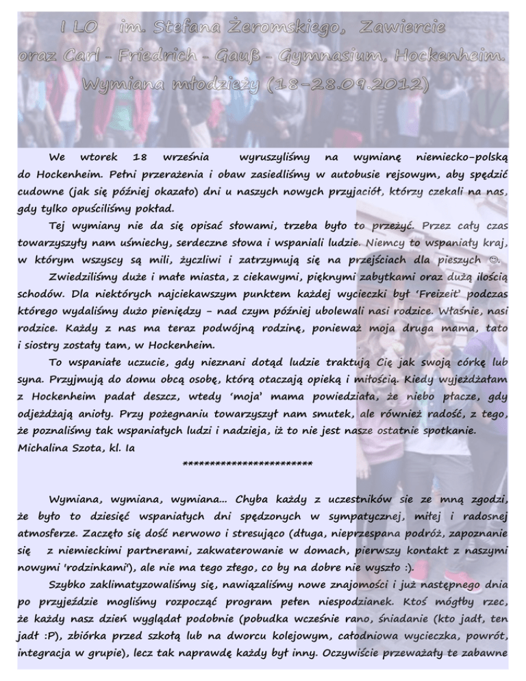 I LO im. Stefana Żeromskiego, Zawiercie oraz Carl - Friedrich - Gauß - Gymnasium, Hockenheim. Wymiana młodzieży (18-28.09.2012) We wtorek 18 września wyruszyliśmy na wymianę niemiecko-polską do Hockenheim. Pełni przerażenia i obaw zasiedliśmy w autobusie rejsowym, aby spędzić cudowne (jak się później okazało) dni u naszych nowych przyjaciół, którzy czekali na nas, gdy tylko opuściliśmy pokład. Tej wymiany nie da się opisać słowami, trzeba było to przeżyć. Przez cały czas towarzyszyły nam uśmiechy, serdeczne słowa i wspaniali ludzie. Niemcy to wspaniały kraj, w którym wszyscy są mili, życzliwi i zatrzymują się na przejściach dla pieszych . Zwiedziliśmy duże i małe miasta, z ciekawymi, pięknymi zabytkami oraz dużą ilością schodów. Dla niektórych najciekawszym punktem każdej wycieczki był ‘Freizeit’ podczas którego wydaliśmy dużo pieniędzy - nad czym później ubolewali nasi rodzice. Właśnie, nasi rodzice. Każdy z nas ma teraz podwójną rodzinę, ponieważ moja druga mama, tato i siostry zostały tam, w Hockenheim. . To wspaniałe uczucie, gdy nieznani dotąd ludzie traktują Cię jak swoją córkę lub syna. Przyjmują do domu obcą osobę, którą otaczają opieką i miłością. Kiedy wyjeżdżałam z Hockenheim padał deszcz, wtedy ‘moja’ mama powiedziała, że niebo płacze, gdy odjeżdżają anioły. Przy pożegnaniu towarzyszył nam smutek, ale również radość, z tego, że poznaliśmy tak wspaniałych ludzi i nadzieja, iż to nie jest nasze ostatnie spotkanie. Michalina Szota, kl. Ia ************************ Wymiana, wymiana, wymiana... Chyba każdy z uczestników sie ze mną zgodzi, że było to dziesięć wspaniałych dni spędzonych w sympatycznej, miłej i radosnej atmosferze. Zaczęło się dość nerwowo i stresująco (długa, nieprzespana podróż, zapoznanie się z niemieckimi partnerami, zakwaterowanie w domach, pierwszy kontakt z naszymi nowymi 'rodzinkami'), ale nie ma tego złego, co by na dobre nie wyszło :). Szybko zaklimatyzowaliśmy się, nawiązaliśmy nowe znajomości i już następnego dnia po przyjeździe mogliśmy rozpocząć program pełen niespodzianek. Ktoś mógłby rzec, że każdy nasz dzień wyglądał podobnie (pobudka wcześnie rano, śniadanie (kto jadł, ten jadł :P), zbiórka przed szkołą lub na dworcu kolejowym, całodniowa wycieczka, powrót, integracja w grupie), lecz tak naprawdę każdy był inny. Oczywiście przeważały te zabawne chwile jak np. tworzenie urodzinowego misia w sklepie, wspólny wieczór na molo w Überlingen, 'Lubię to' na czołach wszystkich śpiochów w pociągu, czy kolacja pożegnalna z genialnym filmikiem naszych niemieckich przyjaciół (i kapitalnym tekstem Adriana :D). Jednak najlepiej wspominam naszą dwudniową wycieczkę nad Jezioro Bodeńskie, gdzie mieszkaliśmy wszyscy razem w schronisku młodzieżowym. Od samego początku zapowiadało się dość niezwykle, bo już w pociągu natknęliśmy się na 'oryginalną atrakcję' :D. Po dotarciu na miejsce zostawiliśmy w pokojach nasz podbijać bagaż i wyruszyliśmy Überlingen. Malownicze miasteczko, przepiękne widoki, specyficzny klimat i ukochane molo, chyba na zawsze pozostaną w mojej pamięci. Po męczącym dniu w końcu mieliśmy czas dla siebie i... cały wieczór spędziliśmy na wspólnej zabawie.! Następnego dnia udaliśmy się statkiem do Konstancji, a stamtąd prosto do Hockenheim, gdzie czekali na nas nasi 'rodzice'. Niestety, czas podczas tej wymiany płynął tak szybko (ZA szybko), że zanim się obejrzeliśmy, już musieliśmy wracać. Większość z nas bardzo zżyła się i swoimi niemieckimi partnerami, dlatego żegnaliśmy się zaprzyjaźniła ze ze łzami w oczach, po tak cudownie spędzonych 9 dniach. Teraz wszyscy musimy wrócić do szarej rzeczywistości, ale mamy nadzieję, że za rok znów się spotkamy. . Kasia Musialska, kl. IIb ************************ We wtorek około 16:15 odbyła się zbiórka na parkingu przy ulicy Sikorskiego. Moje przerażenie nie znało granic … W głowie miałam tylko myśli „nie chcę tam jechać”, „jak ja się dogadam?”, „nie poradzę sobie” itp. Podróż jakoś minęła, nie było tak źle jakby się mogło wydawać. . Przyjechaliśmy na miejsce „mojej Caro” jeszcze nie było… Cierpliwie czekałam. Kiedy wreszcie się pojawiła wyściskałyśmy się (w końcu rok się nie widziałyśmy). Przyjechał „nasz” tato, bo tam wszystko było „nasze” ; nasza mama, nasza siostra, nasza szkoła, nasz dom, nasze auto (to budziło w niektórych największe emocje), czy wcześniej wspomniany nasz tato ;). . W pierwszym dniu cały czas byłam przerażona, bo początkowo kompletnie nie rozumiałam co moja rodzina do mnie mówi. Żeby nie narażać się na większe emocje poszłam spać ;) Wieczorem wybraliśmy się jeszcze na grilla z całą polsko-niemiecką grupą, co okazało się świetnym pomysłem, bo już pierwszego dnia odbyła się tzw. „integracja”. Oczywiście uczyliśmy naszych niemieckich kolegów polskich słów, co całkiem śmiesznie im wychodziło. Hmm … Co budziło we mnie największe emocje? Na pewno to, że każde auto bez wyjątku zatrzymywało się przed przejściem dla pieszych w celu ustąpienia pierwszeństwa, co w Polsce jest jak wiemy rzadkością ;). Oczywiście drogi, mnóstwo ścieżek rowerowych. Bardzo dużo osób biegało, jeździło na rowerach. Najpiękniejszym widokiem było jezioro Bodeńskie nocą, piękny krajobraz Konstancji. Urocze było też miasto Heidelberg, najbardziej zapadło mi w pamięć, kiedy Pan Schneider opowiadał, że jest taka piosenka „zostawiłem swoje serce w Heidelbergu” i że właśnie tam poznał swoją żonę, interesujące było także, że tam się urodził i mieszkał aż całe 4 dni. Kiedy przyszedł czas rozstania mój smutek był porównywalny do mojego przerażenia w dniu przyjazdu ;) Oczywiście wcale nie żałuję, że zdecydowałam się na tą