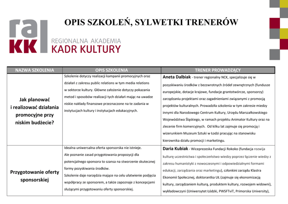 OPIS SZKOLEŃ, SYLWETKI TRENERÓW NAZWA SZKOLENIA OPIS SZKOLENIA Szkolenie dotyczy realizacji kampanii promocyjnych oraz działań z zakresu public relations w tym media relations Jak planować i realizować działania promocyjne przy niskim budżecie? TRENER PROWADZĄCY Aneta Dalbiak - trener regionalny NCK, specjalizuje się w pozyskiwaniu środków z bezzwrotnych źródeł zewnętrznych (fundusze w sektorze kultury. Główne założenie dotyczy pokazania europejskie, dotacje krajowe, fundacje grantotwórcze, sponsorzy) metod i sposobów realizacji tych działań mając na uwadze zarządzaniu projektami oraz zagadnieniami związanymi z promocją niskie nakłady finansowe przeznaczone na te zadania w projektów kulturalnych. Prowadziła szkolenia w tym zakresie miedzy instytucjach kultury i instytucjach edukacyjnych. innymi dla Narodowego Centrum Kultury, Urzędu Marszałkowskiego Województwa Śląskiego, w ramach projektu Animator Kultury oraz na zlecenie firm komercyjnych. Od kilku lat zajmuje się promocją i wizerunkiem Muzeum Sztuki w Łodzi pracując na stanowisku kierownika działu promocji i marketingu. A Przygotowanie oferty sponsorskiej Idealna uniwersalna oferta sponsorska nie istnieje. Daria Kubiak - Wiceprezeska Fundacji Rokoko (fundacja rozwija Ale poznanie zasad przygotowania propozycji dla kulturę uczestnictwa i społeczeństwo wiedzy poprzez łączenie wiedzy z potencjalnego sponsora to szansa na stworzenie skutecznej zakresu humanistyki z nowoczesnymi i odpowiedzialnymi formami formy pozyskiwania środków. Szkolenie daje narzędzia mające na celu ułatwienie podjęcia edukacji, zarządzania oraz marketingu), członkini zarządu Klastra Ekonomii Społecznej, doktorantka UŁ (zajmuje się ekonomizacją współpracy ze sponsorem, a także zapoznaje z koncepcjami kultury, zarządzaniem kulturą, produktem kultury, rozwojem widowni), służącymi przygotowaniu oferty sponsorskiej. wykładowczyni (Uniwersytet Łódzki, PWSFTviT, Primorska University), trenerka, menedżerka kultury, specjalistka ds. promocji i PRu. Współpracuje z organizacjami pozarządowymi w zakresie doradztwa marketingowego i strategicznego, a także z instytucjami kultury w ramach promocji i organizacji wydarzeń. Identyfikacja wizualna materiałów promocyjnych Celem szkolenia jest pomoc w polepszeniu jakości Katarzyna Fortuna - grafik, projektant, magister kulturoznawstwa identyfikacji wizualnej, oraz wizerunku organizacji, których na specjalizacji: promocja sztuki. Aktualnie prowadzi studio graficzne przedstawiciele biorą udział w zajęciach. Podczas spotkania, Taramka (www.taramka.pl), które specjalizuje się w projektowaniu przy użyciu ogólnodostępnych programów, przedstawione grafiki użytkowej oraz identyfikacji wizualnej. zostaną proste i bezkosztowe sposoby na poprawienie jakości druków i materiałów graficznych używanych w organizacjach. Uczestnicy poznają również korzyści jakie z tego wynikają. Szkolenie prowadzone będzie metodami aktywnymi. Ukierunkowane będzie na zapoznanie Uczestników z Magdalena Mirys - wykształcenie wyższe pedagogiczne, od 14 lat związana z działalnością w organizacjach pozarządowych, od 2009 pojęciem partycypacji społecznej (rola, korzyści, metody i pracuje w Centrum Opus wspierając w formie doradztwa, szkoleń techniki). działalność stowarzyszeń i fundacji. W latach 2006-2008 pracowała w Młodzieżowym Domu Kultury, jako specjalista ds. pozyskiwania Partycypacja społeczna a działania kulturalne środków. Absolwentka Łódzkiej Szkoły Trenerów i Szkoły Facylitatorów Partnerstw Lokalnych. Od 2006 roku tworzyła partnerstwo w gminie Opoczno, ukierunkowane na rozwijanie przedsiębiorczości społecznej w oparciu o produkt regionalny i lokalny. W roku 2012 współpracowała przy tworzeniu Strategii Rozwoju Miejskiego Domu Kultury w Opocznie. Internet w promocji kultury i projektów kulturalnych Podczas szkolenia uczestnicy nauczą się budowania strategii Aneta Dalbiak - trener regionalny NCK, specjalizuje się w promocji i PR wydarzeń kulturalnych w Internecie, pozyskiwaniu środków z bezzwrotnych źródeł zewnętrznych (fundusze wykorzystania social media w budowaniu wizerunku instytucji, konstruowania tekstów do Internetu na potrzeby marketingu i PR oraz poznają narzędzia pozwalające mierzyć efektywność podejmowanych działań. europejskie, dotacje krajowe, fundacje grantotwórcze, sponsorzy) zarządzaniu projektami oraz zagadnieniami związanymi z promocją projektów kulturalnych. Prowadziła szkolenia w tym zakresie miedzy innymi dla Narodowego Centrum Kultury, Urzędu Marszałkowskiego Województwa Śląskiego, w ramach projektu Animator Kultury oraz na zlecenie firm komercyjnych. Od kilku lat zajmuje się promocją i wizerunkiem Muzeum Sztuki w Łodzi pracując na stanowisku kierownika działu promocji i marketingu. Animacja pracy w środowisku lokalnym Szkolenie ma na celu pokazanie uczestnikom kwintesencji Anna Furmańska - trenerka i doradczyni z zakresu animacji pracy animacyjnej, cech animatora, pozwoli zdiagnozować społecznej, aspektów funkcjonowania organizacji pozarządowych, u siebie cechy animatora. Poznają narzędzia pracy tworzenia i rozliczania projektów, a także pozyskiwania środków. Ze animacyjnej w środowisku lokalnym. Podczas szkolenia wraz środowiskiem NGO związana od 2000 roku, do Centrum OPUS trafiła z uczestnikami zostanie stworzona mapa pracy animatora. jako specjalistka Programu EURONGO. Od 2010 w Zarządzie Centrum OPUS. Pracuje na co dzień w biurze w Piotrkowie Trybunalskim, jednak często bywa w terenie. Autorka, koordynatorka, a potem opiekunka procesu edukacyjnego w projektach „Aktywna Szkoła”, w których Centrum OPUS był liderem, Centrum Aktywności Lokalnej partnerem merytorycznym, a Wojewódzkie Ośrodki Doskonalenia Nauczycieli partnerem na województwo. Projekt miał na celu wsparcie edukacyjne szkół i nauczycieli w zakresie wprowadzania zmian w szkołach