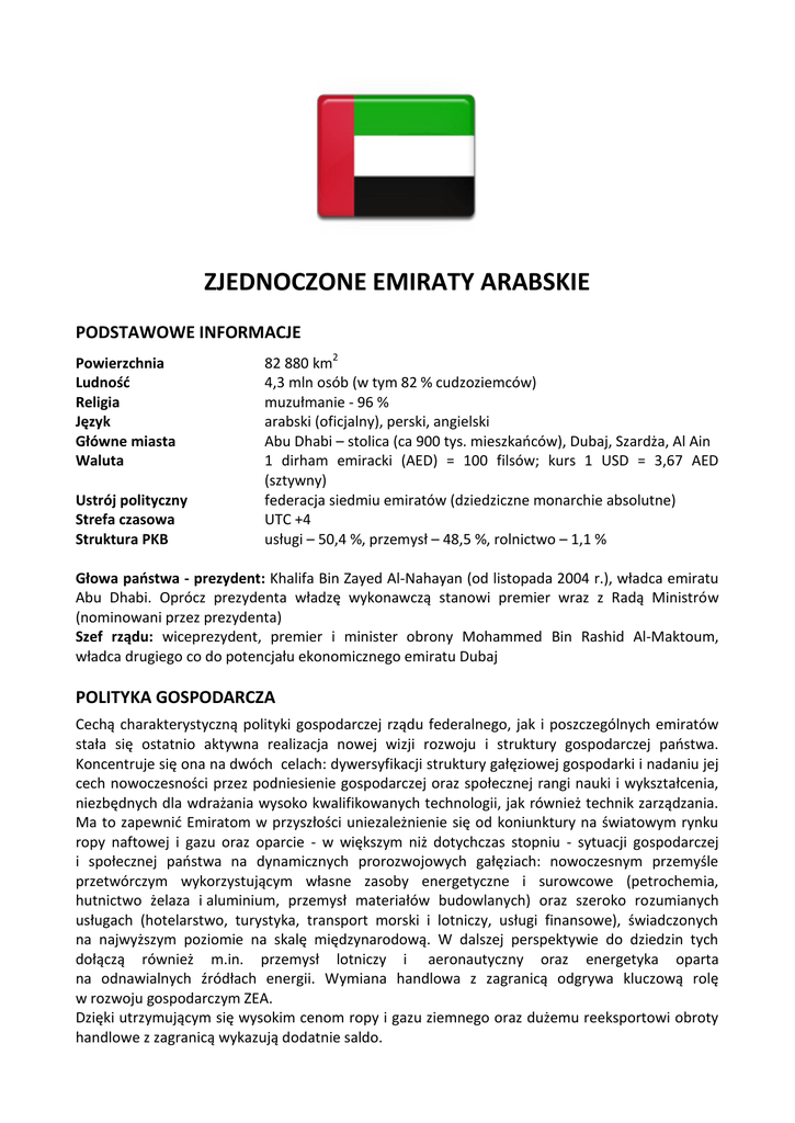 ZJEDNOCZONE EMIRATY ARABSKIE PODSTAWOWE INFORMACJE Powierzchnia Ludność Religia Język Główne miasta Waluta Ustrój polityczny Strefa czasowa Struktura PKB 82 880 km2 4,3 mln osób (w tym 82 % cudzoziemców) muzułmanie - 96 % arabski (oficjalny), perski, angielski Abu Dhabi – stolica (ca 900 tys. mieszkańców), Dubaj, Szardża, Al Ain 1 dirham emiracki (AED) = 100 filsów; kurs 1 USD = 3,67 AED (sztywny) federacja siedmiu emiratów (dziedziczne monarchie absolutne) UTC +4 usługi – 50,4 %, przemysł – 48,5 %, rolnictwo – 1,1 % Głowa państwa - prezydent: Khalifa Bin Zayed Al-Nahayan (od listopada 2004 r.), władca emiratu Abu Dhabi. Oprócz prezydenta władzę wykonawczą stanowi premier wraz z Radą Ministrów (nominowani przez prezydenta) Szef rządu: wiceprezydent, premier i minister obrony Mohammed Bin Rashid Al-Maktoum, władca drugiego co do potencjału ekonomicznego emiratu Dubaj POLITYKA GOSPODARCZA Cechą charakterystyczną polityki gospodarczej rządu federalnego, jak i poszczególnych emiratów stała się ostatnio aktywna realizacja nowej wizji rozwoju i struktury gospodarczej państwa. Koncentruje się ona na dwóch celach: dywersyfikacji struktury gałęziowej gospodarki i nadaniu jej cech nowoczesności przez podniesienie gospodarczej oraz społecznej rangi nauki i wykształcenia, niezbędnych dla wdrażania wysoko kwalifikowanych technologii, jak również technik zarządzania. Ma to zapewnić Emiratom w przyszłości uniezależnienie się od koniunktury na światowym rynku ropy naftowej i gazu oraz oparcie - w większym niż dotychczas stopniu - sytuacji gospodarczej i społecznej państwa na dynamicznych prorozwojowych gałęziach: nowoczesnym przemyśle przetwórczym wykorzystującym własne zasoby energetyczne i surowcowe (petrochemia, hutnictwo żelaza i aluminium, przemysł materiałów budowlanych) oraz szeroko rozumianych usługach (hotelarstwo, turystyka, transport morski i lotniczy, usługi finansowe), świadczonych na najwyższym poziomie na skalę międzynarodową. W dalszej perspektywie do dziedzin tych dołączą również m.in. przemysł lotniczy i aeronautyczny oraz energetyka oparta na odnawialnych źródłach energii. Wymiana handlowa z zagranicą odgrywa kluczową rolę w rozwoju gospodarczym ZEA. Dzięki utrzymującym się wysokim cenom ropy i gazu ziemnego oraz dużemu reeksportowi obroty handlowe z zagranicą wykazują dodatnie saldo. W strukturze towarowej eksportu ZEA ok. 45 % jego wartości przypada na ropę naftową, gaz ziemny i produkty ropopochodne, ca 30 % to reeksport towarów importowanych, resztę zaś stanowią różne produkty, gł. ryby i daktyle. Podstawowy przedmiot nie-węglowodorowego eksportu ZEA to aluminium hutnicze, którego Emiraty są czołowym eksporterem na świecie. Drugą ważną pozycją w tej grupie jest złoto, będące czołowym towarem reeksportu - przez Dubaj przechodzi 10 % światowych obrotów tym metalem. Główni odbiorcy eksportu ZEA w to Japonia (16,5%), Indie (15,1%), Iran (10%), Tajwan (8,9%), Korea (5,9%) Import pochodzi głównie z Indii (17%), Chin (14%), USA (11%), Niemiec (5%) oraz Japonii (4%). Dominują w nim: maszyny i urządzenia, sprzęt transportowy, chemikalia i żywność. Członkostwo w organizacjach międzynarodowych: ONZ i jej agendy – UNCTAD, UNESCO, UNIDO, Bank Światowy (WB), Międzynarodowy Fundusz Walutowy (IMF), Światowa Organizacja Handlu (WTO), Międzynarodowa Agencja Energii Atomowej (IAEA), Międzynarodowy Bank Rozwoju (IDB), Międzynarodowy Bank Odbudowy i Rozwoju (IBRD), Liga Arabska (AL), Panarabska Strefa Wolnego Handlu (GAFTA), Rada Współpracy Państw Zatoki (GCC), Organizacja Państw Eksporterów Ropy Naftowej (OPEC), Organizacja Arabskich Krajów Eksportujących Ropę Naftową (OAPEC). Stosunki z Unią Europejską: w 1989 r. Komisja Europejska i GCC podpisały Umowę o współpracy przewidującą m.in. podjęcie negocjacji w/s zawarcia umowy o wolnym handlu. Rozmowy rozpoczęto w 1990 r. Pomimo kilkukrotnych rund spotkań technicznych i politycznych, nie osiągnięto pełnego porozumienia, w związku z czym negocjacje w końcu 2008 r. zostały zawieszone. RAMY PRAWNO-TRAKTATOWE WSPÓŁPRACY DWUSTRONNEJ 1. UE – ZEA: wzajemne relacje, w tym gospodarcze, reguluje Umowa o współpracy pomiędzy UE a państwami GCC - podpisana w 1989 r. 2. Współpracę dwustronną regulują 5 umów między RP a ZEA: Umowa o unikaniu podwójnego opodatkowania z 1993 r. Umowa o wzajemnym popieraniu i ochronie inwestycji z 1993 r. Umowa o cywilnej komunikacji lotniczej z 1994 r. Umowa o współpracy w dziedzinie informacji, kultury i nauki z 1994 r. Umowa między Rządem Rzeczypospolitej Polskiej a Rządem Zjednoczonych Emiratów Arabskich o współpracy gospodarczej podpisana 22 kwietnia 2012 r. WYMIANA HANDLOWA Z POLSKĄ Zjednoczone Emiraty Arabskie są bardzo atrakcyjnym partnerem współpracy, o bogatych tradycjach handlowych oraz nowoczesnej infrastrukturze. W 2010 r. kraj ten był trzecim pod względem wielkości obrotów partnerem handlowym Polski na Bliskim Wschodzie (po Izraelu i Arabii Saudyjskiej), zaś wśród krajów Ligi Arabskiej zajmował drugie miejsce, po KAS. Obroty towarowe Polski z ZEA w latach 2006-2012 (w mln USD) 2006 EXPORT IMPORT OBROTY SALDO Źródło: GUS 218,0 78,6 296,6 139,4 2007 302,1 119,2 421,4 182,9 2008 763,5 100,3 863,8 663,2 2009 476,1 44,1 520,2 432,0 2010 244,9 69,7 314,6 175,6 2011 2012 271,3 80,6 351,9 190,6 440,0 102,0 542,0 338,0 W 2012 r. w polskim eksporcie przeważały: urządzenia mechaniczne i maszyny (głównie sprzęt dla telefonii, kable, elektrody węglowe, lampy), wyroby metalurgiczne (ostrza do golenia, wyroby stalowe); artykuły rolno-spożywcze (przetwory, wyroby tytoniowe, cukier), produkty przemysłu chemicznego (głównie kosmetyki); wyroby różne (meble, stelaże i materace), wyroby ceramiczne. W 2012 roku w polskim imporcie przeważały: wyroby nieszlachetne i wyroby z metali nieszlachetnych, urządzenia mechaniczne 