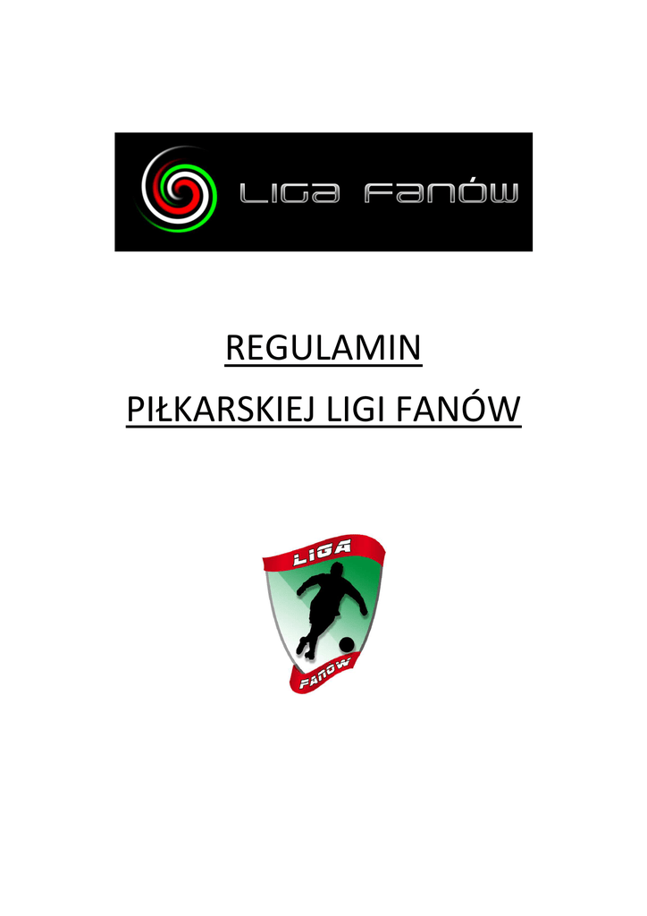 REGULAMIN PIŁKARSKIEJ LIGI FANÓW §1 Warunki Uczestnictwa 1. Rozgrywki prowadzone są przez firmę QUIZ Rafał Milewski z siedzibą w Warszawie, w dalszej części zwaną Organizatorem. 2. Warunkiem przystąpienia do rozgrywek jest: a) wypełnienie formularza zgłoszeniowego i listy zawodników oraz przesłanie drogą mailową na adres [email protected], bądź też wypełnienie wspomnianych dokumentów za pośrednictwem oficjalnej strony internetowej rozgrywek; b) dokonanie opłaty za rozgrywki w wysokości ustalonej z organizatorem. Istnieje możliwość dokonania płatności w trzech ratach. Wpłat należy dokonywać na konto: 76 2030 0045 1110 0000 0201 5270 3. Zgłoszenie do rozgrywek skutkuje zaakceptowaniem regulaminu Ligi Fanów. §2 Zespoły i Zawodnicy 1. System rozgrywek uzależniony jest od liczby drużyn zgłoszonych do danego sezonu i będzie ogłoszony przed startem każdego z nich. 2. Każda drużyna musi posiadać swojego reprezentanta (kierownika), który: a) zgłasza i wycofuje drużynę z rozgrywek b) odpowiada za kontakt z Organizatorem w związku ze sprawami dotyczącymi jego drużyny c) odpowiada za zachowanie się drużyny przed, podczas jak i po meczu; d) odpowiada za niedopuszczenie do gry zawodników w swoim zespole do tego nieuprawnionych. 3. W rozgrywkach mogą brać udział tylko osoby pełnoletnie. W przypadku gry niepełnoletniego zawodnika odpowiedzialność spoczywa na kapitanie drużyny, który winien dysponować stosowną zgodą od przedstawicieli ustawowych małoletniego 4. Każdemu uczestnikowi rozgrywek znane są zasady gry w piłkę nożną i każdy uczestnik gry ma pełną świadomość, że może nabawić się kontuzji w trakcie gry. Organizator nie ponosi żadnej odpowiedzialności prawnej za wypadki wynikające z udziału zawodnika w 2 rozgrywkach piłkarskich, oraz skutki wypadków przed, po i w czasie gry. Każdy zawodnik gra na swoją odpowiedzialność, zaleca się uczestnikom rozgrywek w celu ochrony ubezpieczeniowej zawarcie ubezpieczenia od NNW. 5. Tylko dwóch zawodników z jednej drużyny może grać w innych klasach rozgrywkowych w różnych zespołach. Dopuszcza się zmianę drużyny tylko w sytuacji wyjątkowej (np. wycofanie się dotychczasowej drużyny zawodnika). 6. Kapitan zobowiązuje się niezwłocznie do przekazania treści Regulaminu członkom drużyny. 7. W ciągu 14 dni od daty podpisania karty zgłoszeniowej każdy z zawodników może zgłosić swoje uwagi do Regulaminu Rozgrywek do organizatora drogą elektroniczną na adres [email protected]. 8. Kapitan wraz z zastępca zobligowani są do zaktualizowania danych osobowych w przypadku ich zmiany. 9. Kapitan zobowiązany jest do poinformowania organizatora o nowych zawodnikach, którzy dołączyli w trakcie sezonu do drużyny i wpisanie ich na listę w protokole meczowym. 10. Każda drużyna zobowiązana jest do wpłacenia wpisowego za udział w rozgrywkach w terminie uzgodnionym z organizatorem. Odpowiedzialność za wpłatę całości spoczywa na osobie zgłaszającej drużynę do rozgrywek piłkarskich. 11. Zgłoszenie do rozgrywek i brak zgłoszonych uwag do Regulaminu przez zawodnika oznacza pełną akceptację Regulaminu i nakłada obowiązek jego przestrzegania przez uczestników rozgrywek 12. Każda drużyna biorąca udział w rozgrywkach ma obowiązek występowania w jednakowych strojach z numerami na plecach (od 1 do 99) przy czym drużynom, które nie posiadają jednolitych, ponumerowanych strojów Organizator na czas meczu wypożycza znaczniki. 13. W sytuacji gdy choćby jeden zawodnik zdecydował się na grę w znaczniku, reszta drużyny również jest zobowiązana do nałożenia znaczników. Sędzia ma prawo, pod groźbą walkowera, nie dopuścić do meczu drużyny, która nie godzi się na założenie znaczników. 14. Zawodnik nie może posiadać jakichkolwiek przedmiotów, które mogą stanowić zagrożenie dla niego oraz innych uczestników meczu (zegarki, kolczyki, naszyjniki itp.). Dopuszcza się grę w okularach korekcyjnych, jednak tylko za zgodą Organizatora, która zapadła po wcześniejszym zwróceniu się zainteresowanego drogą pisemną. 15. Każdy zawodnik winien występować w obuwiu sportowym - buty sportowe na płaskiej podeszwie (halówki), turfy oraz lanki. Zabrania się grania w obuwiu mającym jakiekolwiek elementy metalowe. 3 16. Za kibiców odpowiada drużyna i jej kapitan. Jeżeli sympatycy danego zespołu zakłócają spokój rozgrywek, organizator ma prawo poprosić kapitana zespołu o podjęcie stosownych czynności. W skrajnych przypadkach Organizator ma prawo wykluczyć z rozgrywek zespół, którego kibice zakłócają spokój rozgrywek. 17. Kibice są zobowiązani do przestrzegania regulaminu obiektu na którym są rozgrywane mecze. 18. Przełożenie terminu rozegrania spotkania jest możliwe tylko za zgodą Organizatora i drużyny przeciwnej. Zespół występujący o zmianę terminu meczu musi zwrócić się o to do Organizatora przynajmniej tydzień przed pierwotnym terminem jego rozegrania. Prośby złożone później nie będą rozpatrywane. 19. Terminarz rozgrywek przygotowywany jest na 1,5 tygodnia przed daną kolejką i złożony jest on z podsyłanych propozycji meczowych. W przypadku rozegrania meczu ostateczne słowo należy do gospodarza. 20. Organizator ma prawo podjąć decyzję o wykluczeniu danej drużyny z rozgrywek w przypadku: a) braku przewidzianej regulaminem wpłaty b) wybitnie niesportowego zachowania się zawodników i osób związanych z drużyną przed, w czasie lub po meczu c) notorycznego łamania postanowień regulaminu Ligi Fanów d) trzykrotnego niestawienia się na spotkanie w jednej rundzie. 21. W przypadku wycofania drużyny z rozgrywek osoba do tego uprawniona powinna powiadomić o tym fakcie Organizatora. 22. Drużynom, które zostały wykluczone lub wycofały się z rozgrywek nie przysługuje zwrot wniesionej wcześniej opłaty. 23. W przypadku wykluczenia lub wycofania się drużyny, organi