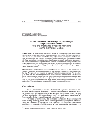 Zeszyty Naukowe AKADEMII PODLASKIEJ w SIEDLCACH Seria: Administracja i Zarz dzanie Nr 85 2010 dr Teresa Nowogródzka Akademia Podlaska w Siedlcach Rola i znaczenie marketingu terytorialnego na przyk adzie Siedlec Role and importance of regional marketing on the example of Siedlce Streszczenie: W opracowaniu zwrócono uwag na istotn! rol i znaczenie dzia"a# marketingowych, ze szczególnym uwzgl dnieniem promocji w funkcjonowaniu i rozwoju miasta (na przyk"adzie miasta Siedlce). Wyja$niono genez oraz istot marketingu terytorialnego, jak równie% mo%liwo$& zastosowania w nim narz dzi marketingu mix (tzw. terytorialny marketing-mix). Przedstawione zosta"o praktyczne zastosowanie narz dzi promocji w Urz dzie Miasta Siedlce. Na podstawie analizy literatury 'ród"owej stwierdzono, %e zastosowane narz dzia promocji miasta Siedlec s! skutecznymi instrumentami, zapewniaj!cymi rozwój miasta i regionu, jak te% wp"ywaj!cymi na ich konkurencyjno$&. Abstract: In this elaboration a significant attention was focused on the importance of marketing activities with special reference to promotion in functioning and developing the city. The genesis and essence of regional marketing was explained. The possibility of using the mix marketing tools was also taken into consideration. The practical use of promotion tools was presented in the municipal office of Siedlce. Basing upon the sources of marketing literature analysis it was indicated that the promotion tools used in this analysis were effective instruments ensuring the development of town and region. They also have a considerable impact on competitiveness. Wprowadzenie S owo „promocja” pochodzi od aci!skich wyrazów promotio i promovere, oznaczaj"cych „poparcie” i „prowadzenie naprzód”. Promocj# mo$na okre%li& jako pozacenow" form# konkurencji. Synonimem s owa „promocja” jest okre%lenie „oddzia ywanie na rynek” lub „wp ywanie na nabywców” (indywidualnych, jak równie$ instytucji pa!stwowych)1. Promocja w odniesieniu do jednostki samorz"du terytorialnego ma wiele definicji. Wed ug jednej z nich definicji promocja (w aspekcie terytorialnym) jest procesem polegaj"cym na wzajemnym oddzia ywaniu podmiotów zwi"zanych z zasobami danego terenu w celu pobudzenia, wspierania i ini1 T. Sztucki, Encyklopedia marketingu, Placet, Warszawa 1998, s. 256. 86 T. Nowogródzka cjowania rozwoju spo eczno-gospodarczego jednostki terytorialnej; wzajemne oddzia ywanie polega na wywo ywaniu zmian zarówno w ilo%ciowych, jak i jako%ciowych cechach tych jednostek oraz postaw i zachowa! ró$nych grup spo ecznych potencjalnie zwi"zanych z danym terenem. Promocja jest procesem komunikacji marketingowej zewn#trznej i wewn#trznej w celu osi"gni#cia okre%lonych celów wynikaj"cych z zamierze!, planów i kierunków rozwoju gospodarczego. Mianem promocji gospodarczej okre%la si# dzia ania podejmowane przez samorz"d, s u$"ce celom inwestowania w ró$ne dziedziny gospodarki na swoim terytorium; stanowi ona niezb#dny aspekt rozwoju miasta; obecnie jest niezb#dna, wr#cz obowi"zkowa na tzw. rynku miast. Miasto jest specyficznym przedmiotem na rynku, poniewa$ najpierw powsta o (niejednokrotnie setki lat temu), a dopiero w warunkach gospodarki rynkowej znalaz o si# na rynku. W rozwa$aniach na temat promocji miasta wyst#puje definicja poj#cia „miasta”: jako jednostki osadniczej, powsta ej historycznie w wyniku skupiania si# ludno%ci, wyodr#bnionej pod wzgl#dem formalnoadministracyjnym, zorganizowanej na zasadzie samorz"dowej, posiadaj"cej swój bud$et, charakteryzuj"cej si# nierolniczymi funkcjami oraz zwartymi i intensywnymi formami zabudowy, wyposa$onej w urz"dzenia infrastruktury i zmierzaj"cej do optymalnego zaspokojenia potrzeb swoich mieszka!ców. Miasta s" jednym z najwa$niejszych przejawów rozwoju cywilizacyjnego ludzko%ci; stanowi" charakterystyczn" form# wspó $ycia spo ecznego, sfer# oddzia ywa! kulturowych, obejmuj"c" wiele dziedzin i maj"c" nierzadko cechy ponadnarodowe. W wymiarze ekonomicznym s" najbardziej produktywnymi obszarami %wiata; ka$de miasto posiada swoj" specyfik# i odr#bny charakter, wytworzony ze wzgl#du na dominuj"c" tam dzia alno%&. Ofert# miasta mo$na potraktowa& jak ka$dy inny produkt na rynku, a jego cechy, stanowi"ce profil, sk adaj" si# na jego unikatowy i indywidualny charakter2. W procesie tworzenia strategii marketingowej miasta nale$y zastanowi& si# nad odpowiedzi" na kilka podstawowych pyta!, np.: co oferujemy i komu? na jakie rynki b#dziemy dociera&? za jak" cen# sprzedajemy? jakie b#d" sposoby promocji oraz jakie warunki b#d" towarzyszy y ofertom na rynku? Efektami dzia a! promocyjnych samorz"du miasta powinien by& wzrost inwestycji w mie%cie i przep ywów kapita ów, zmniejszanie bezrobocia, zwi#kszenie efektywno%ci pracy, nap yw nowych technologii oraz inwestycje w sferze turystyki. Na podstawie konkretnego planu promocji miasta opracowane zostaj" szczegó owe projekty zawieraj"ce cele i metody podejmowanych dzia a! promocyjnych, koszty, terminy i osoby bezpo%rednio odpowiedzialne za realizacj# projektu. 'rodki na promocj# gospodarcz" (bud$et promocyjny) stanowi" cz#%& bud$etu miasta. Uzupe nienie bud$etu promocyjnego mog" stanowi& %rodki organizacji i agend pa!stwowych, sponsorów instytucjonalnych oraz przedsi#biorstw prywatnych. Komórka organizacyjna promocji gospodarczej w miar# mo$liwo%ci powinna by& wspomagana przez agencje reklamowe, 2 A. Szromnik, Marketing Terytorialny, Oficyna, Kraków 2002, s. 40. Seria: Administracja i Zarz dzanie (12)2010 ZN nr 85 Rola i znaczenie marketingu terytorialnego na przyk!adzie Siedlec 87 agencje promocyjne, agencje public relations, firmy konsultingowe. Dzia ania promocyjne miasta stanowi" element tzw. marketingu non-profit, którego celem nie jest osi"gni#cie okre%lonego zysku i bezpo%redniego zwrotu z inwestycji, ale konkretne dzia ania inwestorów na danym terenie; powinny zatem zmierza& w kierunku ustalonych zasad dzia a! marketingowych uwzgl#dniaj"cych komunikowanie si# z rynk