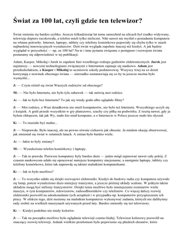 Świat za 100 lat, czyli gdzie ten telewizor? Świat zmienia się bardzo szybko. Jeszcze kilkadziesiąt lat temu samochód na ulicach był rzadko widywany, telewizja dopiero raczkowała, a telefon mieli tylko nieliczni. Nikt nawet nie myślał o posiadaniu komputera na własne potrzeby. Internet, laptopy, tablety czy telefony komórkowe pojawiały się chyba tylko w snach najbardziej innowacyjnych wynalazców. Dziś świat wygląda zupełnie inaczej niż kiedyś. A jak będzie wyglądał w przyszłości — np. za 100 lat? Na te i inne pytania związane z postępem i rozwojem świata postaramy się odpowiedzieć w tej publikacji. Adam, Kacper, Mikołaj i Jurek to zapaleni fani wszelkiego rodzaju gadżetów elektronicznych. Jurek jest najstarszy — nowymi technologiami związanymi z Internetem zajmuje się naukowo. Adam jest przedszkolakiem, a Kacper i Mikołaj to uczniowie szkoły podstawowej. Wszyscy trzej na co dzień korzystają z nowinek obecnego świata — nierzadko zastanawiają się co by tu jeszcze można było wymyślić... J: — Czym różnił się świat Waszych rodziców od obecnego? M: — Nie było Internetu, nie było tylu zabawek — tak mówią moi rodzice. A: — Jak to było bez Internetu? To jak się wtedy grało albo oglądało filmy? J: — Moi rodzice, a Wasi dziadkowie nie mieli komputerów, nie było też Internetu. Wszystkiego uczyli się z książek. A grali przede wszystkim w gry planszowe, szachy czy piłkę na podwórku. Z resztą nawet, gdy ja byłem chłopcem, tak jak Wy, mało kto miał komputer, a o Internecie w Polsce jeszcze mało kto słyszał. K: — To musiało być nudne... J: — Nieprawda. Było inaczej, ale na pewno równie ciekawie jak obecnie. Ja miałem okazję obserwować, jak zmieniał się świat w ostatnich latach. A zmian było bardzo wiele. A: — Jakie to były zmiany? M: — Wynaleziono telefon komórkowy i laptopy. J: — Tak to prawda. Pierwsze komputery były bardzo duże — jeden mógł zajmować nawet cały pokój. Z czasem naukowcom udało się opracować mniejsze komputery stacjonarne, a następnie laptopy, tablety czy telefony komórkowe, które tak naprawdę są takimi malutkimi komputerkami. K: — Jak to było możliwe? J: — To wszystko udało się dzięki rozwojowi elektroniki. Kiedyś do budowy radia czy komputera używało się lamp, potem wynaleziono dużo mniejszy tranzystor, a jeszcze później układy scalone. W jednym takim układzie mogą być miliony tranzystorów. Dzięki temu możliwe było zmniejszenie rozmiarów wielu maszyn, w tym komputerów, telewizorów, radioodbiorników czy telefonów. Co więcej dalszy rozwój elektroniki pozwolił na udoskonalanie tych urządzeń i w przypadku np. komputerów przyspieszenie ich pracy. W efekcie tego, dziś możemy na malutkim komputerze wykonywać zadania, których nie dalibyśmy rady zrobić na wielkich maszynach używanych przed laty. Bardzo zmieniły się też telewizory. K: — Kiedyś podobno nie miały kolorów. J: — Tak na początku możliwe było oglądanie telewizji czarno-białej. Telewizor kolorowy pozwolił na znaczący rozwój telewizji. Jednak wielkim przełomem było pojawienie się płaskich ekranów, które — Tak na początku możliwe było oglądanie telewizji czarno-białej. Telewizor kolorowy pozwolił na znaczący rozwój telewizji. Jednak wielkim przełomem było pojawienie się płaskich ekranów, które pozwoliły znacząco zmniejszyć rozmiary telewizorów. M: — A dlaczego kiedyś telewizory były „grube”? J: — Kiedyś ekran był kineskopowy, szklany i musiał zajmować sporo miejsca. Dopiero zastosowanie technologii ciekłego kryształu i diod LED pozwoliło na bardzo znaczące zmniejszenie jego grubości. Gdy pojawiły się telewizory w obecnej formie, wielu ludzi, pamiętając te wielkie maszyny ze swojej młodości, zastanawiało się gdzie właściwie jest ten telewizor... A tak naprawdę, dziś telewizor to również swego rodzaju komputer, który można podłączyć do Internetu i korzystać z jego zasobów. J: — No i znowu wracamy do Internetu — on naprawdę zmienił świat... Wiecie, że w Internecie działa dziś bardzo wiele urządzeń? Na przykład wspomniane już telewizory, telefony, tablety, ale także zegarki, kasy w sklepach czy lodówki a nawet okulary? A: — No tak. Ja noszę okulary — chciałbym by były podłączone do Internetu. J: — Takie okulary wyprodukował Google i być może kiedyś będziesz mógł takie nosić. J: — A jak myślicie, jak będzie w przyszłości — co jeszcze może działać w Internecie? A, M: — Elektroniczne buty, szafy, łóżko.... wszystko! J: — A słyszeliście o samochodach i samolotach sterowanych przez Internet, jeżdżących i latających bez pomocy człowieka? M: — Ja słyszałem nawet o takich helikopterach — ale do tego nie trzeba Internetu — wystarczy program. Wszystko kiedyś będzie można zaprogramować... Świat szybko się zmienia. Sami nie wiemy, jak będzie wyglądał w przyszłości. Na pewno za 100 lat będzie zupełnie inny niż obecnie. K: Ja za 100 lat chciałbym polecieć na planetę Jowisz albo przynajmniej podłączyć tam Internet... dr inż. Jerzy Domżał, Adam Domżał, Kacper Tomczyk, Mikołaj Tomczyk