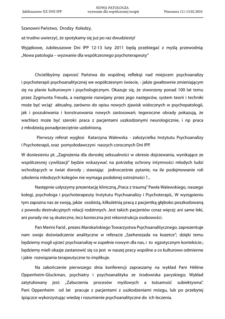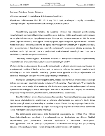 Jubileuszowe XX DNI IPP NOWA PATOLOGIA wyzwanie dla współczesnej terapii Warszawa 12 i 13.02.2010 Szanowni Państwo, Drodzy Koledzy, aż trudno uwierzyć, że spotykamy się już po raz dwudziesty! Wyjątkowe, Jubileuszowe Dni IPP 12-13 luty 2011 będą przebiegać z myślą przewodnią: „Nowa patologia – wyzwanie dla współczesnego psychoterapeuty” Chcielibyśmy zaprosić Państwa do wspólnej refleksji nad miejscem psychoanalizy i psychoterapii psychoanalitycznej we współczesnym świecie, - jakże gwałtownie zmieniającym się na planie kulturowym i psychologicznym. Okazuje się, że stworzony ponad 100 lat temu przez Zygmunta Freuda, a następnie rozwijany przez jego następców, system teorii i techniki może być wciąż aktualny, zarówno do opisu nowych zjawisk widocznych w psychopatologii, jak i poszukiwania i konstruowania nowych zastosowań; tegoroczne obrady pokazują, że wachlarz może być szeroki: praca z pacjentami uszkodzonymi neurologicznie, i np praca z młodzieżą ponadprzeciętnie uzdolnioną. Pierwszy referat wygłosi Katarzyna Walewska - założycielka Instytutu Psychoanalizy i Psychoterapii, oraz pomysłodawczyni naszych corocznych Dni IPP. W doniesieniu pt. „Zagrożenia dla dorosłej seksualności w okresie dojrzewania, wynikające ze współczesnej cywilizacji” będzie wskazywać na potrzebę ochrony intymności młodych ludzi wchodzących w świat dorosły ; stawiając jednocześnie pytanie, na ile podejmowanie roli szkolenia młodszych kolegów nie wymaga podobnej ostrożności ?... Następnie usłyszymy prezentację kliniczną „Praca z traumą” Pawła Walewskiego, naszego kolegi, psychologa i psychoterapeuty Instytutu Psychoanalizy i Psychoterapii,. W wystąpieniu tym zapozna nas ze swoją, jakże osobistą, kilkuletnią pracą z pacjentką głęboko poszkodowaną z powodu destrukcyjnych relacji rodzinnych. Jest takich pacjentów coraz więcej: ani same leki, ani porady nie są skuteczne, lecz konieczna jest rekonstrukcja osobowości. Pan Merini Farid , prezes Marokańskiego Towarzystwa Psychoanalitycznego. zaprezentuje nam swoje doświadczenie analityczne w referacie „Szeherezada na kozetce”; dzięki temu będziemy mogli ujrzeć psychoanalizę w zupełnie nowym dla nas, i to egzotycznym kontekście.; będziemy mieli okazje zastanowić się co jest w naszej pracy wspólne a co kulturowo odmienne i jakie rozwiązania terapeutyczne to implikuje. Na zakończenie pierwszego dnia konferencji zapraszamy na wykład Pani Hélène Oppenheim-Gluckman, psychiatry i psychoanalityka ze środowiska paryskiego; Wykład zatytułowany jest: „Zaburzenia procesów myślowych a tożsamość subiektywna”. Pani Oppenheim od lat pracuje z pacjentami z uszkodzeniami mózgu, lub po przebytej śpiączce wykorzystując wiedzę i rozumienie psychoanalityczne do ich leczenia. NOWA PATOLOGIA wyzwanie dla współczesnej terapii Jubileuszowe XX DNI IPP Warszawa 12 i 13.02.2010 Drugi dzień konferencji organizowany we współpracy z Inicjatywą Korczakowską poświęcony będzie zastosowaniu psychoanalizy w lecznictwie sektora publicznego . Obrady rozpocznie wystąpienie Pani Marzeny Slomskiej-Schmitt psychoanalityczki francuskiej polskiego pochodzenia, członkini Paryskiego Towarzystwa Psychoanalitycznego, i jednocześnie dydaktyka Francuskiego Instytutu Psychoanalizy Grupowej i Psychodramy. W doniesieniu „Od kiedy urodziłem się chodzę w tych samych butach” zaprezentuje doświadczenia z pracy w Ośrodku Terapeutycznym dla Adolescentów (CATTP) w Bordeaux dotyczące zastosowania psychodramy analitycznej w terapii adolescentów. Następnie zapraszamy na wystąpienie Pana Daniela Oppenheim, psychiatry i psychoanalityka z Paryża, gościa projektu unijnego Program Operacyjny Kapitał Ludzki Inicjatywa Korczakowska. Przedstawi on nam swoją pracę z małymi pacjentami chorymi na nowotwory mózgu, w referacie pt. „Pomoc dzieciom objętym terapią nowotworu mózgu – w ochronie ich poczucia wartości”. Naszą konferencję zakończy warsztat poświęcony psychoanalitycznemu rozumieniu stosowania leków. Zbędne wydaje się podkreślenie, że dzisiejsi pacjenci bardzo ciepiący mogą leczyć się dzięki postępom farmakoterapii w systemie otwartym. Warsztat poprowadzi polsko-francuski tandem, współpracujący na niwie neuropsychoanalizy: dr Sławomir Murawiec i dr Vassilis Kapsambelis, zaś materiał do pracy udostępni Pan dr Maciej Karaszkiewicz, za co serdecznie dziękujemy Pragniemy wyrazić wdzięczność Jej Magnificencji Pani Rektor Profesor Katarzynie Chałasińskiej-Macukow za inaugurację obrad i za udostępnienie nam tej wspaniałej sali, w której możemy się dziś spotkać; Dziękując Państwu za wspólne dwadzieścia lat, - zapraszamy na XXI Dni IPP „Seksualność współcześnie” W imieniu organizatorów: Katarzyna Walewska i Alicja Kubiak Alicja Kubiak - Prezes IPP