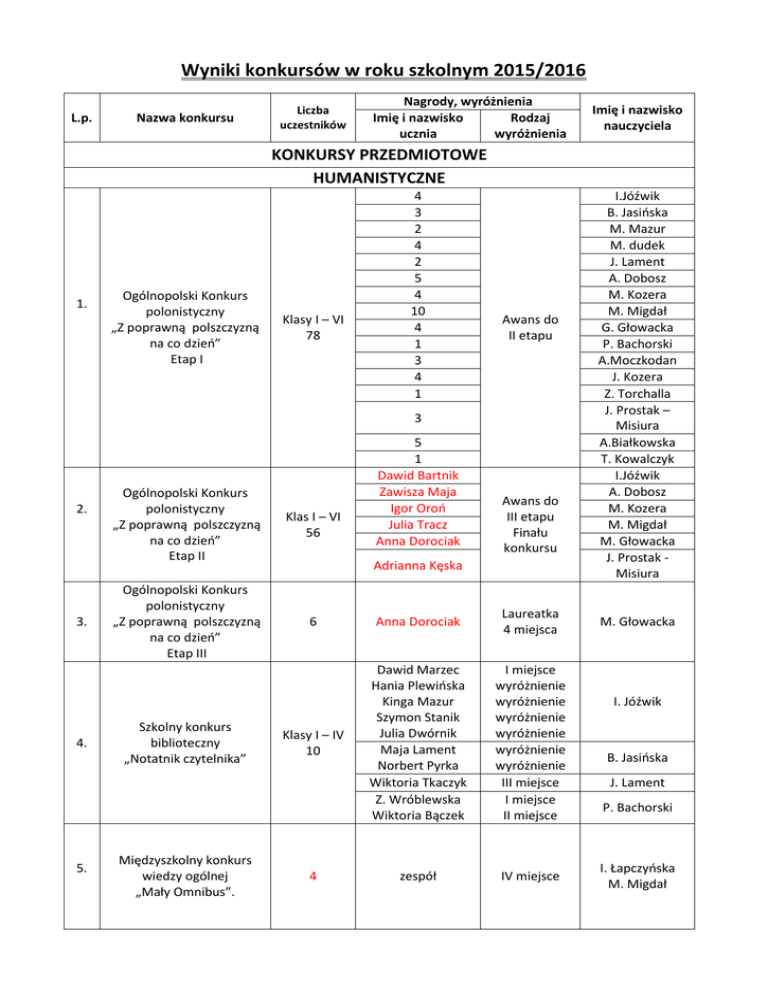 Wyniki konkursów w roku szkolnym 2015/2016 L.p. Nazwa konkursu Liczba uczestników Nagrody, wyróżnienia Imię i nazwisko Rodzaj ucznia wyróżnienia Imię i nazwisko nauczyciela KONKURSY PRZEDMIOTOWE HUMANISTYCZNE 1. Ogólnopolski Konkurs polonistyczny „Z poprawną polszczyzną na co dzień” Etap I Klasy I – VI 78 4 3 2 4 2 5 4 10 4 1 3 4 1 Awans do II etapu 3 2. 3. 4. 5. 5 1 Dawid Bartnik Zawisza Maja Igor Oroń Julia Tracz Anna Dorociak Ogólnopolski Konkurs polonistyczny „Z poprawną polszczyzną na co dzień” Etap II Klas I – VI 56 Ogólnopolski Konkurs polonistyczny „Z poprawną polszczyzną na co dzień” Etap III 6 Anna Dorociak Laureatka 4 miejsca Klasy I – IV 10 Dawid Marzec Hania Plewińska Kinga Mazur Szymon Stanik Julia Dwórnik Maja Lament Norbert Pyrka Wiktoria Tkaczyk Z. Wróblewska Wiktoria Bączek I miejsce wyróżnienie wyróżnienie wyróżnienie wyróżnienie wyróżnienie wyróżnienie III miejsce I miejsce II miejsce zespół IV miejsce Szkolny konkurs biblioteczny „Notatnik czytelnika” Międzyszkolny konkurs wiedzy ogólnej „Mały Omnibus”. Awans do III etapu Finału konkursu Adrianna Kęska 4 I.Jóźwik B. Jasińska M. Mazur M. dudek J. Lament A. Dobosz M. Kozera M. Migdał G. Głowacka P. Bachorski A.Moczkodan J. Kozera Z. Torchalla J. Prostak – Misiura A.Białkowska T. Kowalczyk I.Jóźwik A. Dobosz M. Kozera M. Migdał M. Głowacka J. Prostak Misiura M. Głowacka I. Jóźwik B. Jasińska J. Lament P. Bachorski I. Łapczyńska M. Migdał 6. I Regionalny Konkurs Pięknego Czytania w PSP nr 21 7. Ogólnopolski Konkurs dla Młodych Twórców ,,Kardynał Wyszyński – patron ważnych spraw” 8. Międzyszkolny Konkurs Czytelniczy ,,Kocham Czytać” 9. 3 A.Augustyniak Maja Zawisza Anna Bożewicz wyróżnienie I. Łapczyńska M. Migdał A. Dobosz M. Jaskulska B. Kogut A.Sławińska Maja Chłopicka wyróżnienie wyróżnienie J. Prostak – Misiura Andrzej Surowiec 3 ----laureat --4 --- Międzyszkolny Konkurs Literacko – Plastyczny ,,Szanuję… Dziękuję… Kocham Cię Mamo…” 17 Mistrz Języka Ojczystego 3 Julia Krzak wyróżnienie Maria Oroń wyróżnienie ----- 10. --- 11. 12. 13. 14. 15. Konkurs Polonistyczny województwa mazowieckiego ,,Mazowieckie Talenty” Międzyszkolny Konkurs Gier Planszowych Szkolny konkurs ortograficzny „Mistrz ortografii”. Międzyszkolny Konkurs Ortograficzny „As ortografii” Międzyszkolny Konkurs Ortograficzny --4 2 10 M. Białkowska J. Tracz 1 Adrianna Kęska 16. 17. Szkolny konkurs dotyczący wiedzy o Żołnierzach Wyklętych Kuratoryjny Konkurs Polonistyczny 4 --- A.Malmon Tomczyk --- Z. Torchalla I miejsce III miejsce M. Migdał ---- M. Migdał --- M. Jaskulska A. Malmon – Tomczyk J. Prostak – Misiura --- 3 Kacper Dróżdż Maciej Suwała Magdalena Żak 3 18. Międzyszkolny Konkurs ,,Radomski Czerwiec 1976” 28 G. Lewandowski Julia Krzak Julia Oracz Basia Kupidura Magdalena Górska Adrianna Kęska 19. Szkolny Konkurs Polonistyczny „Dzień Języka Ojczystego” Klasy IV - VI Drużyny klasowe J. Prostak – Misiura A.Malmon Tomczyk Z. Torchalla J. Prostak – Misiura M. Jaskulska J. Prostak – Misiura A. Malmon Tomczyk Z. Torchalla Awans do finału I miejsce II miejsce III miejsce M. Jaskulska ---- M. Jaskulska I miejsce III miejsce III miejsce wyróżnienie wyróżnienie wyróżnienie Z. Torchalla J. Prostak – Misiura M. Jaskulska KOKURSY MATEMATYCZNE 1. 2. 3. 4. 5. 6. 7. 8. 9. Międzynarodowy konkurs matematyczny Kangurek „Żaczek” 25 Międzynarodowy Konkurs matematyczny „Kangur ” 28 Szkolny konkurs matematyczny „Mistrz matematyki” Międzyszkolny Konkurs Matematyczny „Mały Mistrz Matematyki” I etap Kuratoryjny Konkurs Matematyczny III Międzyszkolny Konkurs MATHEMATICS OF ENGLISH I Międzyszkolny Quiz Matematyczno – Ekologiczno - Przyrodniczy Międzyszkolny Konkurs „As Matematyki” I Międzyszkolny Konkurs Matematyczny Wiktoria Ropiak Antoni Słowiński, Igor Oroń Joanna Burchart ----Maja Mroczek Mateusz Goguła Z. Wróblewska Maria Oroń D. Duda M. Białkowska S. Augustyniak 14 3 S. Augustyniak 3 wyróżnienie M. Dudek wyróżnienie M. Kozera wyróżnienie ----wyróżnienie wyróżnienie wyróżnienie wyróżnienie I miejsce II miejsce III miejsce J. Lament A.Dobosz M. Migdał M. Głowacka T. Kowalczyk P. Bachorski J. Kozera M. Migdał Awans do II etapu M. Migdał --- T. Kowalczyk 4 Goguła Mateusz Kacper Dróżdż wyróżnienia T. Kowalczyk M. Kornacka 1 Surowiec Andrzej I miejsce T. Kowalczyk --- T. Kowalczyk II miejsce T. Kowalczyk --- P. Bachorski zdobycie certyfikatu T. Gadaszewski Nagroda finansowa dla szkoły 5000zł J. Kozera 3 Nikola Firlej Jan Kacprzak Nadia Słomka B. Stankiewicz 4 INFORMATYCZNE 1. Konkurs Informatyczny „Mój pierwszy mail” 2 Uczniowie kl. VI EKOLOGICZNE 1. Międzyszkolny Konkurs Ekologiczny „Szkoła Przyjazna Środowisku” RADKOM Wszyscy uczniowie szkoły Klasy 0 - VI KONKURSY JĘZYKOWE 1. 2. Konkurs języka angielskiego dla uczniów klas 6 FLYERS etap szkolny Konkurs szkolny Happy Easter 6 Kacper Drózdż Milen Siara --I miejsce Awans do etapu II I miejsce II miejsce Zuzanna Suska III miejsce Kacper Dróżdż Michał Bożewicz P. Bachorski A.Białkowska A.Białkowska P. Bachorski 3 P. Bachorski Nel Fituch 3. Konkurs j. angielskiego „Movers” dla kl. 4 i 5 4. Szkolny konkurs języka angielskiego Christmas 6 12 Wiktoria Kujawiak Kaja Marzec Julia Oracz Dawid Łatka M. Wojtakowski Julian Jadczak Wiktoria Cieślik Kacper Dróżdż IV miejsce w I etapie --- I miejsce II miejsce III miejsce P. Bachorski A.Białkowska P. Bachorski KONKURSY ARTYSTYCZNE RECYTATORSKIE 1. 2. 3. 4. 5. 6. 7. Szkolny Konkurs Recytatorski 0 - III 26 „Warszawska Syrenka” etap dzielnicowy 3 „Mały konkurs Recytatorski” etap dzielnicowy 3 Dziecięcy Świat Poezji międzyszkolny Międzyszkolny Konkurs Recytatorski „Spotkanie z poezją i prozą dziecięcą” Międzyszkolny Konkurs recytatorski „Trzesące wierszyki“ Międzyszkolny Konkur