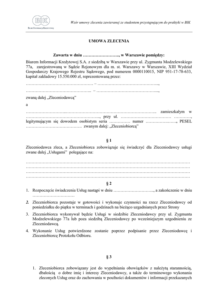 Wzór umowy zlecenia zawieranej ze studentem przystępującym do praktyki w BIK UMOWA ZLECENIA Zawarta w dniu …………………….., w Warszawie pomiędzy: Biurem Informacji Kredytowej S.A. z siedzibą w Warszawie przy ul. Zygmunta Modzelewskiego 77a, zarejestrowaną w Sądzie Rejonowym dla m. st. Warszawy w Warszawie, XIII Wydział Gospodarczy Krajowego Rejestru Sądowego, pod numerem 0000110015, NIP 951-17-78-633, kapitał zakładowy 15.550.000 zł, reprezentowaną przez: ………………………………………… – …………………………………….., ……………………………………….. – ……………………………………..., zwaną dalej „Zleceniodawcą” a ………………………..……………………………………………………….. zamieszkałym w …………………………………………….., przy ul. ……………………………… …………, legitymującym się dowodem osobistym seria …………… numer …………….……, PESEL …………………………………. zwanym dalej: „Zleceniobiorcą” §1 Zleceniodawca zleca, a Zleceniobiorca zobowiązuje się świadczyć dla Zleceniodawcy usługi zwane dalej „Usługami” polegające na: ……………………………………………………………………………………………………… ……………………………………………………………………………………………………… ……………………………………………………………………………………………………… ……………………………………………………………………………………………………… §2 1. Rozpoczęcie świadczenia Usług nastąpi w dniu ……………………….., a zakończenie w dniu ………………………… 2. Zleceniobiorca pozostaje w gotowości i wykonuje czynności na rzecz Zleceniodawcy od poniedziałku do piątku w terminach i godzinach na bieżąco uzgadnianych przez Strony 3. Zleceniobiorca wykonywał będzie Usługi w siedzibie Zleceniodawcy przy ul. Zygmunta Modzelewskiego 77a lub poza siedzibą Zleceniodawcy po wcześniejszym uzgodnieniu ze Zleceniodawcą. 4. Wykonanie Usług potwierdzone zostanie poprzez podpisanie przez Zleceniodawcę i Zleceniobiorcę Protokołu Odbioru. §3 1. Zleceniobiorca zobowiązany jest do wypełniania obowiązków z należytą starannością, dbałością o dobre imię i interesy Zleceniodawcy, a także do terminowego wykonania zleconych Usług oraz do zachowania w poufności dokumentów i informacji przekazanych Wzór umowy zlecenia zawieranej ze studentem przystępującym do praktyki w BIK mu przez Zleceniodawcę w związku z wykonywaniem Usług. 2. Zleceniobiorca nie może powierzyć wykonania Usług osobie trzeciej bez uprzedniej pisemnej zgody Zleceniodawcy. 3. Zleceniobiorca ponosi odpowiedzialność odszkodowawczą względem Zleceniodawcy za niewykonanie lub nienależyte wykonanie Usług, chyba że niewykonanie lub nienależyte wykonanie jest następstwem okoliczności, za które Zleceniobiorca nie ponosi odpowiedzialności, w szczególności, jeżeli Zleceniobiorca działał lub zaniechał działania na podstawie zaleceń Zleceniodawcy albo niewykonanie lub nienależyte wykonanie niniejszej umowy nastąpiło wskutek siły wyższej lub wyłącznie z winy Zleceniodawcy. §4 1. Zleceniodawca upoważnia swoich pracowników: ………………………………………………. do samodzielnego lub łącznego bieżącego koordynowania Usług wykonywanych przez Zleceniobiorcę, w szczególności do ich zlecania i podpisywania Protokołu Odbioru w imieniu Zleceniodawcy. Upoważnienie nie obejmuje podejmowania przez tych pracowników jakichkolwiek decyzji, które skutkowałyby zobowiązaniami finansowymi Zleceniodawcy nie przewidzianymi w niniejszej umowie. 2. Wymiana korespondencji roboczej, bezpośrednio związanej z realizacją Usług może odbywać się drogą elektroniczną na jeden z poniższych adresów e-mail: a) Zleceniodawca: ……………………………………………………… b) Zleceniobiorca ………………………………………….…...……… 3. Wszelkie zawiadomienia związane z wykonywaniem umowy powinny być doręczane listem poleconym na adresy Stron wskazane w komparycji umowy. 4. Strony zobowiązują się do niezwłocznego wzajemnego zawiadomienia o zmianie adresu dla doręczeń, pod rygorem uznania korespondencji wysłanej na dotychczasowy adres za doręczoną. 5. Strony niniejszej umowy zgodnie postanawiają, iż Strona, która nie zawiadomi o zmianie adresu dla doręczeń, ponosi odpowiedzialność za szkody wynikłe na skutek niewykonania tego obowiązku. §5 1. Zleceniodawca przekaże Zleceniobiorcy materiały i informacje niezbędne dla prawidłowego wykonywania Usług, a także zapewni odpowiednie pomieszczenia w przypadku wykonywania takich Usług w siedzibie Zleceniodawcy. 2. Materiały lub informacje, o których mowa w ust. 1, ujawnione Zleceniobiorcy w jakiejkolwiek formie, w związku z wykonywaniem Usług, Zleceniobiorca zobowiązuje się chronić i nie udostępniać osobom trzecim. 3. Zleceniobiorca niniejszym zobowiązuje się: a) zachować w tajemnicy wszelkie informacje techniczne, technologiczne, ekonomiczne, finansowe, handlowe, prawne i organizacyjne dotyczące otrzymane od Zleceniodawcy w Wzór umowy zlecenia zawieranej ze studentem przystępującym do praktyki w BIK związku z wykonywaniem zleconych Usług, niezależnie od formy przekazania tych informacji i ich źródła, b) wykorzystywać informacje jedynie w celu niezbędnym do wykonania Usług, c) nie kopiować, nie powielać ani w jakikolwiek sposób nie rozpowszechniać określonych wyżej informacji ani ich części, z wyjątkiem uzasadnionej potrzeby do celów określonych w pkt. b). W takim przypadku wszelkie kopie będą własnością Strony, która stanowi źródło informacji. 4. Wymogi zaw