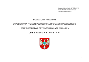 Załącznik do uchwały Nr VI/52/2011 Rady Powiatu Gnieźnieńskiego z dnia 31 marca 2011 r. POWIATOWY PROGRAM ZAPOBIEGANIA PRZESTĘPCZOŚCI ORAZ PORZĄDKU PUBLICZNEGO I BEZPIECZEŃSTWA OBYWATELI NA LATA 2011 – 2014 ,,B E Z P I E C Z N Y P O W I A T” 1 I. Założenia ogólne. 1. Powiatowy Program Zapobiegania Przestępczości oraz Porządku Publicznego i Bezpieczeostwa Obywateli na lata 2011-2014 „Bezpieczny Powiat”, zwany dalej Programem jest to kompleksowy program poprawy bezpieczeostwa na terenie powiatu, adresowany do wszystkich środowisk zainteresowanych ograniczeniem przestępczości i patologii. 2. Jest planem współdziałania organów paostwowych, samorządowych, organizacji społecznych i młodzieżowych, społeczności lokalnej i powiatowych służb, inspekcji i straży odpowiedzialnych za bezpieczeostwo publiczne. 3. Dla jego realizacji niezbędne jest zapewnienie profesjonalnej infrastruktury informacyjnej oraz tzw. obsługi medialnej. 4. Ocena skuteczności programu przez mieszkaoców powiatu będzie zależała od realizacji najprostszych działao, takich jak: gotowośd niesienia pomocy, szybka reakcja na wezwania, itp. 5. Finansowanie realizacji programu następuje z dostępnych środków budżetowych gmin i Starostwa Powiatowego, służb powiatowych oraz funduszy organizacji pozarządowych i innych funduszy celowych przeznaczonych na profilaktykę. II. Cele programu. Głównym celem programu jest poprawa stanu i poczucia bezpieczeostwa mieszkaoców. Działania programu zorientowane są w trzech obszarach: 1. Ograniczenie przestępczości, w tym: 1) czynów nieletnich, 2) przestępczości pospolitej (m.in. kradzieże, kradzieże z włamaniem, itp.), 3) przestępczości komunikacyjnej (wypadki i kolizje drogowe itp.), 4) przestępczości związanej z narkotykami, 5) inne. 2. Wzrost poczucia bezpieczeostwa, w tym: 1) bezpieczeostwo dzieci i młodzieży w okresie letniego i zimowego wypoczynku oraz w czasie imprez masowych, kulturalnych sportowych itp., 2) wdrażanie technicznych i elektronicznych systemów zabezpieczeo, 3) minimalizowanie zagrożeo komunikacyjnych (np. progi spowalniające, właściwe oznakowanie dróg, budowa zatok, objazdów, itp.), 4) eliminacja miejscowych zagrożeo mieszkaoców (np. utworzenie nowych parkingów, doświetlenie miejsc zagrożonych, itp.), 3. Ograniczenie zjawisk patologicznych, w tym: 1) przemocy w rodzinie, 2) patologii społecznej (narkomania, alkoholizm, prostytucja), 2 3) inne. Dodatkowym celem niniejszego programu jest: pozyskanie współpracowników do realizacji programu, uzyskanie akceptacji i poparcia społecznego dla prowadzonych działao, stworzenie sprawnego systemu przepływu informacji pomiędzy organami wykonawczymi jednostek samorządowych i mieszkaocami powiatu. Osiągnięcie powyższych celów będzie możliwe poprzez: prowadzenie okresowej analizy zagrożeo przestępczością i patologiami społecznymi wraz z aktualizacją mapy zagrożeo oraz planowanie na tej podstawie przedsięwzięd zmierzających do ich ograniczenia, zacieśnianie współpracy pomiędzy dzielnicowymi a mieszkaocami poprzez informację w mediach, otwieranie nowych miejsc przyjmowania interesantów przez dzielnicowych, oddziaływanie na organizacje, lokalny biznes oraz społecznośd mieszkaoców w celu włączenia ich do aktywnego uczestnictwa w poprawę bezpieczeostwa i porządku w miastach i na wsiach, propagowanie wśród społeczności określonych form zachowania się w sytuacjach zagrożenia, popularyzacja programu i pozyskiwanie jego sympatyków do współpracy, prowadzenie działalności prewencyjno - wychowawczej i edukacyjnej wśród dzieci i młodzieży III. Kierunki działania: Program podejmuje następujące zadania kierunkowe: 1. Zapewnienie porządku publicznego. 2. Działalnośd prewencyjno - wychowawcza. 3. Bezpieczeostwo komunikacyjne. 4. Wypoczynek i rekreacja. 5. Zagrożenia kryzysowe ( pożarowe, chemiczne, ekologiczne, powodziowe, medyczne, miejscowe zagrożenia itp.). 6. Zagadnienia promocyjno - informacyjne. IV. Partnerzy do współpracy przy realizacji programu: Do realizacji niniejszego programu przewidziano niżej wymienione podmioty: 1. Rada Powiatu w Gnieźnie, Rady Miejskie i Gminne wchodzące w skład powiatu gnieźnieoskiego, a zwłaszcza ich komisje: ds. bezpieczeostwa, przestrzegania ładu i porządku, oświaty i wychowania, profilaktyki i rozwiązywania problemów alkoholowych, narkomanii 2. Komenda Powiatowa Policji w Gnieźnie, 3 3. Starostwo Powiatowe, Urzędy Miast i Gmin i ich jednostki organizacyjne, 4. Dyrekcje szkół i pedagodzy szkolni, 5. Sąd Rejonowy - Wydział Rodzinny i Nieletnich, 6. Prokuratura Rejonowa, 7. Powiatowe Centrum Pomocy Rodzinie, 8. Miejskie i Gminne Ośrodki Pomocy Społecznej, 9. Poradnia Psychologiczno - Pedagogiczna, 10. Spółdzielnie i wspólnoty mieszkaniowe, 11. Redakcje wydawnictw lokalnych oraz telewizji lokalnej, 12. Komenda Powiatowa PSP, 13. Zarząd Powiatowy i Zarządy Gminne ZOSP RP, 14. Przedstawiciele organizacji społecznych i młodzieżowych, fundacji, klubów i stowarzyszeo, kościelne rady parafialne, mające w swych statutach zadania przeciwdziałania patologiom społecznym, promowanie zdrowego stylu życia, wychowanie dzieci i młodzieży. V. Planowane efekty: 1. Zwiększenie poczucia bezpieczeostwa. 2. Ograniczenie przestępstw. 3. Pogłębienie wiedzy z zakresu bezpiecznych zachowao w życiu codziennym mieszkaoców. 4. Stopniowe eliminowanie tzw. "znieczulicy społecznej" - obojętności wobec przypadków niewłaściwych zachowao (reakcja na wszelkie przestępstwa, wykroczenia, patologie, itp.). 5. Lepsze poznanie się mieszkaoców w środowiskach miejskich i podjęcie współpracy w zakresie rozwiązywania problemów występujących w miejscu zamieszkania. 6. Kreowanie zachowao w poczuciu bezpieczeostwa i wkładu ludzi w budowanie tego systemu zamiast biernego oczekiwania. 4 KOMENDA POWIATOWA POLICJI W GNIEŹNIE Lp. 1 1. 2. Obszary zagrożeo / Przedsięw