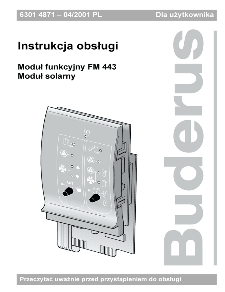 6301 4871 – 04/2001 PL Dla użytkownika Instrukcja obsługi Moduł funkcyjny FM 443 Moduł solarny Przeczytać uważnie przed przystąpieniem do obsługi Impressum Urządzenie spełnia podstawowe wymagania odpowiednich norm i dyrektyw. Zgodność z tymi normami została udokumentowana. Odnośna dokumentacja oraz deklaracja zgodności znajdują się u producenta. Zastrzega się możliwość wprowadzenia zmian technicznych! W związku ze stale prowadzonymi pracami rozwojowymi, rysunki, opisy działania, kolejność wykonywanych poleceń i dane techniczne mogą nieznacznie odbiegać od przedstawionych. Aktualizacja dokumentacji Jeżeli macie Państwo propozycje poprawienia dokumentacji lub stwierdziliście Państwo niezgodności, prosimy o kontakt. Adres producenta Buderus Heiztechnik GmbH D-35573 Wetzlar http://www.heiztechnik.buderus.de e-mail: [email protected] Nr dokumentacji: 6301 4871 Data wydania: 04/2001 Zastrzega się możliwość wprowadzenia zmian w związku z ulepszeniami technicznymi! 2 Buderus Heiztechnik GmbH • http://www.heiztechnik.buderus.de Instrukcja obsługi • Moduł funkcyjny FM 443 • Wydanie 04/2001 Spis treści 1 Bezpieczeństwo 1.1 1.2 1.3 1.4 2 . . . . . . . . . . . . . . . . . . . . . . . . . . . . . . . . .4 Zastosowanie zgodne z przeznaczeniem . . . . . . . . . . Wskazówki odnośnie bezpieczeństwa i użytkowania . . . Wskazówka bezpieczeństwa, której należy przestrzegać. Usuwanie/utylizacja . . . . . . . . . . . . . . . . . . . . . . . Moduł funkcyjny FM 443 2.1 . . . . . .4 . . . . . .5 . . . . . .6 . . . . . .6 . . . . . . . . . . . . . . . . . . . . . . . . . . .7 Ustawienia przełącznika ręcznego . . . . . . . . . . . . . . . . . . . .9 2.1.1 Przełącznik ręczny (obieg solarny 1) . . . . . . . . . . . . . . . . . . .9 2.1.2 Przełącznik ręczny (wybór obiegu solarnego) . . . . . . . . . . . . . 10 3 Funkcje modułu FM 443 3.1 3.2 4 . . . . . . . . . . . . . . . . . . . . . . . . . . 11 Zmiana trybu pracy . . . . . . . . . . . . . . . . . . . . . . . . . . . . 11 Sprawdzenie wartości parametrów roboczych . . . . . . . . . . . . 13 Usuwanie zakłóceń i usterek . Zastrzega się możliwość wprowadzenia zmian w związku z ulepszeniami technicznymi! . . . . . . . . . . . . . . . . . . . . . . 14 Buderus Heiztechnik GmbH • http://www.heiztechnik.buderus.de Instrukcja obsługi • Moduł funkcyjny FM 443 • Wydanie 04/2001 3 1 1 Bezpieczeństwo Bezpieczeństwo Rozdział ten zawiera ogólne wskazówki bezpieczeństwa, których należy przestrzegać podczas obsługi modułu funkcyjnego FM 443. Ponadto w innych rozdziałach tej instrukcji obsługi znajdują się dalsze wskazówki bezpieczeństwa, których również należy przestrzegać. Przed przystąpieniem do wykonania opisanych poniżej czynności należy dokładnie zapoznać się z przedstawionymi tu wskazówkami bezpieczeństwa. Nieprzestrzeganie podanych tu wskazówek odnoszących się do bezpieczeństwa może spowodować ciężkie szkody osobowe – ze skutkiem śmiertelnym włącznie – jak również może być przyczyną szkód materialnych i środowiskowych. 1.1 Zastosowanie zgodne z przeznaczeniem Moduł funkcyjny FM 443 przeznaczony jest do montażu w sterownikach systemu regulacyjnego Logamatic 4000. Zastrzega się możliwość wprowadzenia zmian w związku z ulepszeniami technicznymi! 4 Buderus Heiztechnik GmbH • http://www.heiztechnik.buderus.de Instrukcja obsługi • Moduł funkcyjny FM 443 • Wydanie 04/2001 Bezpieczeństwo 1.2 1 Wskazówki odnośnie bezpieczeństwa i użytkowania Przedstawione w niniejszej instrukcji obsługi wskazówki, odnoszące się do bezpieczeństwa użytkowania modułu, oznaczone zostały przy pomocy znaku ostrzegawczego. Poniżej danego znaku ostrzegawczego znajduje się ostrzeżenie wskazujące na stopień zagrożenia. Należy bezwzględnie stosować się do opisanych tu zaleceń, których celem jest przeciwdziałanie zagrożeniom! WSKAZÓWKA BEZPIECZEŃSTWA PIERWSZEGO STOPNIA NIEBEZPIECZEŃSTWO! Ostrzeżenie "Niebezpieczeństwo" wskazuje na niebezpieczeństwa, które mogą spowodować szkody osobowe ze skutkiem śmiertelnym włącznie. ZAGROŻENIE DLA ŻYCIA W WYNIKU PORAŻENIA PRĄDEM ELEKTRYCZNYM NIEBEZPIECZEŃSTWO! Znak ten wskazuje na niebezpieczeństwo porażenia prądem elektrycznym. WSKAZÓWKA BEZPIECZEŃSTWA DRUGIEGO STOPNIA UWAGA! Ostrzeżenie "Uwaga" wskazuje na niebezpieczeństwa, które mogą spowodować szkody materialne. Wskazówki praktyczne to, ogólnie rzecz biorąc, uwagi dotyczące obsługi, wskazujące na możliwe źródła błędów, które mogą stanowić zagrożenie. WSKAZÓWKA PRAKTYCZNA Wskazówki praktyczne pozwalają na optymalne, ekonomiczne, bezpiecznie i przyjazne dla środowiska wykorzystanie oraz posługiwanie się urządzeniami technicznymi. Zastrzega się możliwość wprowadzenia zmian w związku z ulepszeniami technicznymi! Buderus Heiztechnik GmbH • http://www.heiztechnik.buderus.de Instrukcja obsługi • Moduł funkcyjny FM 443 • Wydanie 04/2001 5 1 1.3 Bezpieczeństwo Wskazówka bezpieczeństwa, której należy przestrzegać Moduł funkcyjny FM 443 skonstruowany i wykonany został zgodnie ze stanem techniki oraz uznanymi zasadami dotyczącymi bezpieczeństwa i higieny pracy. Mimo to nie jest możliwe całkowite wykluczenie szkód materialnych w przypadku nieprawidłowej obsługi. Przed obsługą modułu funkcyjnego FM 443 należy się zatem dokładnie zapoznać z niniejszą instrukcją obsługi. ZAGROŻENIE DLA ŻYCIA Instalacja elektryczna pod napięciem. NIEBEZPIECZEŃSTWO! 1.4 Prace na instalacji elektrycznej mogą być wykonywane wyłącznie przez firmy specjalistyczne, posiadające odpowiednie uprawnienia. Usuwanie/utylizacja Zużyty moduł należy przekazać autoryzowanej firmie w celu usunięcia/utylizacji w sposób zgodny z wymaganiami ochrony środowiska naturalnego. Zastrzega się możliwość wprowadzenia zmian w związku z ulepszeniami technicznymi! 6 Buderus Heiztechnik GmbH • htt