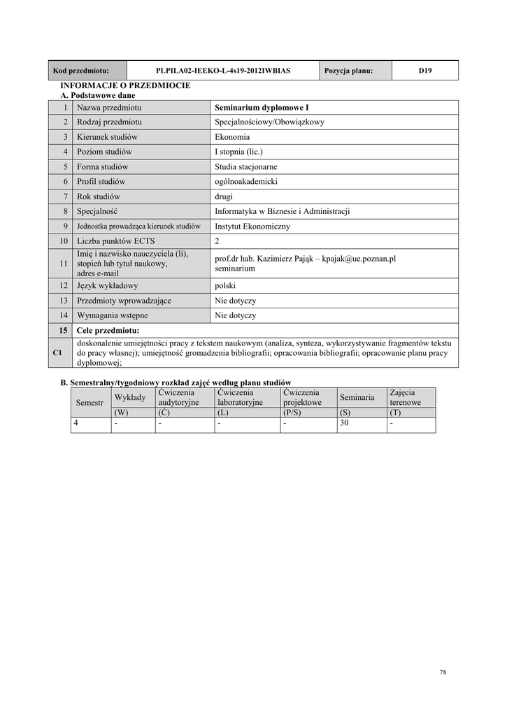 Kod przedmiotu: PLPILA02-IEEKO-L-4s19-2012IWBIAS INFORMACJE O PRZEDMIOCIE A. Podstawowe dane 1 Nazwa przedmiotu Pozycja planu: D19 Seminarium dyplomowe I 2 Rodzaj przedmiotu Specjalnościowy/Obowiązkowy 3 Kierunek studiów Ekonomia 4 Poziom studiów I stopnia (lic.) 5 Forma studiów Studia stacjonarne 6 Profil studiów ogólnoakademicki 7 Rok studiów drugi 8 Specjalność Informatyka w Biznesie i Administracji 9 Jednostka prowadząca kierunek studiów Instytut Ekonomiczny 2 12 Liczba punktów ECTS Imię i nazwisko nauczyciela (li), stopień lub tytuł naukowy, adres e-mail Język wykładowy 13 Przedmioty wprowadzające Nie dotyczy 14 Wymagania wstępne Nie dotyczy 15 Cele przedmiotu: doskonalenie umiejętności pracy z tekstem naukowym (analiza, synteza, wykorzystywanie fragmentów tekstu do pracy własnej); umiejętność gromadzenia bibliografii; opracowania bibliografii; opracowanie planu pracy dyplomowej; 10 11 C1 prof.dr hab. Kazimierz Pająk – [email protected] seminarium polski B. Semestralny/tygodniowy rozkład zajęć według planu studiów Ćwiczenia Ćwiczenia Ćwiczenia Wykłady audytoryjne laboratoryjne projektowe Semestr (W) (Ć) (L) (P/S) 4 - Seminaria (S) 30 Zajęcia terenowe (T) - 78 PRZEDMIOTOWE EFEKTY KSZTAŁCENIA (wg KRK) Efekt EP1 Odniesienie przedmiotowych efektów kształcenia do efektów kształcenia dla celów kierunku obszaru Po zakończeniu przedmiotu i potwierdzeniu osiągnięcia efektów kształcenia student: Przygotowanie min. 20 stron tekstu zawierającego przegląd literatury. K_W25 K_U29 K_K16 C1 S1A_W02 S1A_W03 S1A_W07 S1A_W08 S1A_W09 S1A_U09 S1A_U11 S1A_K05 TREŚCI PROGRAMOWE ODNIESIONE DO EFEKTÓW KSZTAŁCENIA T Treści programowe liczba godzin EP 2 2 2 2 2 2 2 2 2 2 2 2 2 2 2 EP1 EP1 EP1 EP1 EP1 EP1 EP1 EP1 EP1 EP1 EP1 EP1 EP1 EP1 EP1 Forma: seminarium T1C T2C T3C T4C T5C T6C T7C T8C T9C T10C T11C T12C T13C T14C T15C Konsultacje grupowe i indywidualne Konsultacje grupowe i indywidualne Konsultacje grupowe i indywidualne Konsultacje grupowe i indywidualne Konsultacje grupowe i indywidualne Konsultacje grupowe i indywidualne Konsultacje grupowe i indywidualne Konsultacje grupowe i indywidualne Konsultacje grupowe i indywidualne Konsultacje grupowe i indywidualne Konsultacje grupowe i indywidualne Konsultacje grupowe i indywidualne Konsultacje grupowe i indywidualne Konsultacje grupowe i indywidualne Konsultacje grupowe i indywidualne LITERATURA Literatura podstawowa Kuziak M., Rzepczyński S., Jak pisać?, PWN, Warszawa 2008 Zenderowski R., Praca magisterska, licencjat. Krótki przewodnik po metodologii pisania i obrony pracy dyplomowej, CeDeWu, Warszawa 2009 METODY DYDAKTYCZNE Forma kształcenia Seminarium Metody dydaktyczne METODY WERYFIKACJI PRZEDMIOTOWYCH EFEKTÓW KSZTAŁCENIA Przedmiotowy efekt kształcenia Forma oceny E E T P U K S W S U P R O D EP1 S E x PS K I EP – egzamin pisemny EU – egzamin ustny T – test K – kolokwium P – prezentacja D – dyskusja KI – konsultacje indywidualne SW – sprawdzian wiedzy R – raport/referat SE – seminarium SU – sprawdzenie umiejętności praktycznych O – obserwacja w czasie zajęć PS – prace samokształceniowe studentów 79 KRYTERIA OCENY OSIĄGNIĘCIA PRZEDMIOTOWYCH EFEKTÓW KSZTAŁCENIA Kryteria oceny Efekt kształcenia EP1 2 3 - 3,5 4 – 4,5 5 Nie uczestniczy w zajęciach lub nie przedstawi oczekiwanego (min. 20 stron) tekstu, przygotowanego zgodnie z wymogami pracy dyplomowej. Nie uczestniczy systematycznie uczestniczy w zajęciach lub zgłasza nieprzygotowanie. Przedstawi prawidłowo skonstruowany tekst (min. 20 stron). Tekst może zawierać drobne błędy w przypisach oraz drobne błędy językowe. Systematycznie uczestniczy w zajęciach. Przedstawi prawidłowo skonstruowany tekst (min. 20 stron). Tekst może zawierać drobne błędy w przypisach oraz drobne błędy językowe. Systematycznie uczestniczy w zajęciach. Przedstawi prawidłowo skonstruowany tekst (min. 20 stron), w szczególności zawierający adekwatne do tekstu przypisy. Tekst napisany zgodnie z zasadami pisowni w języku polskim, starannie sformatowany. SPOSOBY OCENIANIA I WARUNKI ZALICZENIA W POSZCZEGÓLNYCH FORMACH KSZTAŁCENIA Seminarium – na bieżąco przeglądany i poddawany systematycznym korektom tekst pracy dyplomowej OCENA KOŃCOWA PRZEDMIOTU Składowa oceny końcowej: Procentowy udział składowej w ocenie końcowej: Zaliczenie seminarium 100% RAZEM 100 % NAKŁAD PRACY STUDENTA – BILANS GODZIN I PUNKTÓW ECTS Obciążenie studenta Liczba godzin Lp. Aktywność studenta 1 Udział w zajęciach dydaktycznych Przygotowanie do zajęć (studiowanie literatury): Seminarium: 30 * 1 = 30 godz. 30 7 Łączny nakład pracy studenta 60 8 Punkty ECTS za przedmiot 2 ECTS 9 Nakład pracy studenta związany z zajęciami o charakterze praktycznym Nakład pracy związany z zajęciami wymagającymi bezpośredniego udziału nauczycieli akademickich 1 ECTS 2 10 30 1 ECTS ZATWIERDZENIE SYLABUSA: Opracował Sprawdził pod względem formalnym Zatwierdził Stanowisko Tytuł/stopień naukowy, imię nazwisko prof. dr hab. Kazimierz Pająk Podpis Kierownik Zakładu Zarządzania Małymi i Średnimi Przedsiębiorstwami Dyrektor Instytutu Ekonomicznego 80