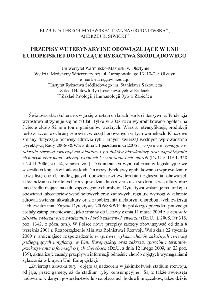 138 ELŻBIETA TERECH-MAJEWSKA*, JOANNA GRUDNIEWSKA**, ANDRZEJ K. SIWICKI** PRZEPISY WETERYNARYJNE OBOWIĄZUJĄCE W UNII EUROPEJSKIEJ DOTYCZĄCE RYBACTWA ŚRÓDLĄDOWEGO Uniwersytet Warmińsko-Mazurski w Olsztynie Wydział Medycyny Weterynaryjnej, ul. Oczapowskiego 13, 10-718 Olsztyn e-mail: [email protected] ** Instytut Rybactwa Śródlądowego im. Stanisława Sakowicza Zakład Hodowli Ryb Łososiowatych w Rutkach *** Zakład Patologii i Immunologii Ryb w Żabieńcu * Światowa akwakultura rozwija się w ostatnich latach bardzo intensywnie. Tendencja wzrostowa utrzymuje się od 50 lat. Tylko w 2008 roku wyprodukowano ogółem na świecie około 52 mln ton organizmów wodnych. Wraz z intensyfikacją produkcji rosło znaczenie ochrony zdrowia zwierząt hodowanych w tych warunkach. Kluczowe zmiany dotyczące ochrony zdrowia ryb i innych zwierząt wodnych wprowadzono Dyrektywą Rady 2006/88/WE z dnia 24 października 2006 r. w sprawie wymogów w zakresie zdrowia zwierząt akwakultury i produktów akwakultury oraz zapobiegania niektórym chorobom zwierząt wodnych i zwalczania tych chorób (Dz.Urz. UE L 328 z 24.11.2006, str. 14, z późn. zm.). Dokument ten wymusił zmiany legislacyjne we wszystkich krajach członkowskich. Na mocy dyrektywy opublikowano i wprowadzono: nową listę chorób podlegających obowiązkowi zwalczania i zgłaszania, obowiązek zatwierdzania określonych rodzajów działalności z zakresu sektora akwakultury oraz inne środki mające na celu zapobieganie chorobom. Dyrektywa wskazuje na funkcje i obowiązki laboratoriów wspólnotowych oraz krajowych, reguluje wymogi w zakresie zdrowia zwierząt akwakultury oraz zapobiegania niektórym chorobom tych zwierząt i ich zwalczania. Zapisy Dyrektywy 2006/88/WE do polskiego porządku prawnego zostały zaimplementowane, jako zmiany do Ustawy z dnia 11 marca 2004 r. o ochronie zdrowia zwierząt oraz zwalczaniu chorób zakaźnych zwierząt (Dz.U. tj. 2008, Nr 313, poz. 1342, z późn. zm.). W Polsce nowe przepisy zaczęły obowiązywać od dnia 8 września 2008 r. Rozporządzenie Ministra Rolnictwa i Rozwoju Wsi z dnia 22 stycznia 2009 r. zmieniające rozporządzenie w sprawie wykazu chorób zakaźnych zwierząt podlegających notyfikacji w Unii Europejskiej oraz zakresu, sposobu i terminów przekazywania informacji o tych chorobach (Dz.U. z dnia 12 lutego 2009, nr. 23 poz. 139), aktualizuje zasady przepływu informacji odnośnie chorób objętych wymaganiami zgłaszania w krajach Unii Europejskiej. „Zwierzęta akwakultury” objęte są nadzorem w jakimkolwiek stadium rozwoju, od jaja, przez gamety, aż do stadium ryby konsumpcyjnej. Są to także zwierzęta hodowane w danym gospodarstwie lub na obszarach hodowli mięczaków, także dzikie PRZEPISY WETERYNARYJNE OBOWIĄZUJĄCE W UNII EUROPEJSKIEJ ... 139 zwierzęta wodne przeznaczone do hodowli w danym gospodarstwie lub na obszarze hodowli mięczaków. Wśród nich wymienia się: ryby należące do nadgromady bezżuchwowców (Agnatha) oraz gromad ryb chrzęstnych (Chondrichthytes) i ryb kostnych (Osteichthyes), mięczaki należące do typu Mollusca oraz skorupiaki należące do podtypu Crustacea. Każda z form działalności gospodarczej związanej bezpośrednio lub pośrednio z akwakulturą podlega nadzorowi Państwowej Inspekcji Weterynaryjnej. Bezpośrednim organem nadzorującym jest Powiatowy Lekarz Weterynarii w miejscu, w którym znajduje się obiekt. Nadzór zaczyna się od zgłoszenia działalności i nadania numeru identyfikacyjnego. Uproszczona forma dotyczy: innych miejsc niż przedsiębiorstwa produkcyjne sektora akwakultury, w których zwierzęta wodne są utrzymywane bez zamiaru umieszczania na rynku, łowiska typu „wpuść i złów” oraz przedsiębiorstwa produkcyjne sektora akwakultury, umieszczające na rynku zwierzęta akwakultury wyłącznie w celu spożycia przez ludzi. Natomiast obowiązkowi rejestracji i zatwierdzenia podlegają: przedsiębiorstwa produkcyjne sektora akwakultury (typowe hodowle), zakłady przetwórcze przetwarzający lub poddający ubojowi zwierzęta akwakultury w ramach zwalczania chorób zakaźnych tych zwierząt. Powiatowy lekarz weterynarii wydaje decyzję na wniosek podmiotu zamierzającego prowadzić działalność nadzorowaną, złożony co najmniej na 30 dni przed planowanym rozpoczęciem działalności. Taką decyzję podmiot wnioskujący może uzyskać tylko jeśli zostaną spełnione wymagania weterynaryjne, określone dla umieszczania na rynku zwierząt akwakultury i wprowadzania ich na obszar Wspólnoty z krajów trzecich (Rozporządzenie Ministra Rolnictwa i Rozwoju Wsi z dnia 14 października 2008 r. w sprawie szczegółowych wymagań weterynaryjnych dla prowadzenia działalności w zakresie sektora akwakultury – Dz.U. z 2008 r. Nr 190, poz. 1167). Lista zatwierdzonych podmiotów udostępniona jest do wglądu na stronie internetowej [www.wetgiw.gov.pl/index.php?action=art&a_id=3425]. Choroby podlegające ukierunkowanej kontroli podzielono na choroby: • Egzotyczne, niewystępujące w akwakulturze Wspólnoty, dla których brak jest informacji o występowaniu jej czynników etiologicznych w wodach Wspólnoty. Są to choroby o istotnym znaczeniu gospodarczym, powodujące znaczne straty w obsadach, które mogą przenosić się na dzikie gatunki zwierząt wodnych (w tym chronionych). Wobec nich sporządzane są plany gotowości na mocy Rozporządzenie Ministra Rolnictwa i Rozwoju Wsi z dnia 21 listopada 2008 r. w sprawie wykazu chorób zakaźnych zwierząt, dla których sporządza się plany gotowości ich zwalczania (Dz.U. z 2008 r. Nr 218, poz. 1397). • Nieegzotyczne, to choroby niewystępujące we wszystkich krajach członkowskich lub ich regionach, które są trudne do zwalczenia i opanowania bez zachowania rygorystycznych środków zwalczania oraz ograniczeń w handlu. Wobec tych chorób w celu ich opanowania opracowuje się stałe programy zwalczania: Rozporządzenie Ministra Rolnictwa i Rozwoju Wsi z dnia 6 lut