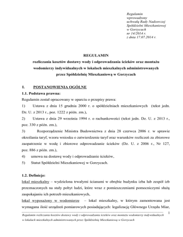 Regulamin wprowadzony uchwałą Rady Nadzorczej Spółdzielni Mieszkaniowej w Gorzycach nr 14/2014 r. z dnia 17.07.2014 r. REGULAMIN rozliczania kosztów dostawy wody i odprowadzania ścieków oraz montażu wodomierzy indywidualnych w lokalach mieszkalnych administrowanych przez Spółdzielnię Mieszkaniową w Gorzycach I. POSTANOWIENIA OGÓLNE 1.1. Podstawa prawna: Regulamin został opracowany w oparciu o przepisy prawa: 1) Ustawa z dnia 15 grudnia 2000 r. o spółdzielniach mieszkaniowych (tekst jedn. Dz. U. z 2013 r., poz. 1222 z późn. zm.), 2) Ustawa z dnia 29 września 1994 r. o rachunkowości (tekst jedn. Dz. U. z 2013 r., poz. 330 z późn. zm.), 3) Rozporządzenie Ministra Budownictwa z dnia 28 czerwca 2006 r. w sprawie określania taryf, wzoru wniosku o zatwierdzenie taryf oraz warunków rozliczeń za zbiorowe zaopatrzenie w wodę i zbiorowe odprowadzanie ścieków (Dz. U. z 2006 r., Nr 127, poz. 886 z późn. zm.), 4) umowa na dostawę wody i odprowadzanie ścieków, 5) Statut Spółdzielni Mieszkaniowej w Gorzycach. 1.2. Definicje: lokal mieszkalny – wydzielona trwałymi ścianami w obrębie budynku izba lub zespół izb przeznaczonych na stały pobyt ludzi, które wraz z pomieszczeniami pomocniczymi służą zaspokajaniu ich potrzeb mieszkaniowych, lokal wyposażony w wodomierze – lokal mieszkalny, w którym zamontowana jest wymagana ilość urządzeń pomiarowych posiadających: legalizację Głównego Urzędu Miar, ----------------------------------------------------------------------------------------------------------------------------------------------------------------------------- Regulamin rozliczania kosztów dostawy wody i odprowadzania ścieków oraz montażu wodomierzy indywidualnych w lokalach mieszkalnych administrowanych przez Spółdzielnię Mieszkaniową w Gorzycach 1 które działają w systemie akceptowalnym przez Spółdzielnię, posiadają oplombowanie wykonane przez służby techniczne Spółdzielni oraz odpowiednią dokumentację odbioru wykonaną przez te służby, cena wody – ustalona przez Radę Gminy opłata za 1 m³ wody pobieranej z urządzeń zbiorowego zaopatrzenia w wodę i za 1 m³ ścieków odprowadzanych do zbiorczych urządzeń kanalizacyjnych, opłata zaliczkowa – opłata za wodę i ścieki podlegająca rozliczeniu po dokonaniu okresowych odczytów wodomierzy lokalowych, przedpłata ryczałtowa – opłata za wodę i ścieki nie podlegająca zwrotowi, przy czym w przypadku lokali nieopomiarowanych, w stosunku do których naliczane są opłaty ryczałtowe istnieje możliwość ponoszenia dodatkowych opłat przewidzianych w niniejszym regulaminie, okres rozliczeniowy – okres, za który zgodnie z decyzją Zarządu Spółdzielni dokonuje się odczytu wskazań wodomierzy i rozliczenia opłat zaliczkowych, jak również okres, po którym dokonuje się dodatkowych obciążeń przewidzianych w niniejszym regulaminie, wodomierz główny – wodomierz służący do rozliczenia opłat za wodę i ścieki pomiędzy Spółdzielnią a dostawcą, wodomierz lokalowy (indywidualny) – wodomierz działający w systemie funkcjonującym w Spółdzielni, służący do rozliczenia opłat zaliczkowych pomiędzy Spółdzielnią a użytkownikiem lokalu, użytkownicy lokali – członkowie spółdzielni posiadający spółdzielcze lokatorskie prawo do lokalu, spółdzielcze własnościowe prawo do lokalu, właściciele lokali będący członkami, właściciele lokali niebędący członkami spółdzielni, osoby niebędące członkami, którym przysługują spółdzielcze własnościowe prawa do lokali, najemcy lokali, użytkownicy lokali bez tytułu prawnego, osoby zamieszkałe w lokalu – wszystkie osoby zameldowane na pobyt stały lub czasowy oraz osoby faktycznie korzystające z lokalu, jak również inne osoby ujęte przez osobę posiadającą tytuł prawny do lokalu w składanym oświadczeniu o liczbie osób zamieszkałych. ----------------------------------------------------------------------------------------------------------------------------------------------------------------------------- Regulamin rozliczania kosztów dostawy wody i odprowadzania ścieków oraz montażu wodomierzy indywidualnych w lokalach mieszkalnych administrowanych przez Spółdzielnię Mieszkaniową w Gorzycach 2 1.3. Postanowienia wstępne: 1. Niniejszy regulamin określa zasady rozliczania kosztów dostawy wody i odprowadzania ścieków w lokalach mieszkalnych administrowanych przez Spółdzielnię Mieszkaniową w Gorzycach oraz reguluje zasady montażu i użytkowania wodomierzy indywidualnych w tych lokalach. 2. W lokalach mieszkalnych administrowanych przez Spółdzielnię Mieszkaniową w Gorzycach mogą być instalowane wodomierze indywidualne, a użytkownicy mieszkań mogą być rozliczani według ich wskazań, z zastrz. pkt. 6 niniejszego paragrafu. Instalacja wodomierzy może nastąpić w każdym przypadku za zgodą Spółdzielni Mieszkaniowej, która równocześnie określa warunki ich montażu i dokonuje odbioru urządzenia. 3. W celu równego traktowania wszystkich użytkowników oraz ujednolicenia zasad rozliczania kosztów zużycia wody i odprowadzania ścieków dąży się do wyposażenia każdego lokalu w wodomierze z modułem do odczytu drogą radiową. 4. Za przygotowanie miejsca pod montaż i dojścia do wodomierza odpowiedzialnym jest lokator. 5. Opomiarowanie zużycia wody obejmować musi bezwzględnie wszystkie punkty czerpalne w lokalu. 6. W przypadku ujęcia prac modernizacyjnych polegających na wymianie i montażu wodomierzy mieszkaniowych oraz kosztów z tym związanych w planie rzeczowofinansowym robót remontowych, wodomierze stają się własnością Spółdzielni, a instalacja i przyjęcie do eksploatacji tych wodomierzy następuje na zasadach określonych przez Spółdzielnię. W takim przypadku rozliczenia mogą być dokonywane tylko w oparciu o wskazania wodomierzy zamówionych przez Spółdzielnię. Wówczas brak jest możliwości przyj