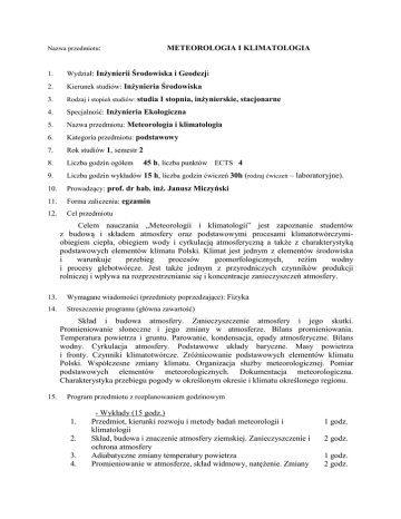 Nazwa przedmiotu: Meteorologia i klimatologia