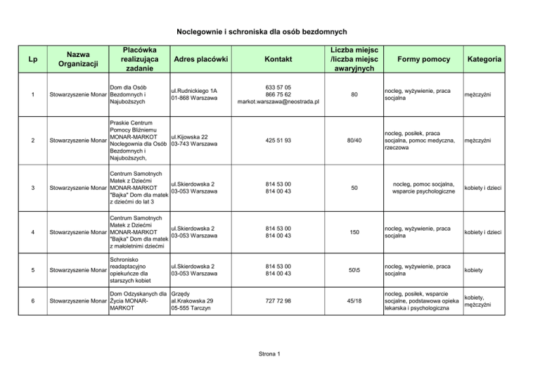 Noclegownie i schroniska dla osób bezdomnych Lp Nazwa Organizacji Placówka realizująca zadanie Adres placówki Kontakt Liczba miejsc /liczba miejsc awaryjnych 633 57 05 866 75 62 [email protected] 80 Formy pomocy Kategoria 1 Dom dla Osób Stowarzyszenie Monar Bezdomnych i NajuboŜszych 2 Praskie Centrum Pomocy Bliźniemu ul.Kijowska 22 MONAR-MARKOT Stowarzyszenie Monar Noclegownia dla Osób 03-743 Warszawa Bezdomnych i NajuboŜszych, 425 51 93 80/40 3 Centrum Samotnych Matek z Dziećmi ul.Skierdowska 2 Stowarzyszenie Monar MONAR-MARKOT 03-053 Warszawa "Bajka" Dom dla matek z dziećmi do lat 3 814 53 00 814 00 43 50 4 Centrum Samotnych Matek z Dziećmi ul.Skierdowska 2 Stowarzyszenie Monar MONAR-MARKOT 03-053 Warszawa "Bajka" Dom dla matek z małoletnimi dziećmi 814 53 00 814 00 43 150 nocleg, wyŜywienie, praca socjalna kobiety i dzieci 5 Schronisko readaptacyjno Stowarzyszenie Monar opiekuńcze dla starszych kobiet 814 53 00 814 00 43 50\5 nocleg, wyŜywienie, praca socjalna kobiety 6 Dom Odzyskanych dla Grzędy Stowarzyszenie Monar śycia MONARal.Krakowska 29 MARKOT 05-555 Tarczyn 727 72 98 45/18 nocleg, posiłek, wsparcie socjalne, podstawowa opieka lekarska i psychologiczna kobiety, męŜczyźni ul.Rudnickiego 1A 01-868 Warszawa ul.Skierdowska 2 03-053 Warszawa Strona 1 nocleg, wyŜywienie, praca socjalna męŜczyźni nocleg, posiłek, praca socjalna, pomoc medyczna, rzeczowa męŜczyźni nocleg, pomoc socjalna, wsparcie psychologiczne kobiety i dzieci Noclegownie i schroniska dla osób bezdomnych Kontakt Liczba miejsc /liczba miejsc awaryjnych ul. Marywilska 44 03-042 Warszawa 614 24 73 676 99 97 35 nocleg, posiłek, wsparcie socjalne, podstawowa opieka lekarska i psychologiczna kobiety, męŜczyźni ul. Marywilska 44 03-042 Warszawa 614 24 73 676 99 97 20 nocleg, posiłek, wsparcie socjalne, podstawowa opieka lekarska i psychologiczna kobiety, męŜczyźni 9 Centrum Pomocy Bliźniemu schronisko ul. Marywilska 44 Stowarzyszenie Monar readaptacyjne dla osób 03-042 Warszawa z zaburzeniami psychicznymi 615 24 73 676 99 97 10 nocleg, posiłek, wsparcie socjalne, podstawowa opieka lekarska i psychologiczna kobiety, męŜczyźni 10 Noclegownia wczesnej ul.Marywilska 44 Stowarzyszenie Monar pomocy dla młodych 03-042 Warszawa ludzi bezdomnych 616 24 73 676 99 97 35 nocleg, posiłek, wsparcie socjalne, podstawowa opieka lekarska i psychologiczna kobiety, męŜczyźni 11 Niskoprogowa noclegownia dla osób ul.Skaryszewska 19 Stowarzyszenie Monar Bezdomnych i 03-802 Warszawa NajuboŜszych MONARMARKOT 499 80 29 300 nocleg, posiłek, pomoc socjalna, podstawowa opieka lekarska męŜczyźni, kobiety nocleg, wyŜywienie, praca socjalna byli więźniowie, męŜczyźni Lp 7 8 Nazwa Organizacji Placówka realizująca zadanie Centrum Pomocy Bliźniemu readaptacyjne Stowarzyszenie Monar schronisko dla osób bezdomnych po podstawowej terapii alkoholowej Centrum Pomocy Bliźniemu dom Stowarzyszenie Monar readaptacyjny dla młodzieŜy defaworyzowanej Adres placówki Formy pomocy Kategoria 12 Stowarzyszenie Penitencjarne PATRONAT Dom Readaptacyjny PATRONAT ul.Siennicka 48 04-393 Warszawa 813 22 15 23\10 13 Stowarzyszenie Otwarte Drzwi "Dom za Bramą" Centrum pomocy Wzajemnej ul. Targowa 82 03-448 Warszawa 619 85 01 20 męŜczyźni po nocleg, posiłki, praca socjalna terapii odwykowej 14 Stowarzyszenie Samopomocy Bursa im. H.Ch. Kofoeda Bursa im. H. CH. Kofoeda ul.Lniana 1 03-889 Warszawa 678 53 52 24 pobyt, wyŜywienie, kobiety, przyuczenie do zawodu, praca męŜczyźni socjalna Strona 2 Noclegownie i schroniska dla osób bezdomnych Lp 15 16 Nazwa Organizacji Placówka realizująca zadanie Kontakt Liczba miejsc /liczba miejsc awaryjnych 679 07 03 35\10 478 21 38 478 30 22 [email protected] 80 Adres placówki Towarzystwo Pomocy ul.Knyszyńska 1 Schronisko dla im. św. Brata Alberta Bezdomnych MęŜczyzn 03-647 Warszawa Koło Warszawskie Kamiliańska Misja Pomocy Społecznej Pensjonat Socjalny "Św. Łazarz" ul.Traktorzystów 26 02-495 Warszawa Formy pomocy Kategoria pobyt, wyŜywienie, praca socjalna, terapia odwykowa męŜczyźni pobyt, wyŜywienie, praca socjalna, opieka duszpasterska męŜczyźni 17 Wspólnota CHLEB śYCIA Dom dla Ludzi Bezdomnych ul.Łopuszańska 17 02-220 Warszawa 846 66 44 30 nocleg, wyŜywienie, praca socjalna 18 Wspólnota CHLEB śYCIA Noclegownia dla Kobiet ul.Stawki 27 01-040 Warszawa 838 44 50 45 nocleg, wyŜywienie, praca socjalna, pomoc medyczna, kobiety i męŜczyźni, głównie młodzieŜ ucząca się lub pracująca kobiety, matki z dziećmi, 19 Wspólnota CHLEB śYCIA Schronisko dla chorych ul.Potrzebna 55 ludzi bezdomnych 02-448 Warszawa 474 57 14 90 stacjonarna opieka lekarska i pielęgniarska chore osoby bezdomne 20 Caritas Archidiecezji Warszawskiej nocleg, praca socjalna męŜczyźni 21 Caritas Archidiecezji Warszawskiej nocleg, posiłki, praca socjalna męŜczyźni, kobiety 22 Caritas Archidiecezji Warszawskiej nocleg, wyŜywienie, praca socjalna męŜczyźni 23 24 Noclegownia "Przystań" Ośrodek Charytatywny Tylko z Darów Miłosierdzia, Schronisko dla bezdomnych Ośrodek Charytatywny Tylko z Darów Miłosierdzia, Noclegownia dla bezdomnych ul.Wolska 172 01-258 Warszawa 877 37 46 86\30 ul.śytnia 3/9 01-014 Warszawa 838 70 25 110 ul.śytnia 3/9 01-014 Warszawa 838 70 25 90\50 Polski Komitet Pomocy Noclegownia Centrum ul.Burakowska 16 Społecznej Pomocy PKPS 01-066 Warszawa Stowarzyszenie Noclegownia dla Pomocy Bezdomnym bezdomnych 836 85 73 ul.Przyce 17a 01-252 Warszawa 838 72 32 474 52 74 Strona 3 200 130 nocleg, posiłek, praca socjalna, pomoc medyczna, męŜczyźni rzeczowa oraz psychologicznoterapeutyczna nocleg, posiłek w okresie jesienno zimowym osoby bezdomne, zwłaszcza z dworców kolejowych Noclegownie i schroniska dla osób bezdomnych Lp 25 26 Nazwa Organizacji Zgromadzenie Małe Dzieło Boskiej Opatrzności Orioniści Czarna k. Wołomina Zgromadzenie Małe Dzieło Boskiej Opatrzności-Łaźniew Placówka realizująca zadanie Adres placówki Kontakt Li