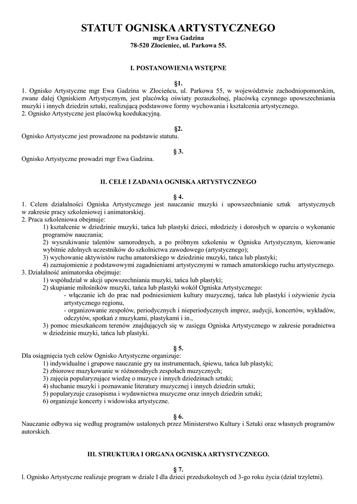 STATUT OGNISKA ARTYSTYCZNEGO mgr Ewa Gadzina 78-520 Złocieniec, ul. Parkowa 55. I. POSTANOWIENIA WSTĘPNE §1. 1. Ognisko Artystyczne mgr Ewa Gadzina w Złocieńcu, ul. Parkowa 55, w województwie zachodniopomorskim, zwane dalej Ogniskiem Artystycznym, jest placówką oświaty pozaszkolnej, placówką czynnego upowszechniania muzyki i innych dziedzin sztuki, realizującą podstawowe formy wychowania i kształcenia artystycznego. 2. Ognisko Artystyczne jest placówką koedukacyjną. §2. Ognisko Artystyczne jest prowadzone na podstawie statutu. § 3. Ognisko Artystyczne prowadzi mgr Ewa Gadzina. II. CELE I ZADANIA OGNISKA ARTYSTYCZNEGO § 4. 1. Celem działalności Ogniska Artystycznego jest nauczanie muzyki i upowszechnianie sztuk artystycznych w zakresie pracy szkoleniowej i animatorskiej. 2. Praca szkoleniowa obejmuje: 1) kształcenie w dziedzinie muzyki, tańca lub plastyki dzieci, młodzieży i dorosłych w oparciu o wykonanie programów nauczania; 2) wyszukiwanie talentów samorodnych, a po próbnym szkoleniu w Ognisku Artystycznym, kierowanie wybitnie zdolnych uczestników do szkolnictwa zawodowego (artystycznego); 3) wychowanie aktywistów ruchu amatorskiego w dziedzinie muzyki, tańca lub plastyki; 4) zaznajomienie z podstawowymi zagadnieniami artystycznymi w ramach amatorskiego ruchu artystycznego. 3. Działalność animatorska obejmuje: 1) współudział w akcji upowszechniania muzyki, tańca lub plastyki; 2) skupianie miłośników muzyki, tańca lub plastyki wokół Ogniska Artystycznego: - włączanie ich do prac nad podniesieniem kultury muzycznej, tańca lub plastyki i ożywienie życia artystycznego regionu, - organizowanie zespołów, periodycznych i nieperiodycznych imprez, audycji, koncertów, wykładów, odczytów, spotkań z muzykami, plastykami i in., 3) pomoc mieszkańcom terenów znajdujących się w zasięgu Ogniska Artystycznego w zakresie poradnictwa w dziedzinie muzyki, tańca lub plastyki. § 5. Dla osiągnięcia tych celów Ognisko Artystyczne organizuje: 1) indywidualne i grupowe nauczanie gry na instrumentach, śpiewu, tańca lub plastyki; 2) zbiorowe muzykowanie w różnorodnych zespołach muzycznych; 3) zajęcia popularyzujące wiedzę o muzyce i innych dziedzinach sztuki; 4) słuchanie muzyki i poznawanie literatury muzycznej i innych dziedzin sztuki; 5) popularyzuje czasopisma i wydawnictwa muzyczne oraz innych dziedzin sztuki; 6) organizuje koncerty i widowiska artystyczne. § 6. Nauczanie odbywa się według programów ustalonych przez Ministerstwo Kultury i Sztuki oraz własnych programów autorskich. III. STRUKTURA I ORGANA OGNISKA ARTYSTYCZNEGO. § 7. l. Ognisko Artystyczne realizuje program w dziale I dla dzieci przedszkolnych od 3-go roku życia (dział trzyletni). 2. Ognisko Artystyczne realizuje program nauczania w dziale II dla dzieci od 6 roku życia (dział sześcioletni). 3. Ognisko Artystyczne realizuje program nauczania w dziale III dla młodzieży i dorosłych od 12 roku życia (dział czteroletni). 4. Ognisko Artystyczne realizuje program nauczania w dziale IV dla młodzieży i dorosłych po ukończeniu II lub III działu nauczania (dział dwuletni). §8. 1. Ognisko Artystyczne może prowadzić punkty nauczania (filie) na terenie całej Polski. 2. Punkty nauczania podlegają administracyjnie i merytorycznie macierzystemu Ognisku Artystycznemu. § 9. Organami Ogniska Artystycznego są: 1) Dyrektor, 2) Rada Pedagogiczna. § 10. l. Dyrektor Ogniska Artystycznego jest odpowiedzialny za całokształt pracy Ogniska Artystycznego: za organizację, poziom i wyniki pracy dydaktycznej i wychowawczej, jak również za administrację i gospodarkę. 2. Do obowiązków Dyrektora należy w szczególności: l) reprezentowanie interesów Ogniska Artystycznego wobec władz i społeczeństwa oraz troska o jego rozwój; 2) współudział w zabezpieczeniu środków materialnych i rzeczowych niezbędnych do prowadzenia działalności; 3) zatwierdzanie planów pracy oraz udzielanie pomocy w ich realizowaniu; 4) organizowanie imprez i kierowanie pracą Ogniska Artystycznego; 5) odbywanie narad i konferencji z pracownikami Ogniska Artystycznego i Radą Pedagogiczną; 6) zatrudnianie i zwalnianie pracowników pedagogicznych, administracyjnych i pomocniczych; 7) współdziałanie z instytucjami i organizacjami społecznymi oraz współpraca z placówkami upowszechniania kultury. 3. Obowiązki i prawa pracowników pedagogicznych oraz pozostałych pracowników , określa- Kodeks Pracy. § 11. l. Rada Pedagogiczna Ogniska Artystycznego jest organem kolektywnym. 2. W skład Rady Pedagogicznej wchodzą: Dyrektor Ogniska Artystycznego - jako Przewodniczący oraz wszyscy pracownicy pedagogiczni. 3. Do zakresu działania Rady Pedagogicznej należy w szczególności: l) zatwierdzanie dydaktycznych i wychowawczych planów pracy oraz ich realizacja; 2) wnioskowanie w sprawie działalności merytorycznej Ogniska Artystycznego; 3) klasyfikacja uczniów i ogólna ocena ich postępów; 4) wnioskowanie i podejmowanie uchwał we wszystkich innych sprawach przedłożonych przez Dyrektora; 5) współudział w akcji rekrutacyjnej Ogniska Artystycznego. 4. Rada Pedagogiczna może wyłonić odpowiednie komisje dla różnych zagadnień i spraw. IV. UCZNIOWIE I UCZESTNICY OGNISKA ARTYSTYCZNEGO. § 12. Na pierwszy rok nauki w Ognisku Artystycznym może być przyjęty każdy, kto posiada zamiłowanie i podstawowe uzdolnienia artystyczne oraz spełni wymagane warunki. § 13. Podstawą rozpoczęcia nauki w Ognisku Artystycznym jest podpisanie przez kandydata lub jego prawnych opiekunów ustalonej deklaracji (umowy), w której podpisujący zobowiązuje się do przestrzegania regulaminu i terminowego wnoszenia ustalonych opłat. § 14. 1. Uczniowie przechodzący z innej placówki mogą być przyjęci bez egzaminu wstępnego, na podstawie świadectwa ukończenia poprzedniego roku nauki. 2. Kandydaci zaawansowani mogą być przyjęci, na podstawie egzaminu, na wyższe lata nauki. 3. Uczniowie