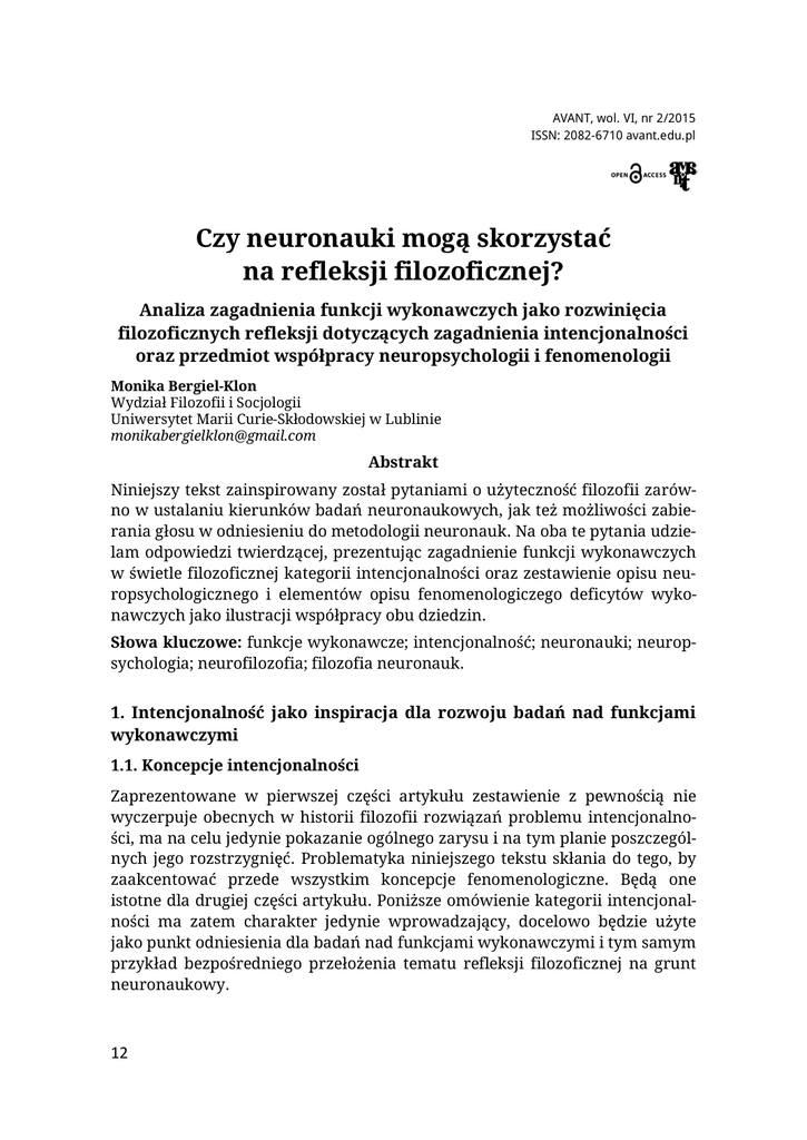 www.avant.edu.pl AVANT, wol. VI, nr 2/2015 ISSN: 2082-6710 avant.edu.pl Czy neuronauki mogą skorzystać na refleksji filozoficznej? Analiza zagadnienia funkcji wykonawczych jako rozwinięcia filozoficznych refleksji dotyczących zagadnienia intencjonalności oraz przedmiot współpracy neuropsychologii i fenomenologii Monika Bergiel-Klon Wydział Filozofii i Socjologii Uniwersytet Marii Curie-Skłodowskiej w Lublinie [email protected] Abstrakt Niniejszy tekst zainspirowany został pytaniami o użyteczność filozofii zarówno w ustalaniu kierunków badań neuronaukowych, jak też możliwości zabierania głosu w odniesieniu do metodologii neuronauk. Na oba te pytania udzielam odpowiedzi twierdzącej, prezentując zagadnienie funkcji wykonawczych w świetle filozoficznej kategorii intencjonalności oraz zestawienie opisu neuropsychologicznego i elementów opisu fenomenologiczego deficytów wykonawczych jako ilustracji współpracy obu dziedzin. Słowa kluczowe: funkcje wykonawcze; intencjonalność; neuronauki; neuropsychologia; neurofilozofia; filozofia neuronauk. 1. Intencjonalność jako inspiracja dla rozwoju badań nad funkcjami wykonawczymi 1.1. Koncepcje intencjonalności Zaprezentowane w pierwszej części artykułu zestawienie z pewnością nie wyczerpuje obecnych w historii filozofii rozwiązań problemu intencjonalności, ma na celu jedynie pokazanie ogólnego zarysu i na tym planie poszczególnych jego rozstrzygnięć. Problematyka niniejszego tekstu skłania do tego, by zaakcentować przede wszystkim koncepcje fenomenologiczne. Będą one istotne dla drugiej części artykułu. Poniższe omówienie kategorii intencjonalności ma zatem charakter jedynie wprowadzający, docelowo będzie użyte jako punkt odniesienia dla badań nad funkcjami wykonawczymi i tym samym przykład bezpośredniego przełożenia tematu refleksji filozoficznej na grunt neuronaukowy. 12 AVANT rocznik VI, tom 2-3/2015 W ujęciu ogólnym pojęcie intencjonalności definiowane jest jako „(nowołac. intentionalis – zamierzony, umyślny; od łac. intentio – napięcie, uwaga) – właściwość tego, co zmierza w określonym kierunku; cecha aktów psychicznych skierowanych na przedmiot” (Judycki 2003). Innymi słowy definiens pojęcia intencjonalności wyrażony jest w kategoriach ukierunkowania, celowości. Z całego bogactwa starożytnych koncepcji intencjonalności, które można odnaleźć między innymi w filozofii Heraklita, Parmenidesa, Platona, Arystotelesa, Filona Aleksandryjskiego, Plotyna, a także u stoików (Krokos 2013), na szczególną uwagę z perspektywy tematu pracy zasługuje platońskie założenie, iż w funkcjonowaniu umysłu dochodzi do relacji współdziałania pomiędzy 1 wolą a intelektem . Intencjonalność jako cecha intelektu pojawia się nato2 miast u św. Tomasza z Akwinu oraz Jana od św. Tomasza . W nieco zmienionym sensie, jednak z wyraźnym odniesieniem do średniowiecznego ujęcia, zagadnienie to prezentuje Franz Brentano (Brentano 1874/1999). Intencjonalność jest przez niego definiowana jako własność wyłącznie fenomenów psychicznych. Realizuje się ona w formie inegzystencji pewnego przedmiotu, „dotyczenia czegoś”, „odnoszenia się do czegoś”. Zasadniczą różnicą i pewnego rodzaju novum, wynikającym z intelektualnej atmosfery drugiej połowy XIX w., jest wprowadzenie przez Brentano doświadczalnego punktu wyjścia i odżegnanie się od metafizycznych rozstrzygnięć odnośnie do istnienia trwałej substancji duchowej. Nadało to jego koncepcji wymiar opisowo-empiryczny, a tym samym otworzyło drzwi dla późniejszych badań intencjonalności na gruncie naukowym. Alexius Meinong, zainspirowany koncepcją intencjonalnego charakteru przeżyć świadomych autorstwa Brentano, kontynuował rozważania nad intencjonalnością, koncentrując się na relacji łączącej przeżycie z jego przedmiotem (transcendencji przedmiotu wobec ujmujących je aktów mentalnych) (Buczyńska-Garewicz 1973). Kazimierz Twardowski, kolejny z bezpośrednich spadkobierców idei intencjonalności Brentano, wprowadził rozróżnienie na akt, treść i przedmiot sądu. W filozofii XX-wiecznej niebagatelną rolę dla historii zagadnienia intencjonalności odegrała fenomenologia Edmunda Husserla. W przeciwieństwie do Brentano, Husserl ujmował intencjonalność jako dynamiczną cechę umysłu, 1 Analiza rozwoju badań nad funkcjami wykonawczymi przedstawiona w drugiej części artykułu odzwierciedla w pewnym sensie jedne z pierwszych analiz inencjonalności, czyli próbę rozstrzygnięcia, czy wyróżnienie woli do wykonania jakiejś czynności należy już do porządku funkcji wykonawczych, jest jednym z etapów procesu wykonawczego, czy znajduje się poza jego granicami. Szerzej związki neuronauk i wolnej woli rozpatruje m.in. Michael Gazzaniga w Kto tu rządzi – ja czy mój mózg? Neuronauka a istnienie wolnej woli (Gazzaniga 2013). 2 Ta teza przekłada się w pewnym sensie na problem, czy funkcje wykonawcze powinny być włączone do zagadnienia funkcji poznawczych, czy też pozostają odrębnym systemem o funkcji nadzorującej. Por. str. 18–19 niniejszego tekstu. 13 www.avant.edu.pl której domeną była konstytucja jedności umysłu, przez to także „ja”, w którym intencjonalność miała mieć swój początek (Dreyfus 1982). Podtrzymana została teza o relacyjności, odnoszeniu się świadomości do swojego przedmiotu, jednak z pewną restrykcją – zawartość świadomości według Husserla nie realizuje się w sposób całościowy w intencjonalnych przeżyciach (Husserl 2008). Nieintencjonalnym aspektem świadomości jest jej efektywna zawartość, co ujęte zostało w pojęciu „noezy”, czyli „strumienia przeżyć”, doznawanych wrażeniowo jakości i „dat wrażeniowych”, którym funkcje przejawiania 3 przedmiotu są dopiero nadawane . Filozofia Husserla jest szczególnie istotna dla podejścia interdyscyplinarnego, czego wyrazem jest rosnąc