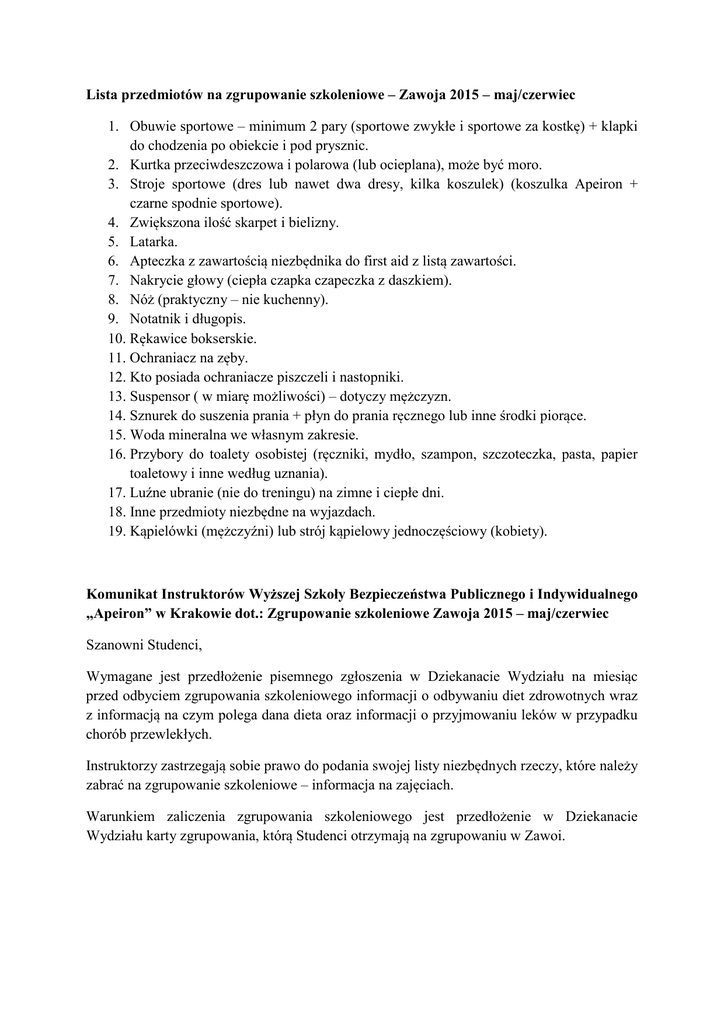 Lista przedmiotów na zgrupowanie szkoleniowe – Zawoja 2015 – maj/czerwiec 1. Obuwie sportowe – minimum 2 pary (sportowe zwykłe i sportowe za kostkę) + klapki do chodzenia po obiekcie i pod prysznic. 2. Kurtka przeciwdeszczowa i polarowa (lub ocieplana), może być moro. 3. Stroje sportowe (dres lub nawet dwa dresy, kilka koszulek) (koszulka Apeiron + czarne spodnie sportowe). 4. Zwiększona ilość skarpet i bielizny. 5. Latarka. 6. Apteczka z zawartością niezbędnika do first aid z listą zawartości. 7. Nakrycie głowy (ciepła czapka czapeczka z daszkiem). 8. Nóż (praktyczny – nie kuchenny). 9. Notatnik i długopis. 10. Rękawice bokserskie. 11. Ochraniacz na zęby. 12. Kto posiada ochraniacze piszczeli i nastopniki. 13. Suspensor ( w miarę możliwości) – dotyczy mężczyzn. 14. Sznurek do suszenia prania + płyn do prania ręcznego lub inne środki piorące. 15. Woda mineralna we własnym zakresie. 16. Przybory do toalety osobistej (ręczniki, mydło, szampon, szczoteczka, pasta, papier toaletowy i inne według uznania). 17. Luźne ubranie (nie do treningu) na zimne i ciepłe dni. 18. Inne przedmioty niezbędne na wyjazdach. 19. Kąpielówki (mężczyźni) lub strój kąpielowy jednoczęściowy (kobiety). Komunikat Instruktorów Wyższej Szkoły Bezpieczeństwa Publicznego i Indywidualnego „Apeiron” w Krakowie dot.: Zgrupowanie szkoleniowe Zawoja 2015 – maj/czerwiec Szanowni Studenci, Wymagane jest przedłożenie pisemnego zgłoszenia w Dziekanacie Wydziału na miesiąc przed odbyciem zgrupowania szkoleniowego informacji o odbywaniu diet zdrowotnych wraz z informacją na czym polega dana dieta oraz informacji o przyjmowaniu leków w przypadku chorób przewlekłych. Instruktorzy zastrzegają sobie prawo do podania swojej listy niezbędnych rzeczy, które należy zabrać na zgrupowanie szkoleniowe – informacja na zajęciach. Warunkiem zaliczenia zgrupowania szkoleniowego jest przedłożenie w Dziekanacie Wydziału karty zgrupowania, którą Studenci otrzymają na zgrupowaniu w Zawoi.