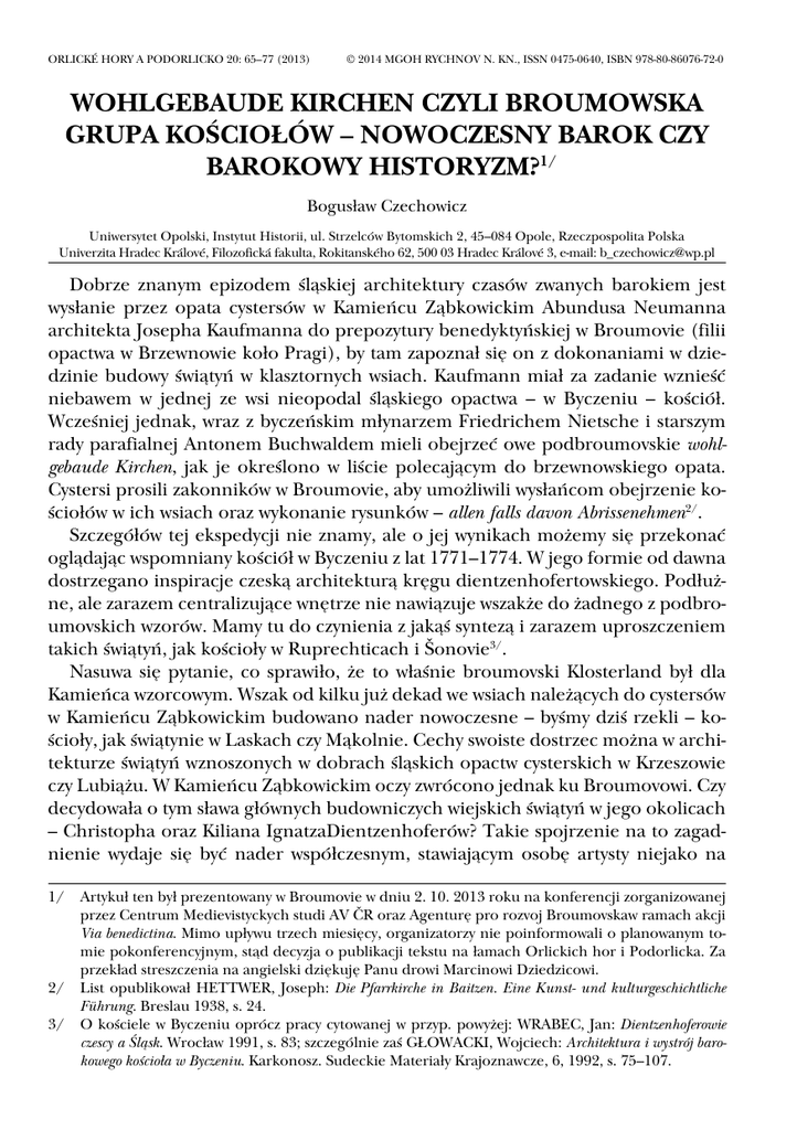 Orlické hory a Podorlicko 20: 65–77 (2013) © 2014 MGOH Rychnov n. Kn., ISSN 0475-0640, ISBN 978-80-86076-72-0 WOHLGEBAUDE KIRCHEN CZYLI BROUMOWSKA GRUPA KOŚCIOŁÓW – NOWOCZESNY BAROK CZY BAROKOWY HISTORYZM?1/ Bogusław Czechowicz Uniwersytet Opolski, Instytut Historii, ul. Strzelców Bytomskich 2, 45–084 Opole, Rzeczpospolita Polska Univerzita Hradec Králové, Filozofická fakulta, Rokitanského 62, 500 03 Hradec Králové 3, e-mail: [email protected] Dobrze znanym epizodem śląskiej architektury czasów zwanych barokiem jest wysłanie przez opata cystersów w Kamieńcu Ząbkowickim Abundusa Neumanna architekta Josepha Kaufmanna do prepozytury benedyktyńskiej w Broumovie (filii opactwa w Brzewnowie koło Pragi), by tam zapoznał się on z dokonaniami w dziedzinie budowy świątyń w klasztornych wsiach. Kaufmann miał za zadanie wznieść niebawem w jednej ze wsi nieopodal śląskiego opactwa – w Byczeniu – kościół. Wcześniej jednak, wraz z byczeńskim młynarzem Friedrichem Nietsche i starszym rady parafialnej Antonem Buchwaldem mieli obejrzeć owe podbroumovskie wohlgebaude Kirchen, jak je określono w liście polecającym do brzewnowskiego opata. Cystersi prosili zakonników w Broumovie, aby umożliwili wysłańcom obejrzenie kościołów w ich wsiach oraz wykonanie rysunków – allen falls davon Abrissenehmen2/. Szczegółów tej ekspedycji nie znamy, ale o jej wynikach możemy się przekonać oglądając wspomniany kościół w Byczeniu z lat 1771–1774. W jego formie od dawna dostrzegano inspiracje czeską architekturą kręgu dientzenhofertowskiego. Podłużne, ale zarazem centralizujące wnętrze nie nawiązuje wszakże do żadnego z podbroumovskich wzorów. Mamy tu do czynienia z jakąś syntezą i zarazem uproszczeniem takich świątyń, jak kościoły w Ruprechticach i Šonovie3/. Nasuwa się pytanie, co sprawiło, że to właśnie broumovski Klosterland był dla Kamieńca wzorcowym. Wszak od kilku już dekad we wsiach należących do cystersów w Kamieńcu Ząbkowickim budowano nader nowoczesne – byśmy dziś rzekli – kościoły, jak świątynie w Laskach czy Mąkolnie. Cechy swoiste dostrzec można w architekturze świątyń wznoszonych w dobrach śląskich opactw cysterskich w Krzeszowie czy Lubiążu. W Kamieńcu Ząbkowickim oczy zwrócono jednak ku Broumovowi. Czy decydowała o tym sława głównych budowniczych wiejskich świątyń w jego okolicach – Christopha oraz Kiliana IgnatzaDientzenhoferów? Takie spojrzenie na to zagadnienie wydaje się być nader współczesnym, stawiającym osobę artysty niejako na 1/Artykuł ten był prezentowany w Broumovie w dniu 2. 10. 2013 roku na konferencji zorganizowanej przez Centrum Medievistyckych studi AV ČR oraz Agenturę pro rozvoj Broumovskaw ramach akcji Via benedictina. Mimo upływu trzech miesięcy, organizatorzy nie poinformowali o planowanym tomie pokonferencyjnym, stąd decyzja o publikacji tekstu na łamach Orlickich hor i Podorlicka. Za przekład streszczenia na angielski dziękuję Panu drowi Marcinowi Dziedzicowi. 2/List opublikował HETTWER, Joseph: Die Pfarrkirche in Baitzen. Eine Kunst- und kulturgeschichtliche Führung. Breslau 1938, s. 24. 3/ O kościele w Byczeniu oprócz pracy cytowanej w przyp. powyżej: WRABEC, Jan: Dientzenhoferowie czescy a Śląsk. Wrocław 1991, s. 83; szczególnie zaś GŁOWACKI, Wojciech: Architektura i wystrój barokowego kościoła w Byczeniu. Karkonosz. Sudeckie Materiały Krajoznawcze, 6, 1992, s. 75–107. Orlické hory a Podorlicko 20: 65–77 (2013) pierwszym miejscu, przed dziełem, przed jego funkcją, przed zleceniodawcą. Źródło, jakim jest wspomniany list, mówi o dobrze lub dostojnie zbudowanych kościołach. Spróbujmy zastanowić się, co się mogło za tym kryć. Wiele już uwagi w literaturze naukowej poświęcono kościołom w okolicach Broumova. Przypomnijmy, że chodzi tu o świątynie: św. Barbary w Otovicach z około 1709 r., przebudowaną w latach 1725–1729 (pierwotny projekt sporządził Martin Alio, zaś plany późniejszych prac wyszły spod ręki Christopha Dientzenhofera – il. 1) i św. Marii Magdaleny w Božanovie z około 1709 r. (część wieży) i z lat 1734–1737 (starsza faza projektowa jest dziełem Ch. Dientzenhofera, młodsza to wynik korekt dokonanych Fig. 1. Kościół św. Barbary w Otovicach koło Broumova. Fot. B. Czechowicz. przez jego syna – il. 2). Budowę kolejnych kościołów zapoczątkowano około 10 lat później, niż w przypadku dwóch wymienionych. Są to świątynie Świętej Trójcy i św. Michała w Vernéřovicach z lat 1719–1722 (według projektu K. I. Dientzenhofera – il. 3), św. Anny w Vižňovie z lat 1719–1728 (o analogicznym jak wyżej autorstwie – il. 4) iśw. Jakuba Starszego w Ruprechticach z lat 1720–1723 (zbudowana prawdopodobnie według projektu Ch. Dientzenhofera – il. 5), nadto kościół pod wezwaniem Wszystkich Świętych w Heřmankovicach z lat 1722–1726 (według projektu K. I. Dientzenhofera – il. 6), św. Prokopa w Bezděkovie nad Metują z lat 1724–1727 (zaprojektowana przez tegoż samego budowniczego – il. 7) oraz św. Małgorzaty w Šonovie z lat 1726–1730 – także dzieło młodszego Dientzenhofera (il. 8), nadto jego pomysłu kaplica Panny Marii Śnieżnej na Hvězdzie z lat 1732– 1738. Do grupy tej zaliczyć jeszcze trzeba kościół św. Wacława w samym Broumovie z około 1730 roku4/. 4/Katalogowe informacje o wymienionych kościołach w: Umělecké památky Čech. Ed. POCHE, Emanuel, 1, A–J. Praha 1977, s. 70–71 (Bezděkov), s. 112 (Božanov), s. 129 (Broumov), s. 373 (Heřmankovice), s. 378 (Hvězda); Umělecké památky... 2, K–O. Praha 1978, s. 564 (Otovice); Umělecké památky... 3, P–Š. Praha 1980, s. 267– 268 (Ruprechtice), s. 501–502 (Šonov); Umělecké památky... 4, T–Ž. Praha 1982, s. 16 (Vernéřovice), s. 242 (Vižňov). Celowo pomijam tu kościół w Martinkovicach, przynależny do wcześniejszej fazy stylo
