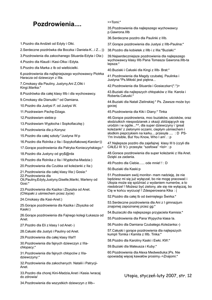 Pozdrowienia.... >>Tomi:* 35.Pozdrowienia dla najlepszego wychowawcy p.Gawrona.IIIb 36.Serdeczne pozdro dla Paulinki z IIIb. 1.Pozdro dla Andżeli od Edyty i Olki. 37.Gorące pozdrowienia dla Justysi z IIIb-Paulina:* 2.Serdeczne pozdrówka dla Boczka i Daniela-K...i Z...:)) 38.Pozdro dla kobietek z IIIb i z IIIa:*Buziaki:* 3.Pozdrowienia dla zakochanego Stiuarda-Edyta i Ola:) 39.Najserdeczniejsze pozdrowienia dla najlepszego wychowawcy klasy IIIb Pana Tomasza Gawrona.IIIb-ta lepsza:* 4.Pozdro dla Klaudi i Kasi-Olka i Edyta. 5.Pozdro dla Marka z Ib od wielbicielki. 6.pozdrowienia dla najfajniejszego wychowawcy Piotrka Haracza od dziewczyn z IIIa. 40.Buziaki i Całuski dla Kingi z IIIb- Brat:* 41.Pozdrowienia dla Magdy czubatej. Paulinka i Justyna:*Ps.Miłość jest piękna... 7.Cmokasy dla Pauliny, Justyny,Ani Z,Olki i Kingi.Marika:* 42.Pozdrowienia dla Stiuarda i Gosiaczka<(*.*)> 8.Pozdrówka dla całej klasy IIIb i dla wychowawcy. 43.Buziaki dla najlepszych chłopaków z IIIa: Karola i Roberta.Całuski:* 9.Cmokasy dla Dianuśki:* od Damiana. 10.Pozdro dla Justysi F. od Justysi W. 44.Buziaki dla Natali Zielinskiej:* Ps. Zawsze może byc gorzej 11.Pozdrawiam Pachę-Dżaga. 45.Pozdrowienia dla Kiki i Diany:* Tinka 12.Pozdrawiam siebie:p 46.Gorące pozdrowienia, moc buziaków, uścisków, oraz słodziutkich niespodzianek z okazji zbliżających się urodzin i w ogóle...^^, dla super dziewczyny i ‘great koleżanki’ z zielonymi oczami, ciepłym uśmiechem i słodkim pieprzykiem na karku... przesyła .... : D PS‘I'm Invisible, But You Know, Who I am’. : p 13.Pozdrawiam Wypłocha i Sopkofiaczkę:) 14.Pozdrowienia dla p.Konysz 15.Pozdro dla całej szkoły:*Justyna W:p 16.Pozdro dla Rolnika z IIa i Sopykofiakowej-Karola=)) 17.Gorące pozdrowienia dla Patryka Konieczyńskiego:* 18.Pozdro dla Justyny od gry$@rda 19.Pozdro dla Rolnika z IIa i Wypłocha-Madzia:) 20.Pozdrowienia dla Czubka od koleżanki z IIa:) 21.Pozdrowienia dla całej klasy IIIa:) Gosia:* 22.Pozdrowienia dla Oli,Pauliny,Edyty,Justyny,Giselle,Mariki, Marleny od Gosi:* 23.Pozdrowienia dla Kazika i Zbyszka od Anet. (Chłopaki z uśmiechem przez życie) 24.Cmokasy dla Kasi-Anet:) 25.Gorące pozdrowienia dla Kazika i Zbyszka od Kaski:) 26.Gorące pozdrowienia dla Fajnego kolegi Łukasza od Anet. 47.Najlepsze pozdro dla zajefajnej klasy III b (czyli dla CAŁEJ III ‘b’)- przesyła: “szefowa” <lol> : p 48.Gorace pozdrowienia dla super koleżanki z IIIa Anet. Dzięki za zadania. 49.Pozdro dla Ciebie...... ode mnie! ! : D 50.Buziaki dla Kaski:p 51.Pozdrawiam swój monitor- mam nadzieję, że nie będziesz mi się już wyłączał, bo nie mogę pracować i Utopia może się spóźniać z wydaniem numerów, a to niedobrze! ! Możesz być zielony, ale się nie wyłączaj, bo Cię w końcu wyrzucę! ! Zdesperowana Kika : ( 52.Pozdro dla całej Ib od świrniętego Świrka:* 53.Serdeczne pozdrowienia dla Ani z I gimnazjum znajomej zapoznanej przez gg:* 54.Buziaczki dla najlepszego przyjaciela Kamisia:* 55.Pozdrowienia dla Pana Wypycha klasa Ia. 27.Pozdro dla Eli z klasy I od Anet:-) 56.Pozdro dla Damiana Czubatego.Koleżanka:-) 28.Całuski dla Justyś i Pauliny od Anet. 57.Całuski i gorące pozdrowienia dla najlepszych kumpli Tomka i Kamila z IIIb. Tinka:* 29.Pozdrowienia dla całej klasy IIIa!!! 30.Pozdrowienia dla fajnych dziewczyn z IIIachłopacy:* 31.Pozdrowienia dla fajnych chłopców z IIIadziewczyny:* 58.Pozdro dla Karoliny Kaski i Ewki. KW:* 59.Buziaki dla Mateusza i Kuby:* 60.Pozdrowienia dla Alexa Medwediuka:)Ps. Nie opowiadaj więcej kawałów prosimy.->Znajomi:* 32.Pozdrowienia dla zakochanych: Natalii i PatrycjiAnet. 33.Pozdro dla chorej Kini-Madzia,Anet i Kasia /wracaj do zdrowia/ 34.Pozdrowienia dla wszystkich dziewczyn z IIIb-- Utopia, styczeń-luty 2007, str. 12