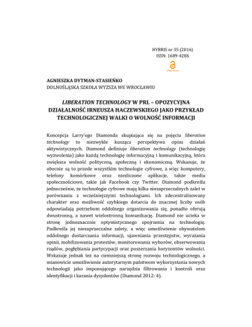 HYBRIS nr 35 (2016) ISSN: 1689-4286 AGNIESZKA DYTMAN-STASIEŃKO DOLNOŚLĄSKA SZKOŁA WYŻSZA WE WROCŁAWIU LIBERATION TECHNOLOGY W PRL – OPOZYCYJNA DZIAŁALNOŚĆ IRNEUSZA HACZEWSKIEGO JAKO PRZYKŁAD TECHNOLOGICZNEJ WALKI O WOLNOŚĆ INFORMACJI Koncepcja Larry’ego Diamonda skupiająca się na pojęciu liberation technology to niezwykle kusząca perspektywa opisu działań aktywistycznych. Diamond definiuje liberation technology (technologię wyzwolenia) jako każdą technologię informacyjną i komunikacyjną, która zwiększa wolność polityczną, społeczną i ekonomiczną. Wskazuje, że obecnie są to przede wszystkim technologie cyfrowe, a więc komputery, telefony komórkowe oraz niezliczone aplikacje, także media społecznościowe, takie jak Facebook czy Twitter. Diamond podkreśla jednocześnie, że technologie cyfrowe mają kilka niezaprzeczalnych zalet w porównaniu z wcześniejszymi technologiami. Ich zdecentralizowany charakter oraz możliwość szybkiego dotarcia do znacznej liczby osób odpowiadają potrzebom oddolnego organizowania się, ponadto oferują dwustronną, a nawet wielostronną komunikację. Diamond nie ucieka w stronę jednoznacznie optymistycznego spojrzenia na technologię. Podkreśla jej niezaprzeczalne zalety, a więc umożliwienie obywatelom oddolnego dostarczania informacji, ujawniania przestępstw, wyrażania opinii, mobilizowania protestów, monitorowania wyborów, obserwowania rządów, pogłębiania partycypacji oraz poszerzania horyzontów wolności. Wskazuje jednak też na ciemniejszą stronę rozwoju technologicznego, a mianowicie umożliwienie autorytarnym państwom wykorzystania nowych technologii jako imponującego narzędzia filtrowania i kontroli oraz identyfikacji i karania dysydentów (Diamond 2012: 4). Agnieszka Dytman-Stasieńko Liberation technology w PRL – opozycyjna działalność Ireneusza Haczewskiego jako przykład technologicznej walki o wolność informacji Oba sposoby wykorzystania technologii – zarówno dla działalności oddolnej, dysydenckiej, jak i jako narzędzia infiltracji oraz identyfikacji oponentów to cechy charakterystyczne nie tylko dla technologii cyfrowych, ale dla rozwoju technologii w ogóle. Stanowić więc mogą immanentną cechę technologii komunikacyjnych, samych w sobie neutralnych, niezależnie czy będą to technologie cyfrowe czy analogowe. Różnice w sposobie działania, komunikowania nie opierają się bowiem na prostym przeciwstawieniu, wręcz przeciwnie – należy doszukiwać się głębszych analogii, które doczekały się (doczekają się) odmiennych rozwiązań technologicznych. Celem tekstu jest więc zaprezentowanie analogowych (a także wczesnocyfrowych) technologii wyzwolenia, które, co istotne, były dziełem jednego człowieka (i jego rodziny) – Ireneusza Haczewskiego. Punkt wyjściowy dla moich rozważań stanowi bowiem przekonanie o niezwykłej roli wolnej informacji w środowisku ocenzurowanym. Tę właśnie cenzurę na rozmaite sposoby przełamywał działający na terenie Lubelszczyzny, w dużej mierze samotnie i samodzielnie, Haczewski. Warto w tym miejscu odnieść się do refleksji, jaką snuje E. Morozow w książce The Net Delusion. The Dark Side of Internet Freedom. Autor ostro polemizuje z poglądami, które głoszą, że blok sowiecki upadł dzięki radiu, dzięki faksom i maszynom do pisania, przerzucanym za Żelazną Kurtynę przez państwa Zachodnie1. Morozow wskazuje, że technologia odegrała rolę w upadku komunizmu, ale raczej dzięki szczególnym historycznym okolicznościom, nie zaś walorom przynależnym samej technologii (Morozow 2011 : 33-55). Oczywiście trudno się nie zgodzić z koncepcją Morozowa, ale należy podkreślić, że wartość analogowych (i wczesnocyfrowych) technologii Co bywa wykorzystywane do podkreślania konieczności podjęcia podobnych działań wobec współczesnych dysydentów w państwach autorytarnych. Według Morozowa zachodni decydenci powinny porzucić iluzję, jakoby komunizm upadł pod presją informacji lub tuż upadł pokojowo, ponieważ cały świat patrzył. 1 [184] Agnieszka Dytman-Stasieńko Liberation technology w PRL – opozycyjna działalność Ireneusza Haczewskiego jako przykład technologicznej walki o wolność informacji wyzwolenia nie polegała tylko na bezpośrednim przyczynieniu się do upadku komunizmu. Jej walory to przede wszystkim rozbijanie monolitu informacyjnego, budzenie świadomości prawdziwie obywatelskiej, budowanie poczucia wspólnoty w działaniu opozycyjnym, dawanie świadectwa, zwłaszcza w latach beznadziei po stanie wojennym. I takie m. in. cele stawiał swojej działalności Ireneusz Haczewski2. Ireneusz Haczewski to m.in. elektronik „odpowiedzialny” za skonstruowanie i funkcjonowanie radia Solidarność na Lubelszczyźnie, zorganizował wraz z żoną Barbarą nielegalne kino we własnym mieszkaniu w Lublinie, był korespondentem Radia Wolna Europa, twórcą konspiracyjnej wytwórni filmów dokumentalnych CVSH. To nie wszystkie aspekty działalności Haczewskiego, który po raz pierwszy stał się znany władzom już w latach 50., jeszcze jako uczeń szkoły średniej. W 1957 roku skonstruował bowiem pierwszy nadajnik, nadający na falach średnich, słyszalny na terenie Lublina i okolic. Przekaz nie ograniczał się tylko do nadawania muzyki i zapowiedzi, Haczewski nadawał również na żywo audycje z Rozgłośni Polskiej Radia Wolna Europa. Jego działalność trwała trzy miesiące. UB namierzyło w końcu radioamatora i zatrzymało w trakcie lekcji. Poddany został trzymiesięcznym przesłuchaniom. Rozprawa odbywała się przy drzwiach zamkniętych, ale na salę rozpraw udało się dostać dziennikarzowi „Ekspressu Wieczornego”3, który opisał całe zdarzenie zgodnie z propagandową linią partii. Materiały do tekstu pochodzą głównie z serii wywiadów przeprowadzonych przez autorkę z Ireneuszem Haczewskim w okresie 1.08 2014 – 20.03.2015. Treść wywiadów znajdu
