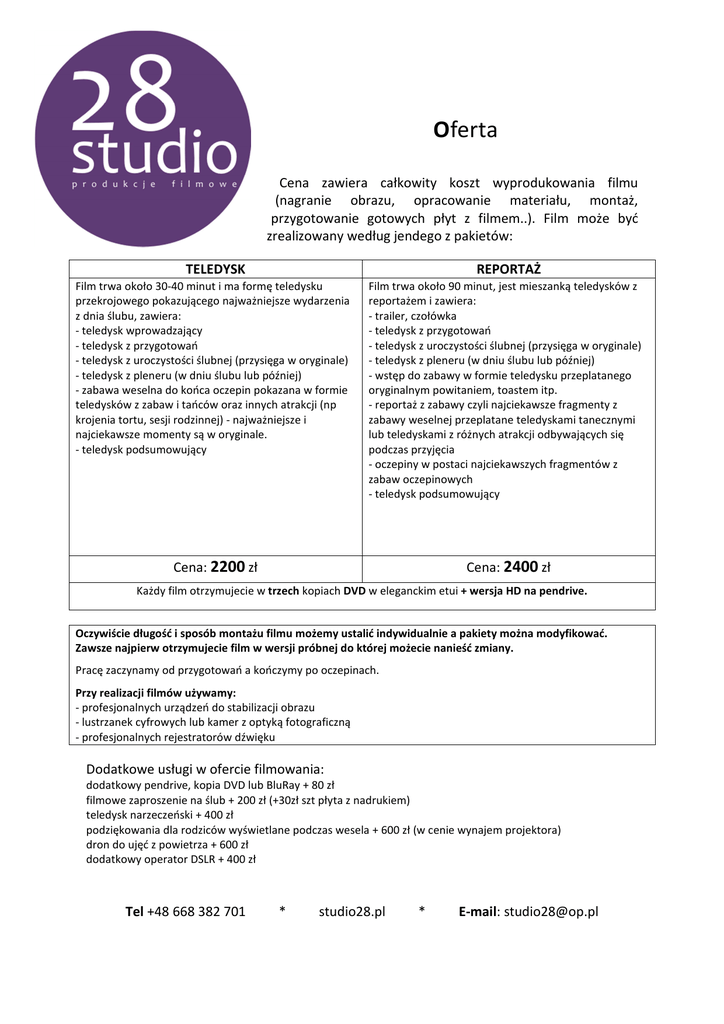 Oferta Cena zawiera całkowity koszt wyprodukowania filmu (nagranie obrazu, opracowanie materiału, montaż, przygotowanie gotowych płyt z filmem..). Film może być zrealizowany według jendego z pakietów: TELEDYSK REPORTAŻ Film trwa około 30-40 minut i ma formę teledysku przekrojowego pokazującego najważniejsze wydarzenia z dnia ślubu, zawiera: - teledysk wprowadzający - teledysk z przygotowań - teledysk z uroczystości ślubnej (przysięga w oryginale) - teledysk z pleneru (w dniu ślubu lub później) - zabawa weselna do końca oczepin pokazana w formie teledysków z zabaw i tańców oraz innych atrakcji (np krojenia tortu, sesji rodzinnej) - najważniejsze i najciekawsze momenty są w oryginale. - teledysk podsumowujący Film trwa około 90 minut, jest mieszanką teledysków z reportażem i zawiera: - trailer, czołówka - teledysk z przygotowań - teledysk z uroczystości ślubnej (przysięga w oryginale) - teledysk z pleneru (w dniu ślubu lub później) - wstęp do zabawy w formie teledysku przeplatanego oryginalnym powitaniem, toastem itp. - reportaż z zabawy czyli najciekawsze fragmenty z zabawy weselnej przeplatane teledyskami tanecznymi lub teledyskami z różnych atrakcji odbywających się podczas przyjęcia - oczepiny w postaci najciekawszych fragmentów z zabaw oczepinowych - teledysk podsumowujący Cena: 2200 zł Cena: 2400 zł Każdy film otrzymujecie w trzech kopiach DVD w eleganckim etui + wersja HD na pendrive. Oczywiście długość i sposób montażu filmu możemy ustalić indywidualnie a pakiety można modyfikować. Zawsze najpierw otrzymujecie film w wersji próbnej do której możecie nanieść zmiany. Pracę zaczynamy od przygotowań a kończymy po oczepinach. Przy realizacji filmów używamy: - profesjonalnych urządzeń do stabilizacji obrazu - lustrzanek cyfrowych lub kamer z optyką fotograficzną - profesjonalnych rejestratorów dźwięku Dodatkowe usługi w ofercie filmowania: dodatkowy pendrive, kopia DVD lub BluRay + 80 zł filmowe zaproszenie na ślub + 200 zł (+30zł szt płyta z nadrukiem) teledysk narzeczeński + 400 zł podziękowania dla rodziców wyświetlane podczas wesela + 600 zł (w cenie wynajem projektora) dron do ujęć z powietrza + 600 zł dodatkowy operator DSLR + 400 zł Tel +48 668 382 701 * studio28.pl * E-mail: [email protected]