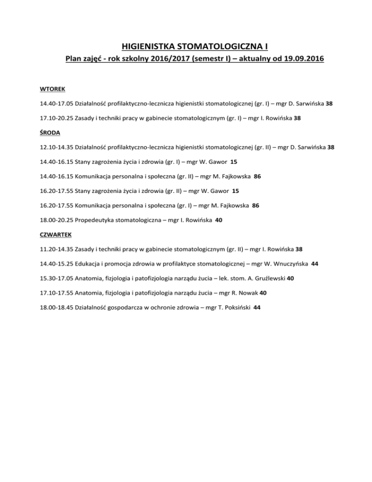 HIGIENISTKA STOMATOLOGICZNA I Plan zajęć - rok szkolny 2016/2017 (semestr I) – aktualny od 19.09.2016 WTOREK 14.40-17.05 Działalność profilaktyczno-lecznicza higienistki stomatologicznej (gr. I) – mgr D. Sarwińska 38 17.10-20.25 Zasady i techniki pracy w gabinecie stomatologicznym (gr. I) – mgr I. Rowińska 38 ŚRODA 12.10-14.35 Działalność profilaktyczno-lecznicza higienistki stomatologicznej (gr. II) – mgr D. Sarwińska 38 14.40-16.15 Stany zagrożenia życia i zdrowia (gr. I) – mgr W. Gawor 15 14.40-16.15 Komunikacja personalna i społeczna (gr. II) – mgr M. Fajkowska 86 16.20-17.55 Stany zagrożenia życia i zdrowia (gr. II) – mgr W. Gawor 15 16.20-17.55 Komunikacja personalna i społeczna (gr. I) – mgr M. Fajkowska 86 18.00-20.25 Propedeutyka stomatologiczna – mgr I. Rowińska 40 CZWARTEK 11.20-14.35 Zasady i techniki pracy w gabinecie stomatologicznym (gr. II) – mgr I. Rowińska 38 14.40-15.25 Edukacja i promocja zdrowia w profilaktyce stomatologicznej – mgr W. Wnuczyńska 44 15.30-17.05 Anatomia, fizjologia i patofizjologia narządu żucia – lek. stom. A. Gruźlewski 40 17.10-17.55 Anatomia, fizjologia i patofizjologia narządu żucia – mgr R. Nowak 40 18.00-18.45 Działalność gospodarcza w ochronie zdrowia – mgr T. Poksiński 44
