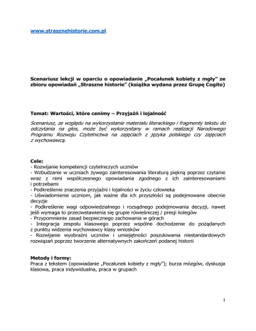 www.strasznehistorie.com.pl Scenariusz lekcji w oparciu o opowiadanie „Pocałunek kobiety z mgły” ze zbioru opowiadań „Straszne historie” (książka wydana przez Grupę Cogito) Temat: Wartości, które cenimy – Przyjaźń i lojalność Scenariusz, ze względu na wykorzystanie materiału literackiego i fragmenty tekstu do odczytania na głos, może być wykorzystany w ramach realizacji Narodowego Programu Rozwoju Czytelnictwa na zajęciach z języka polskiego czy zajęciach z wychowawcą. Cele: - Rozwijanie kompetencji czytelniczych uczniów - Wzbudzanie w uczniach żywego zainteresowania literaturą piękną poprzez czytanie wraz z nimi współczesnego opowiadania zgodnego z ich zainteresowaniami i potrzebami - Podkreślenie znaczenia przyjaźni i lojalności w życiu człowieka - Uświadomienie uczniom, jak ważne dla ich przyszłości są podejmowane obecnie decyzje - Podkreślenie wagi odpowiedzialnego i rozsądnego podejmowania decyzji, nawet jeśli wymaga to przeciwstawienia się grupie rówieśniczej / presji kolegów - Przypomnienie zasad bezpiecznego zachowania w górach - Integracja zespołu klasowego poprzez wspólne dochodzenie do pożądanych z punktu widzenia wychowawcy klasy wniosków - Rozwijanie wyobraźni uczniów i umiejętności poszukiwania niestandardowych rozwiązań poprzez tworzenie alternatywnych zakończeń podanej historii Metody i formy: Praca z tekstem (opowiadanie „Pocałunek kobiety z mgły”); burza mózgów, dyskusja klasowa, praca indywidualna, praca w grupach 1 Przebieg zajęć: Etap lekcji: Czas: 1) Wprowadzenie 5 minut do tematu: Działanie 1. Nauczyciel wyjaśnia uczniom cele dzisiejszej lekcji. Mówi, że dziś będą rozmawiali o przyjaźni, lojalności i wadze podejmowanych decyzji. Informuje także dzieci, że przeczytają fragment ciekawego i nieco strasznego opowiadania, czym pobudza ciekawość dzieci. Wprowadza właściwy nastrój przyciemniając nieco światło w klasie i prosząc dzieci o zrelaksowanie się. 2. Burza mózgów. Dzieci siedząc w kręgu kończą zdanie: Prawdziwy przyjaciel zawsze… Nauczyciel zapisuje odpowiedzi na tablicy. 2) Realizacja tematu – odczytanie przez nauczyciela opowiadania „Pocałunek kobiety z mgły” 10 minut 3) Realizacja tematu – praca w grupach. Opracowanie alternatywnych wersji przedstawionej historii. 15 minut 3. Nauczyciel zapowiada uczniom, że teraz przeczyta im opowiadanie. Czyta opowiadanie „Pocałunek kobiety z mgły” na głos. 4. Nauczyciel po przeczytaniu opowiadania pyta dzieci, czy prawdziwy przyjaciel zawsze robi to, do czego namawia go przyjaciel i czy na tym ich zdaniem polega przyjaźń (dyskusja klasowa). Dzieci mają możliwość podjęcia krótkiej dyskusji na ten temat i wymieniania się opiniami i przemyśleniami. 5. Nauczyciel dzieli klasę na grupy. Każdej grupie przydziela jeden z trzech fragmentów (zał. 1). Zadaniem uczniów jest wymyślenie alternatywnego zakończenia w przypadku każdego z fragmentów w formie dialogu. Nauczyciel daje uczniom wskazówki ustne 2 4) Realizacja tematu – prezentacja scenek przygotowanych przez poszczególne grupy (Co mogło potoczyć się inaczej? Kto mógł zachować się inaczej, lepiej, bardziej odpowiedzialnie?) 5) Realizacja 5 minut tematu – dyskusja / praca indywidualna uczniów. Podanie przykładowego katalogu zachowań ryzykownych mogących wpłynąć na dalsze losy młodego człowieka. 7. Nauczyciel prosi uczniów o podanie innych przykładów ryzykownych zachowań, które mogą wpłynąć na dalsze życie młodego człowieka (zapalenie papierosa, ognisko| z podejrzanym towarzystwem itd.) Podkreśla w rozmowie z uczniami wagę odpowiedzialnego zachowania w takich sytuacjach. 6) Zakończenie lekcji – przypomnienie zasad bezpiecznego zachowania w górach Nauczyciel jeszcze raz czyta fragment opowiadania (zał.2) i przypomina uczniom zasady bezpiecznego zachowania w górach (zał. 3) 7) Praca domowa (opcjonalnie) 6. Uczniowie prezentują na forum klasy przygotowane wcześniej scenki. Nauczyciel podkreśla, że często od jednej decyzji człowieka zależą jego dalsze losy. Pisze adekwatne zdanie na tablicy. 10 minut Uczniowie przygotowują w formie pisemnej alternatywną wersję podanego opowiadania. www.strasznehistorie.com.pl 3 www.strasznehistorie.com.pl Załącznik 1) 1. Na stół, wprost w bladą, drżącą smugę światła, wypełzł włochaty pająk. Karol odruchowo zamierzył się na niego i uderzył go szkicownikiem. Mikołaj próbował uratować przybysza z mroku (jak go potem nazwał), ale niestety, Karol był szybszy. – Co zrobiłeś?! – krzyknął z żalem do swego przyjaciela. – Pająków się nie zabija, to przyciąga nieszczęście! 2. Karol i Mikołaj podnieśli się szybko ze śniegu. Chcieli krzyczeć, ale jednocześnie spojrzeli na siebie i parsknęli śmiechem. Wyglądali jak dwa grube bałwany. Otrzepali się ze śniegu. Wokół było ciemno, ale w dole dostrzegli polanę, płonące ognisko i sanie, które już tam dotarły. – Dawaj, zbiegniemy do nich, nastraszymy ich, jak trzeba – wpadł na pomysł Mikołaj. 3. Chłopcy rzucili się biegiem przez gęsto rosnące, ośnieżone świerki, strącając z nich zimne kryształki lodu. Mikołaj wyprzedził Karola, przeskoczył niewielki dół, poślizgnął się, upadł i sunął tak kilka metrów po lodzie. Podniósł się i krzyknął do Karola: – Zjeżdżaj śmiało, to chyba jakiś strumień! Jest zamarznięty, sam widziałeś, jak sunąłem. Niezła ślizgawka! – po czym wbiegł na małą górkę, by sprawdzić, czy są już blisko polany. Załącznik 2) Klasa szukała chłopców około godziny, potem zerwał się mocny wiatr. Postanowili wracać do schroniska i zawiadomić ratowników oraz policję o zaginięciu kolegów. Wówczas rozległo się wycie wilka, a z góry zeszła wielka lawina, która otuliła las wiecznym snem. Załącznik 3) Zasady bezpiecznego zachowania w górach: 1. Nigdy, przenigdy nie oddalaj się w góra