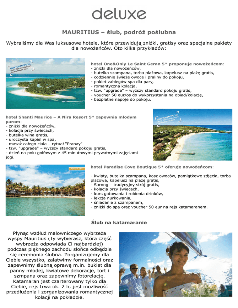 MAURITIUS – ślub, podróż poślubna Wybraliśmy dla Was luksusowe hotele, które przewidują zniżki, gratisy oraz specjalne pakiety dla nowożeńców. Oto kilka przykładów: hotel One&Only Le Saint Geran 5* proponuje nowożeńcom: - zniżki dla nowożeńców, - butelka szampana, torba plażowa, kapelusz na plażę gratis, - codziennie świeże owoce i praliny do pokoju, - pakiet zabiegów spa dla pary, - romantyczna kolacja, - tzw. "upgrade" – wyższy standard pokoju gratis, - voucher 50 eur/os do wykorzystania na obiad/kolację, - bezpłatne napoje do pokoju. hotel Shanti Maurice – A Nira Resort 5* zapewnia młodym parom: - zniżki dla nowożeńców, - kolacja przy świecach, - butelka wina gratis, - uroczysta kąpiel w spa, - masaż całego ciała – rytuał "Pranay" - tzw. "upgrade" – wyższy standard pokoju gratis, - dzień na polu golfowym z 45 minutowymi prywatnymi zajęciami jogi. hotel Paradise Cove Boutique 5* oferuje nowożeńcom: - kwiaty, butelka szampana, kosz owoców, pamiątkowe zdjęcia, torba plażowa, kapelusz na plażę gratis, - Sarong – tradycyjny strój gratis, - kolacja przy świecach, - kurs gotowania i robienia drinków, - lekcja nurkowania, - śniadanie z szampanem, - zniżki do spa oraz voucher 50 eur na rejs katamaranem. Ślub na katamaranie Płynąc wzdłuż malowniczego wybrzeża wyspy Mauritius (Ty wybierasz, która część wybrzeża odpowiada Ci najbardziej) podczas pięknego zachodu słońce odbędzie się ceremonia ślubna. Zorganizujemy dla Ciebie wszystko, załatwimy formalności oraz zapewnimy ślubną oprawę m.in. bukiet dla panny młodej, kwiatowe dekoracje, tort i szmpana oraz zapewnimy fotorelację. Katamaran jest czarterowany tylko dla Ciebie, rejs trwa ok. 2 h, jest możliwość przedłużenia i zorganizowania romantycznej kolacji na pokładzie. Cena pakietu zawiera: - transfery hotel - port – hotel, - obecność koordynatora ślubu, - obecność odpowiedniego urzędnika, - obecność świadków, - organizacja i formalności, - buket ślubny i dekoracje z kwiatów, - fotorelacja (36 zdjęć wydrukowanych oraz na CD), - tort weselny, - szampan, - napoje (bez limitu), - przekąski. Wasz perfekcyjny dzień w hotelu Sofitel Imperial Resort & Spa 5* Podaruj swojej drugiej połówce perfekcyjny dzień, który zostanie zorganizowany dla Was przez hotel Sofitel, do wyboru: "Romantyczna eskapada" – romantyczna kolacja przy świecach, którą na Waszych oczach tylko dla Was przygotuje szef kuchni. "Romantyczna łódka" – romantyczny rejs podczas którego zostanie urządzony dla Was piknik z przysmakami i szampanem. Rejs możemy odbyć wieczorem, aby cieszyć się zachodem słońca lub rano, aby wyruszyć na spotkanie z delfinami. Cena pakietu zawiera: "Romantyczna eskapada" – kolacja gotowana na żywo przez szefa kuchni, - dekoracje. "Romantyczna łódka" – rejs, - kosz piknikowy z przekąskami, - szampan, - dekoracje. Ślubna sesja zdjęciowa Ślubna sesja zdjęciowa, która zostanie wykonana przez naszego profesjonalnego fotografa w wspaniałych plenerach wyspy uwieczni na zawsze Was wspaniały miesiąc miodowy. Do wyboru 3 pakiety: mały (2,5 h), średni (3,5) i duży. Cena pakietu zawiera: - sesja zdjęciowa, - zdjęcia w wysokiej rozdzielczości na DVD, - obróbka wszystkich zdjęć, - obróbka części zdjęć w wersji czarno-białej. Wasz perfekcyjny wieczór w hotelach z sieci Beachcomber Romantyczna kolacja przy świecach tylko dla Was, którą zjecie na plaży będzie składała się z 3-daniowego menu oraz szampana. Prywatna obsługa pozwoli poczuć się Wam wyjątkowo. Cena pakietu zawiera: -3 daniowa obiadokolacja, - butelka szampana, dekoracje.