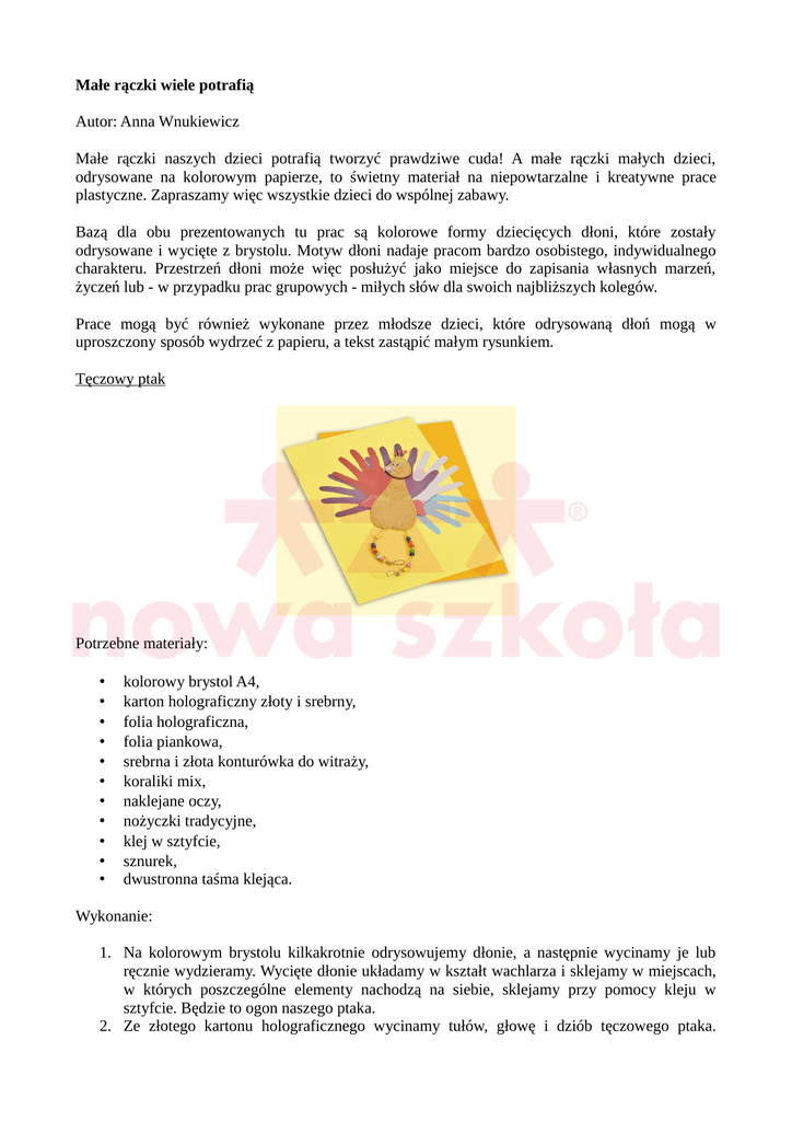 Małe rączki wiele potrafią Autor: Anna Wnukiewicz Małe rączki naszych dzieci potrafią tworzyć prawdziwe cuda! A małe rączki małych dzieci, odrysowane na kolorowym papierze, to świetny materiał na niepowtarzalne i kreatywne prace plastyczne. Zapraszamy więc wszystkie dzieci do wspólnej zabawy. Bazą dla obu prezentowanych tu prac są kolorowe formy dziecięcych dłoni, które zostały odrysowane i wycięte z brystolu. Motyw dłoni nadaje pracom bardzo osobistego, indywidualnego charakteru. Przestrzeń dłoni może więc posłużyć jako miejsce do zapisania własnych marzeń, życzeń lub - w przypadku prac grupowych - miłych słów dla swoich najbliższych kolegów. Prace mogą być również wykonane przez młodsze dzieci, które odrysowaną dłoń mogą w uproszczony sposób wydrzeć z papieru, a tekst zastąpić małym rysunkiem. Tęczowy ptak Potrzebne materiały: • • • • • • • • • • • kolorowy brystol A4, karton holograficzny złoty i srebrny, folia holograficzna, folia piankowa, srebrna i złota konturówka do witraży, koraliki mix, naklejane oczy, nożyczki tradycyjne, klej w sztyfcie, sznurek, dwustronna taśma klejąca. Wykonanie: 1. Na kolorowym brystolu kilkakrotnie odrysowujemy dłonie, a następnie wycinamy je lub ręcznie wydzieramy. Wycięte dłonie układamy w kształt wachlarza i sklejamy w miejscach, w których poszczególne elementy nachodzą na siebie, sklejamy przy pomocy kleju w sztyfcie. Będzie to ogon naszego ptaka. 2. Ze złotego kartonu holograficznego wycinamy tułów, głowę i dziób tęczowego ptaka. Elementy te łączymy przy pomocy dwustronnej taśmy klejącej. Aby uzyskać ciekawszy, bardziej przestrzenny efekt, między elementy wklejamy kawałek folii piankowej. 3. Z kolorowej folii holograficznej wycinamy skrzydełka i piórka, którymi dekorujemy głowę ptaka. Wszystkie te elementy podklejamy od spodniej strony głównej formy. Gotowy tułów ptaka dekorujemy fantazyjnymi wzorami, które wykonujemy konturówka do witraży. Należy pamiętać, że konturówka musi wyschnąć przed dalszą pracą! 4. Teraz przygotowujemy nogi tęczowego ptaka. Na końcu sznurka (ok. 45 cm) zawiązujemy duża pętelkę. Następnie nawlekamy na sznurek ok. 20-tu koralików i na drugim końcu sznurka również zawiązujemy pętelkę. Sznurek, z proporcjonalnie podzielonymi koralikami, składamy na pół i od tyłu, przy pomocy dwustronnej taśmy klejącej, przyklejamy do tułowia ptaka. 5. Tak wykonany tułów łączymy dwustronną taśmą klejącą z kolorowym ogonem. Tęczowy ptak jest już gotowy. Na piórkach jego ogona można np. zapisać imiona bliskich nam osób. Z pewnością będzie to ciekawa dekoracja dziecięcego pokoju. Kolorowa mandala Potrzebne materiały: • • • • • • • kolorowy brystol A4, karton holograficzny złoty i srebrny, folia holograficzna, nożyczki tradycyjne, ozdobne dziurkacze (2,5 cm oraz 1,5 cm). kółka do origami (śr. 18 cm), klej w sztyfcie. Wykonanie: 1. Na kolorowym brystolu kilkakrotnie odrysowujemy dłonie dziecka. Otrzymane kształty wycinamy i promieniście naklejamy na brzegach koła o średnicy 18 cm (koło wycinamy wcześniej ze sztywnego brystolu. Jako szablon tego kształtu może posłużyć nam jedno z kółek origami). 2. Na wierzch naklejonych na koło dłoni naklejamy kolejne koło origami – będzie to przestrzeń do dekorowania mandali oraz sposób na estetyczne zamaskowanie miejsca, w którym przyklejaliśmy papierowe dłonie. 3. Przy pomocy ozdobnych dziurkaczy wycinamy z folii holograficznej dowolną ilość ciekawych, podobających się nam kształtów. Otrzymanymi kształtami dekorujemy mandalę, pamiętając, że pracę rozpoczynamy od samego środka. Poszczególne kształty naklejamy przy pomocy kleju w sztyfcie. Aby praca nabrała charakteru integrującego grupę warto poprosić uczestników o podpisanie swoich papierowych dłoni i wymienienie się nimi z pozostałymi dziećmi. Można również poprosić o zapisanie na dłoniach np. wakacyjnych życzeń czy innych miłych słów i podarowanie takich dłoni swoim najbliższym kolegom i koleżankom. Kształty uzyskane przy pomocy dziurkaczy można również zastąpić gotowymi kształtami np. z folii piankowej (kwiatki, owoce, figury geometryczne) lub samoprzylepnymi mozaikami. W swoim tradycyjnym ujęciu układanie mandali związane jest z praktykami medytacyjnymi buddyjskich mnichów. W prezentowanym wariancie, który jest jedynie inspirowany sama formą działania opartego u układanie elementów na kolistej płaszczyźnie, stanowi ona wyłącznie okazję do wspólnej zabawy i ciekawego działania w grupie.