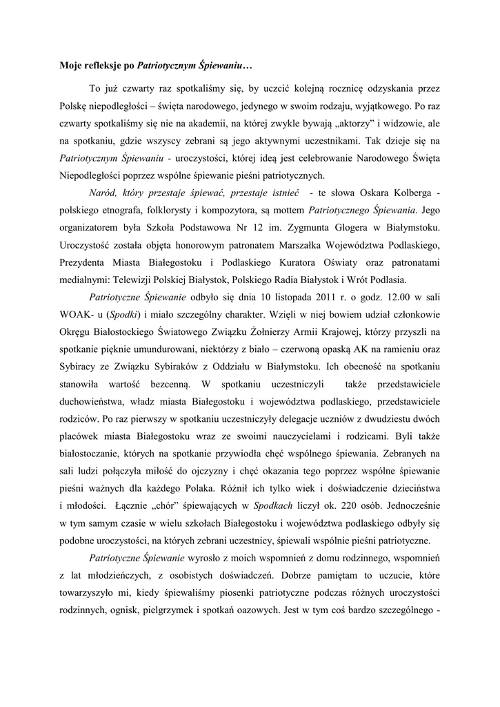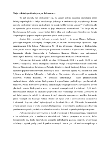 Moje refleksje po Patriotycznym Śpiewaniu… To już czwarty raz spotkaliśmy się, by uczcić kolejną rocznicę odzyskania przez Polskę niepodległości – święta narodowego, jedynego w swoim rodzaju, wyjątkowego. Po raz czwarty spotkaliśmy się nie na akademii, na której zwykle bywają „aktorzy” i widzowie, ale na spotkaniu, gdzie wszyscy zebrani są jego aktywnymi uczestnikami. Tak dzieje się na Patriotycznym Śpiewaniu - uroczystości, której ideą jest celebrowanie Narodowego Święta Niepodległości poprzez wspólne śpiewanie pieśni patriotycznych. Naród, który przestaje śpiewać, przestaje istnieć - te słowa Oskara Kolberga - polskiego etnografa, folklorysty i kompozytora, są mottem Patriotycznego Śpiewania. Jego organizatorem była Szkoła Podstawowa Nr 12 im. Zygmunta Glogera w Białymstoku. Uroczystość została objęta honorowym patronatem Marszałka Województwa Podlaskiego, Prezydenta Miasta Białegostoku i Podlaskiego Kuratora Oświaty oraz patronatami medialnymi: Telewizji Polskiej Białystok, Polskiego Radia Białystok i Wrót Podlasia. Patriotyczne Śpiewanie odbyło się dnia 10 listopada 2011 r. o godz. 12.00 w sali WOAK- u (Spodki) i miało szczególny charakter. Wzięli w niej bowiem udział członkowie Okręgu Białostockiego Światowego Związku Żołnierzy Armii Krajowej, którzy przyszli na spotkanie pięknie umundurowani, niektórzy z biało – czerwoną opaską AK na ramieniu oraz Sybiracy ze Związku Sybiraków z Oddziału w Białymstoku. Ich obecność na spotkaniu stanowiła wartość bezcenną. W spotkaniu uczestniczyli także przedstawiciele duchowieństwa, władz miasta Białegostoku i województwa podlaskiego, przedstawiciele rodziców. Po raz pierwszy w spotkaniu uczestniczyły delegacje uczniów z dwudziestu dwóch placówek miasta Białegostoku wraz ze swoimi nauczycielami i rodzicami. Byli także białostoczanie, których na spotkanie przywiodła chęć wspólnego śpiewania. Zebranych na sali ludzi połączyła miłość do ojczyzny i chęć okazania tego poprzez wspólne śpiewanie pieśni ważnych dla każdego Polaka. Różnił ich tylko wiek i doświadczenie dzieciństwa i młodości. Łącznie „chór” śpiewających w Spodkach liczył ok. 220 osób. Jednocześnie w tym samym czasie w wielu szkołach Białegostoku i województwa podlaskiego odbyły się podobne uroczystości, na których zebrani uczestnicy, śpiewali wspólnie pieśni patriotyczne. Patriotyczne Śpiewanie wyrosło z moich wspomnień z domu rodzinnego, wspomnień z lat młodzieńczych, z osobistych doświadczeń. Dobrze pamiętam to uczucie, które towarzyszyło mi, kiedy śpiewaliśmy piosenki patriotyczne podczas różnych uroczystości rodzinnych, ognisk, pielgrzymek i spotkań oazowych. Jest w tym coś bardzo szczególnego - to poczucie więzi i jedności, poczucie przynależności do ojczyzny, za którą kiedyś tak wielu oddało swe życie. Te pieśni łączą pokolenia. I tak Patriotyczne Śpiewanie stało się udziałem społeczności naszej szkoły z udziałem zaproszonych gości. Pomysł wyjścia z przedsięwzięciem poza mury szkoły zrodził się już po pierwszym spotkaniu, ale dopiero teraz udało się nam go urzeczywistnić. Kiedy w odpowiedzi na nasze zaproszenie zaczynały napływać zgłoszenia, czasami dawało się słyszeć głosy, że to normalne, że na Święto Niepodległości śpiewamy pieśni patriotyczne. To prawda, ale program Patriotycznego Śpiewania w całości oparty jest śpiewaniu piosenek patriotycznych. To jest jego kwintesencja. Podczas Patriotycznego Śpiewania ważne jest to, by każdy mógł śpiewać, by każdy miał możliwość dostępu do tekstów piosenek. I ważne jest, by w miarę możliwości zaśpiewać całe piosenki, wszystkie zwrotki. Wykonanie każdego utworu poprzedzał krótki wstęp dotyczący autorstwa oraz okoliczności jego powstania. To były jedyne komentarze. Naszym celem jako organizatora było podzielenie się z innymi sprawdzoną formułą spotkania, upowszechnianie polskich pieśni i piosenek patriotycznych, integracja społeczności szkolnej miasta i województwa wokół idei i tradycji patriotycznych. Śpiewanie pieśni patriotycznych jest jedną z nich. Każdy uczestnik spotkania otrzymał biało – czerwoną wstążkę. W trakcie śpiewania uczestnicy korzystali ze śpiewników, które były jednocześnie pamiątką ze spotkania. Ponadto teksty utworów były wyświetlane na ekranie. Zaśpiewaliśmy dwanaście pieśni i piosenek o różnym charakterze: te dumne, pełne powagi i patosu, ale też te wesołe, niejednokrotnie dowcipne, których śpiewanie w tamtych czasach pozwalało na odrobinę „normalności” w trudnej do zniesienia rzeczywistości. Piosenki te były swoistym sposobem na przetrwanie. Zaprezentowane zostały także prezentacje multimedialne, będące zobrazowaniem słów piosenek, a co za tym idzie - ważnych wydarzeń z dziejów Polski. Pieśni zostały ułożone chronologicznie. Po śpiewaniu uczestnicy mieli możliwość spotkania przy herbatce, które było okazją do rozmów i podzielenia się wrażeniami po uroczystości. To tu usłyszałam od pani Krystyny – Sybiraczki, trudną historię jej dzieciństwa, rozłąki z ojcem oraz powrotu do ojczyzny i spotkania z ojcem. To tu pani Wanda – również Sybiraczka, zaproponowała, że udostępni mi do przeczytania pamiętnik swojej matki. Pan Henryk – wiceprezes Zarządu Okręgu Białostockiego ŚZŻAK wraz ze swoimi kolegami poprosił, by za rok na Patriotycznym Śpiewaniu zaśpiewać Hymn Armii Krajowej. Zastanawialiśmy się też nad pomysłem na to, jak w sposób przystępny dla młodych Polaków - dzieciom i młodzieży przekazać prawdę o tamtych trudnych czasach, jak podzielić się tym ciężkim doświadczeniem, które było ich udziałem. Zawsze, kiedy po raz kolejny zastanawiam się, czy warto, czy ta formuła powtarzana od kilku lat sprawdzi się także w tym roku, po raz kolejny, po spotkaniu u