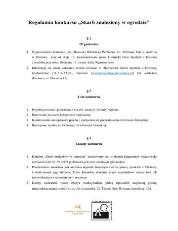 Regulamin konkursu „Skarb znaleziony w ogrodzie” §1 Organizator 1. Organizatorem konkursu jest Oleśnicka Biblioteka Publiczna im. Mikołaja Reja z siedzibą w Oleśnicy przy ul. Reja 10, reprezentowana przez Oleśnicki Dom Spotkań z Historią z siedzibą przy ulicy Bocianiej 11, zwany dalej Organizatorem. 2. Informacje na temat konkursu można uzyskać w Oleśnickim Domu Spotkań z Historią, telefonicznie (71-716-52-23), mailowo ([email protected]) lub osobiście (Oleśnica, ul. Bociania 11). §2 Cele konkursu 1. Popularyzowanie i poznawanie historii, tradycji i kultury regionu. 2. Budowanie poczucia tożsamości regionalnej. 3. Kształtowanie umiejętności pisania i zachęcenie do prezentowania twórczości literackiej. 4. Rozwijanie wyobraźni twórczej i wrażliwości literackiej. §3 Zasady konkursu 1. Konkurs „Skarb znaleziony w ogrodzie” realizowany jest w dwóch kategoriach wiekowych: uczniowie klas IV-VI szkół podstawowych oraz uczniowie gimnazjów. 2. Przedmiotem konkursu jest autorska legenda dotycząca skarbu groszy praskich z Oleśnicy i okoliczności jego ukrycia. Prace literackie składane przez uczestników muszą być ich indywidualnym i samodzielnym utworem. 3. Każdy uczestnik może złożyć maksymalnie jedną opowieść napisaną prozą, nieprzekraczającą trzech stron A4 (czcionka 12, Times New Roman, interlinia 1,5). 4. Uczestnicy składają wydrukowane prace oraz wypełnioną kartę zgłoszeniową i oświadczenie o przetwarzaniu danych osobowych stanowiące załączniki nr 1 i 2 niniejszego regulaminu w kopertach opatrzonych imieniem i nazwiskiem oraz dopiskiem Konkurs „Skarb znaleziony w ogrodzie” w Oleśnickim Domu Spotkań z Historią. §4 Terminy 1. Termin składania prac upływa 30 kwietnia 2015 roku. 2. O terminie rozstrzygnięcia konkursu nagrodzeni oraz wyróżnieni uczestnicy zostaną poinformowani indywidualnie. 3. Uroczyste wręczenie nagród nastąpi 16 maja 2015 roku o godzinie 18:30 podczas Nocy Muzeów odbywającej się w Oleśnickim Domu Spotkań z Historią. §5 Komisja konkursowa 1. Wyboru najciekawszych prac w każdej kategorii dokona komisja konkursowa powołana przez Organizatora. §6 Kryteria oceniania prac 1. Przy wyborze zwycięzców, komisja będzie kierowała się następującymi kryteriami: zgodność pracy z tematem, wartości artystyczne opowiadania, poprawność stylistyczna i językowa, regionalizm i nawiązanie do historii miasta, ogólna estetyka pracy, szczególne zalety opowiadania. §7 Nagrody 1. Zwycięzcy konkursu otrzymają nagrody rzeczowe oraz dyplomy. 2. W każdej kategorii wiekowej przewidziane są nagrody rzeczowe dla trzech najlepszych prac. 3. Organizator zastrzega sobie możliwość przyznawania wyróżnień. 4. Organizator zastrzega sobie prawo do publikacji najlepszych prac na stronach internetowych www.muzeumolesnica.pl oraz www.biblio.olesnica.pl. 5. Wyniki konkursu z ostaną opublikowane na stronach internetowych www.muzeumolesnica.pl oraz www.biblio.olesnica.pl i w popularnych portalach społecznościowych. §8 Postanowienia końcowe 1. Prace konkursowe nie podlegają zwrotowi. 2. Udział w konkursie jest jednoznaczny z wyrażeniem przez autora zgody na przekazanie Organizatorowi praw autorskich do celów publikacji i promocji. 3. Udział w konkursie jest jednoznaczny z akceptacją niniejszego regulaminu. 4. Organizator zastrzega sobie prawo wprowadzenia zmian w regulaminie z ważnych przyczyn. Załącznik nr 1 Karta zgłoszeniowa Konkurs „Skarb znaleziony w ogrodzie” 1. Imię i nazwisko uczestnika…………………...………………………………….. 2. Telefon kontaktowy………………………………………………………………. 3. Adres……………………………………………………………………………… 4. Szkoła…………………………………………………………………………….. 5. Imię i nazwisko opiekuna ………………………………………………………... 6. Wiek/ Kategoria ………………………………………………………………….. Załącznik nr 2 Oświadczenie opiekuna Wyrażam zgodę na przetwarzanie danych osobowych mojego dziecka/podopiecznego (imię i nazwisko)………………………………………………………………………... w celu zamieszczenia w mediach i publikacjach wyników oraz pracy nadesłanej na konkurs „Skarb znaleziony w ogrodzie” zorganizowanego przez Oleśnicką Bibliotekę Publiczną im. M. Reja (zgodnie z ustawa z dnia 29 sierpnia 1997 r. o ochronie danych osobowych, Dz.U.1997 Nr 133, poz. 883 z późn. zm.). …………………………………….. data i podpis rodzica/ opiekuna prawnego