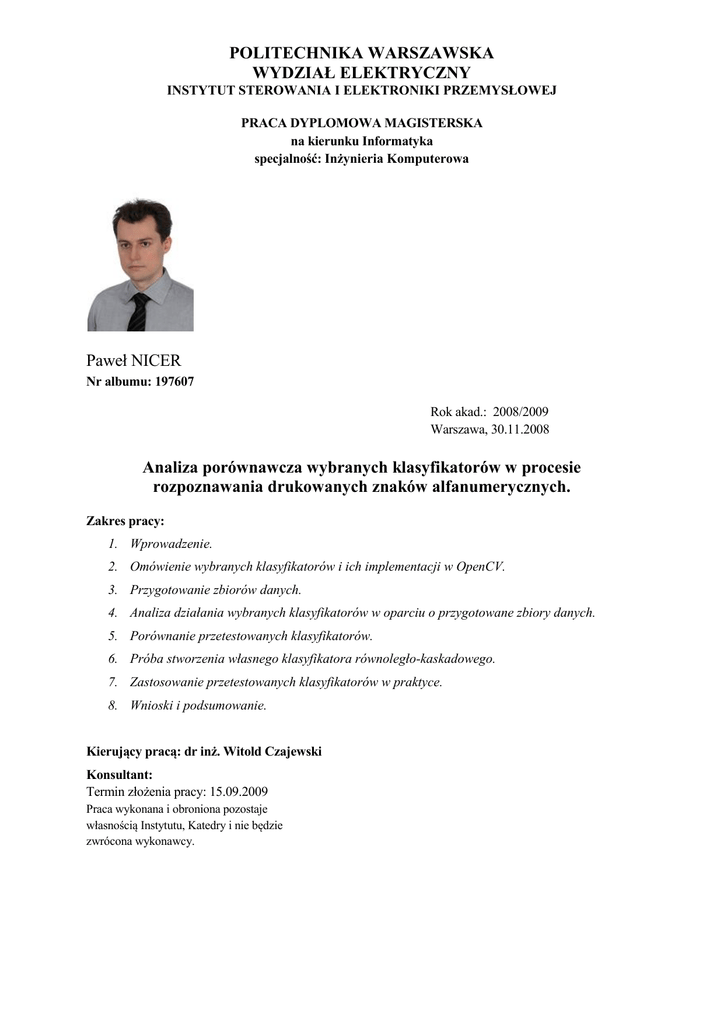 alfanumerycznych. W przeprowadzonych badaniach użyto klasyfikatorów: kNN, normalnego