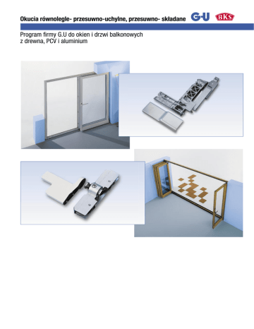 Okucia równolegle- przesuwno-uchylne, przesuwno- składane Program firmy G.U do okien i drzwi balkonowych z drewna, PCV i aluminium Program okuć równolegle- przesuwno- uchylnych G.U ... Program okuć równolegleprzesuwno- uchylnych oferuje rozwiązania techniczne najwyższej jakości do okien i drzwi balkonowych z drewna, PCV i aluminium: G.U-966 (PCV, drewno) i G.U-968 (aluminium) dla dużych elementów 2- lub 4- skrzydłowych; G.U- 90 dla małych i lekkich elementów do okien i drzwi balkonowych, dla budynków mieszkaniowych i obiektowych. Dane techniczne obecnego programu G.U-966/ 200 mZ Waga skrzydła w kg. aż do 200 Szerokość skrzydła we wrębie w mm. 720 – 2000 Wysokość skrzydła we wrębie w mm. 820 – 2370 Bezpieczeństwo podstawowe Podwyższone bezpieczeństwo ENV 1627 – WK 2 Innowacyjna technologia przesuwania Dzięki nowoczesnemu elementowi ustalającemu, wózek G.U gładko i dokładnie ślizga się z pozycji przesuwania do pozycji uchylania. 2 G.U-966/ 150 mZ G.U-968/ 200 mZ G.U-968/ 150 mZ G.U-966/ 150 oZ G.U-968/ 150 oZ G.U-90 oZ aż do 150 720 – 1600 820 – 2370 aż do 200 740 – 2000 895 – 2400 aż do 150 740 – 1600 895 – 2400 aż do 130 700 – 1600 700 – 2350 aż do 130 600 – 1600 730 – 2400 aż do 90 700 – 1600 700 – 2350 Łatwy montaż z „Mądralą“ Wszystkie punkty ryglujące okuć G.U-90 oZ są zaprojektowane jako automatyczne trzpienie grzybkowe „Mądrale“, które dokładnie dopasowują się do wielkości przestrzeni wrębowej. Indywidualne poziomy bezpieczeństwa Okucia równolegle-przesuwnouchylne do elementów z drewna i PCV, dostępne są w trzech różnych klasach bezpieczeństwa. Specjalne, bezpieczne komponenty zapewniają doskonałą ochronę antywłamaniową. Srebrna powłoka ferGUard* Okucia równolegle-przesuwnouchylne firmy G.U pokryte są szczelną powłoką najwyższej jakości ferGUard w kolorze srebrnym, która zapewnia intensywną i stałą ochronę antykorozyjną. ... wysoka funkcjonalność i łatwość obsługi Łatwa obsługa Drzwi i okna z okuciami równolegle-przesuwno-uchylnymi otwiera się i zamyka z wyjątkową łatwością. Obsługa za pomocą jednej klamki sprawia, że są niezwykle proste w użyciu. Klamka G.U mZ Schemat A- ze słupkiem 1 drzwi równolegleprzesuwno-uchylne, 1 oszklenie stałe ilustracja: wariant-lewe Klamka G.U mZ z wkładką cylindryczną Klamka G.U mZ z wkładką cylindryczną, stal nierdzewna Schemat A- ze słupkiem [1] 1 drzwi równolegleprzesuwno-uchylne, 1 drzwi rozwieralne ilustracja: wariant-lewe Schemat D- bez słupka [2] 1 drzwi równolegleprzesuwno-uchylne, 1 drzwi rozwieralne ilustracja: wariant-lewe � Schemat C- ze słupkiem 2 drzwi równolegle-przesuwno-uchylne, 2 oszklenia stałe; ilustracja: skrzydło czynne – wariant-lewe Schemat C- ze słupkiem [1] 2 drzwi równolegle-przesuwno-uchylne, 2 drzwi rozwieralne; ilustracja: skrzydło czynne – wariant-lewe Pozycja przesuwania Przy zwolnionym uchyleniu, skrzydło przesuwne zostaje równolegle odstawione i odsunięte na bok. � Schemat G- ze słupkiem 1 drzwi równolegle-przesuwno-uchylne, 2 oszklenia stałe; ilustracja: wariant-lewe Schemat K- ze słupkiem 2 drzwi równolegle-przesuwno-uchylne, 1 oszklenie stałe; ilustracja: wariant-lewe i prawe Schemat G- ze słupkiem [1] 1 drzwi równolegle-przesuwno-uchylne, 2 drzwi rozwieralne; ilustracja: wariant-lewe Podpis: [1] Schematy A, C i G ze skrzydłem rozwieralnym: okucia G.U do skrzydeł rozwieralnych, ze zmiennym położeniem klamki DIRIGENT-F/SG 8-00694-33-0-* i rozetką/ F, wewnątrz mieszkania 6-24913-00-0-* [1] Schemat D: Skrzydło rozwieralne z zasuwnicą słupka ruchomego UNI-JET Pozycja zamknięcia Pozycja uchylania Pozycja uchylania umożliwia skuteczną, dodat- Zamek centralny umożliwia zamknięcie kową wentylację pomieszczenia. Rozwórki pew- skrzydła na całym obwodzie. nie utrzymują skrzydło w pozycji otwartej, nawet przy silnym wietrze i skrzydło jest zabezpieczone przed ruchami bocznymi. 3 G.U-966 (PCV, drewno) – G.U-968 (aluminium) Rozwórki z wymuszonym działaniem, typ 200 mZ i 150 mZ Dzięki automatycznemu działaniu, okucia typu mZ zapewniają zarówno łatwość obsługi, jak również bezpieczeństwo i niezawodne działanie nawet dużych i ciężkich skrzydeł drzwi balkonowych. Innowacyjny projekt wózków wyróżnia się płynnym ślizgiem po łuku elementu ustalającego, co umożliwia gładkie przesuwanie zakończeniom skrzydeł.Co więcej, skrzydła przesuwne przesuwają się łatwo i dokładnie do każdej pożądanej pozycji. Dzięki ergonomicznie ukształtowanej klamce aluminiowej, każdą czynność można wykonywać jedną ręką: zwalnianie centralnego zamka i uruchamianie skrzydła; zwalnianie z pozycji uchyłu, przesuwanie skrzydła do pozycji otwartej/zamkniętej, przyciąganie i zamykanie skrzydła jednocześnie. Klamki dostępne są w wersji z blokadą zatrzaskiwania, lub w wersji klamek zakluczanych z wkładką profilową dla jedno- lub obustronnej obsługi. Optymalna ochrona antykorozyjna dzięki szczelnej powłoce ferGUard*silver. Wymuszenie działania Obydwa typy okuć wyposażone są w tak zwane aktywne rozwórki (wymuszenie działania) dociskające skrzydło do ramy na całej szerokości podczas zamykania i równo odpychające od ramy podczas otwierania. Idealne dla dużych i ciężkich skrzydeł. G.U-966/200 mZ, PCV G.U-966 (PCV, drewno) Okno bardzo łatwo przechodzi z pozycji zamknięcia w pozycję uchylenia. Jest jednocześnie zabezpieczone przed ruchami bocznymi. G.U-966/200 mZ, PCV G.U-968 (aluminium) Komponenty okuć są wykonane ze stali wysokiej jakości, stopów cynku i stopów aluminium; aluminiowe profile skrzydła z Euro rowkiem 15/ 20 mm. Skrzydło przesuwne automatycznie przechodzi w pozycję uchylenia i jest zabezpieczone przed ruchami bocznymi. Pozycja zamknięcia Pozycja uchylenia i przesuwania Zwolnienie przesuwania G.U-968/200 mZ, aluminium Dane techniczne Waga skrzydła w kg. Szerokość skr