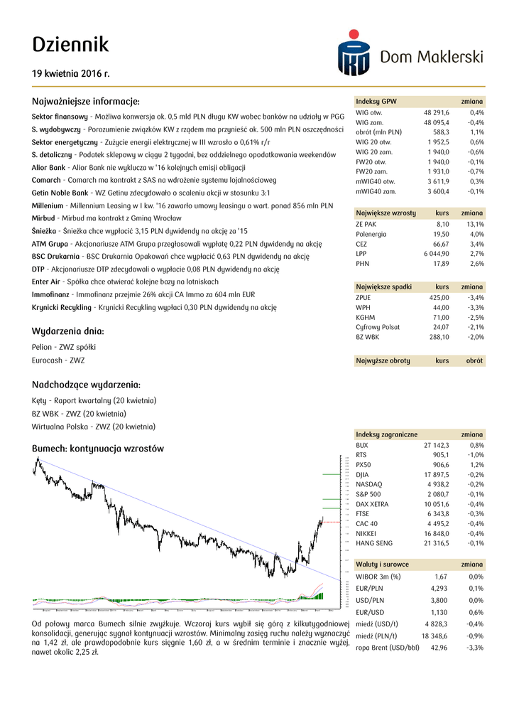 Dziennik 19 kwietnia 2016 r. Najważniejsze informacje: Indeksy GPW WIG otw. WIG zam. obrót (mln PLN) WIG 20 otw. WIG 20 zam. FW20 otw. FW20 zam. mWIG40 otw. mWIG40 zam. Sektor finansowy - Możliwa konwersja ok. 0,5 mld PLN długu KW wobec banków na udziały w PGG S. wydobywczy - Porozumienie związków KW z rządem ma przynieść ok. 500 mln PLN oszczędności Sektor energetyczny - Zużycie energii elektrycznej w III wzrosło o 0,61% r/r S. detaliczny - Podatek sklepowy w ciągu 2 tygodni, bez oddzielnego opodatkowania weekendów Alior Bank - Alior Bank nie wyklucza w '16 kolejnych emisji obligacji Comarch - Comarch ma kontrakt z SAS na wdrożenie systemu lojalnościoweg Getin Noble Bank - WZ Getinu zdecydowało o scaleniu akcji w stosunku 3:1 zmiana 48 291,6 48 095,4 588,3 1 952,5 1 940,0 1 940,0 1 931,0 3 611,9 3 600,4 0,4% -0,4% 1,1% 0,6% -0,6% -0,1% -0,7% 0,3% -0,1% kurs zmiana 8,10 19,50 66,67 6 044,90 17,89 13,1% 4,0% 3,4% 2,7% 2,6% Millenium - Millennium Leasing w I kw. '16 zawarło umowy leasingu o wart. ponad 856 mln PLN Największe wzrosty Mirbud - Mirbud ma kontrakt z Gminą Wrocław ZE PAK Polenergia CEZ LPP PHN Śnieżka - Śnieżka chce wypłacić 3,15 PLN dywidendy na akcję za '15 ATM Grupa - Akcjonariusze ATM Grupa przegłosowali wypłatę 0,22 PLN dywidendy na akcję BSC Drukarnia - BSC Drukarnia Opakowań chce wypłacić 0,63 PLN dywidendy na akcję DTP - Akcjonariusze DTP zdecydowali o wypłacie 0,08 PLN dywidendy na akcję Enter Air - Spółka chce otwierać kolejne bazy na lotniskach Największe spadki Immofinanz - Immofinanz przejmie 26% akcji CA Immo za 604 mln EUR ZPUE WPH KGHM Cyfrowy Polsat BZ WBK Krynicki Recykling - Krynicki Recykling wypłaci 0,30 PLN dywidendy na akcję Wydarzenia dnia: kurs zmiana 425,00 44,00 71,00 24,07 288,10 -3,4% -3,3% -2,5% -2,1% -2,0% kurs obrót Pelion - ZWZ spółki Eurocash - ZWZ Najwyższe obroty Nadchodzące wydarzenia: Kęty - Raport kwartalny (20 kwietnia) BZ WBK - ZWZ (20 kwietnia) Wirtualna Polska - ZWZ (20 kwietnia) Indeksy zagraniczne Bumech: kontynuacja wzrostów 2.8 2.7 2.6 2.5 2.4 2.3 2.2 2.1 2.0 1.9 1.8 1.7 1.6 1.5 1.4 1.3 1.2 1.1 1.0 0.9 BUX RTS PX50 DJIA NASDAQ S&P 500 DAX XETRA FTSE CAC 40 NIKKEI HANG SENG zmiana 27 142,3 905,1 906,6 17 897,5 4 938,2 2 080,7 10 051,6 6 343,8 4 495,2 16 848,0 21 316,5 0,8% -1,0% 1,2% -0,2% -0,2% -0,1% -0,4% -0,3% -0,4% -0,4% -0,1% 0.8 0.7 Waluty i surowce zmiana 0.6 WIBOR 3m (%) 1,67 0,0% EUR/PLN 4,293 0,1% USD/PLN 3,800 0,0% EUR/USD 1,130 0,6% 4 828,3 Od połowy marca Bumech silnie zwyżkuje. Wczoraj kurs wybił się górą z kilkutygodniowej miedź (USD/t) konsolidacji, generując sygnał kontynuacji wzrostów. Minimalny zasięg ruchu należy wyznaczyć miedź (PLN/t) 18 348,6 na 1,42 zł, ale prawdopodobnie kurs sięgnie 1,60 zł, a w średnim terminie i znacznie wyżej, ropa Brent (USD/bbl) 42,96 nawet okolic 2,25 zł. -0,4% 70 60 50 40 30 20 10 0 -10 -20 -30 Augus t Septem ber October Novem ber Decem ber 2015 February March April May June July Augus t Septem ber October Novem ber Decem ber 2016 February March April May -0,9% -3,3% Dziennik 19 kwietnia 2016 r. Najważniejsze informacje: Sektor finansowy Możliwa konwersja ok. 0,5 mld PLN długu KW wobec banków na udziały w PGG Wiceminister energii Grzegorz Tobiszowski poinformował, że konwersja zadłużenia Kompanii Węglowej (KW) wobec banków na udziały w Polskiej Grupie Górniczej (PGG) może objąć około 0,5 mld PLN, czyli jedną trzecią tego, co Kompania winna jest bankom. Jego zdaniem zgoda banków na konwersję części długu na udziały w PGG znacząco oddala również obawy o to, że Komisja Europejska nie zaakceptuje programu naprawczego dla Kompanii Węglowej, uznając go za niedozwoloną pomoc publiczną. Ma to zapewnić zaangażowanie – obok spółek Skarbu Państwa – także podmiotów prywatnych. (PAP) Sektor wydobywczy Porozumienie związków KW z rządem ma przynieść ok. 500 mln PLN oszczędności Jak podaje “Rzeczpospolita”, z dużym prawdopodobieństwem dziś zostanie podpisane porozumienie pomiędzy związkami KW i rządem. Jedynym elementem restrukturyzacji płacowej jest zamrożenie czternastek w 2016 i 2017 r. Ma to pozwolić na obniżenie kosztów pracowniczych o ok 230 mln PLN w skali roku. (Rzeczpospolita) Sektor energetyczny Zużycie energii elektrycznej w III wzrosło o 0,61% r/r Zużycie energii elektrycznej w Polsce w marcu wyniosło 14.111 GWh, co oznacza, że wzrosło o 0,61% r/r wynika z danych PSE. W okresie styczeń-marzec zużycie wyniosło 42.631 GWh, co oznacza wzrost o 2,09%. W marcu wyprodukowano w Polsce 13.624 GWh energii elektrycznej, tj. o 3,04% mniej r/r. W okresie styczeńmarzec wyprodukowano 41.987 GWh energii, o 0,05% mniej r/r. (PAP) Sektor detaliczny Podatek sklepowy w ciągu 2 tygodni, bez oddzielnego opodatkowania weekendów Szef Komitetu Stałego Rady Ministrów Henryk Kowalczyk zapowiedział, że podatek sklepowy zostanie przedstawiony w ciagu 2 tygodni, a w najnowszej wersji nie będzie oddzielnego opodatkowania sobót i niedziel. Nie będzie w nim takiej definicji franczyzy jak w projekcie z lutego. (PAP) Alior Bank Alior Bank nie wyklucza w '16 kolejnych emisji obligacji Alior Bank nie wyklucza, że w 2016 roku wyjdzie na rynek z emisjami kolejnych obligacji podporządkowanych. Jak powiedział Wojciech Sobieraj, prezes Alior Banku, dotychczasowa emisja trafiła głównie do inwestorów indywidulanych. (PAP) Comarch Comarch ma kontrakt z SAS na wdrożenie systemu lojalnościoweg Scandinavian Airlines System (SAS), największy przewoźnik w krajach skandynawskich, podpisał z Comarchem umowę na wdrożenie systemu Comarch Loyalty Management. Projekt polega na wdrożeniu kilku modułów oferowanych przez Comarch: Comarch Loyalty Management, Comarch Customer Engagement oraz Comarch Smart Analytics. (PAP) Getin Noble Bank WZ Getinu zdecydowało o scaleniu akcji w stosunku 3:1 Zwyczajne Walne Zgromadzenie Getin Noble Banku zdecydowało o połączeniu każdyc