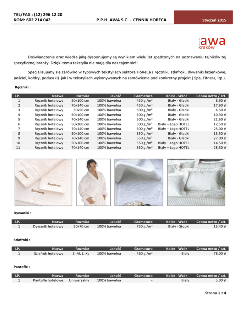 TEL/FAX : (12) 296 12 20 KOM: 602 214 042 P.P.H. AWA S.C. - CENNIK HORECA Styczeń 2015 Doświadczenie oraz wiedza jaką dysponujemy są wynikiem wielu lat spędzonych na poznawaniu tajników tej specyficznej branży. Dzięki temu tekstylia nie mają dla nas tajemnic!! Specjalizujemy się zarówno w typowych tekstyliach sektora HoReCa ( ręczniki, szlafroki, dywaniki łazienkowe, pościel, kołdry, poduszki) jak i w tekstyliach wykonywanych na zamówienie pod konkretny projekt ( Spa, Fitness, itp.). Ręczniki : LP. 1 2 3 4 5 6 7 8 9 10 11 Nazwa Ręcznik hotelowy Ręcznik hotelowy Ręcznik hotelowy Ręcznik hotelowy Ręcznik hotelowy Ręcznik hotelowy Ręcznik hotelowy Ręcznik hotelowy Ręcznik hotelowy Ręcznik hotelowy Ręcznik hotelowy Rozmiar 50x100 cm 70x140 cm 30x50 cm 50x100 cm 70x140 cm 50x100 cm 70x140 cm 50x100 cm 70x140 cm 50x100 cm 70x140 cm Jakość 100% bawełna 100% bawełna 100% bawełna 100% bawełna 100% bawełna 100% bawełna 100% bawełna 100% bawełna 100% bawełna 100% bawełna 100% bawełna Gramatura 450 g /m² 450 g /m² 500 g /m² 500 g /m² 500 g /m² 500 g /m² 500 g /m² 550 g /m² 550 g /m² 550 g /m² 550 g /m² Kolor - Wzór Biały - Gładki Biały - Gładki Biały - Gładki Biały - Gładki Biały - Gładki Biały – Logo HOTEL Biały – Logo HOTEL Biały - Gładki Biały - Gładki Biały – Logo HOTEL Biały – Logo HOTEL Cenna netto / szt. 8,90 zł 17,90 zł 4,50 zł 10,90 zł 21,60 zł 12,50 zł 25,00 zł 13,50 zł 27,00 zł 14,50 zł 28,50 zł Nazwa Dywanik hotelowy Rozmiar 50x70 cm Jakość 100% bawełna Gramatura 750 g /m² Kolor - Wzór Biały - Stopki Cenna netto / szt. 13,40 zł Nazwa Szlafrok hotelowy Rozmiar S, M, L, XL Jakość 100% bawełna Gramatura 460 g /m² Kolor - Wzór Biały Cenna netto / szt. 78,00 zł Nazwa Pantofle hotelowe Rozmiar Uniwersalny Jakość 100% bawełna Gramatura - Kolor - Wzór Biały Cenna netto / szt. 5,00 zł Dywaniki : LP. 1 Szlafroki : LP. 1 Pantofle : LP. 1 Strona 1 z 4 TEL/FAX : (12) 296 12 20 KOM: 602 214 042 P.P.H. AWA S.C. - CENNIK HORECA Styczeń 2015 Poszwy, poszewki z satyny żakardowej białej ( pasek 4, 8, 10 lub 20 mm ) : ( kurczliwość poniżej 3 % po wątku i osnowie ) LP. 1 2 3 4 5 6 Nazwa Poszwa hotelowa Poszwa hotelowa Poszwa hotelowa Poszewka hotelowa Poszewka hotelowa Poszewka hotelowa Rozmiar 140x200 cm 160x200 cm 220x200 cm 40x40 cm 50x60 cm 70x80 cm Jakość 100% bawełna 100% bawełna 100% bawełna 100% bawełna 100% bawełna 100% bawełna Gramatura 135-150 g /m² 135-150 g /m² 135-150 g /m² 135-150 g /m² 135-150 g /m² 135-150 g /m² Kolor - Wzór Biały - Paski Biały - Paski Biały - Paski Biały - Paski Biały - Paski Biały - Paski Cenna netto / szt. 56,00 zł 62,00 zł 83,00 zł 5,20 zł 8,80 zł 13,80 zł Kolor - Wzór Biały - Gładki Biały - Gładki Biały - Gładki Biały - Gładki Biały - Gładki Cenna netto / szt. 42,00 zł 45,00 zł 4,40 zł 7,10 zł 10,80 zł Poszwy, poszewki z bawełny białej typu MEDICAL ( polecana dla szpitali ) : LP. 1 2 3 4 5 Nazwa Poszwa Poszwa Poszewka Poszewka Poszewka Rozmiar 140x200 cm 160x200 cm 40x40 cm 50x60 cm 70x80 cm Jakość 100% bawełna 100% bawełna 100% bawełna 100% bawełna 100% bawełna Gramatura 155-170 g /m² 155-170 g /m² 155-170 g /m² 155-170 g /m² 155-170 g /m² Poszwy, poszewki z tkaniny bawełnianej gładkiej typu PERKAL (kurczliwość poniżej 3 % po wątku i osnowie): LP. 1 2 3 4 5 6 Nazwa Poszwa hotelowa Poszwa hotelowa Poszwa hotelowa Poszewka hotelowa Poszewka hotelowa Poszewka hotelowa Rozmiar 140x200 cm 160x200 cm 220x200 cm 40x40 cm 50x60 cm 70x80 cm Jakość 100% bawełna 100% bawełna 100% bawełna 100% bawełna 100% bawełna 100% bawełna Gramatura 135-140 g /m² 135-140 g /m² 135-140 g /m² 135-140 g /m² 135-140 g /m² 135-140 g /m² Kolor - Wzór Biały - Gładki Biały - Gładki Biały - Gładki Biały - Gładki Biały - Gładki Biały - Gładki Cenna netto / szt. 56,00 zł 62,00 zł 83,00 zł 5,20 zł 8,60 zł 13,40 zł Prześcieradła z tkaniny bawełnianej typu PERKAL kurczliwość poniżej 3 % po wątku i osnowie): LP. 1 2 3 Nazwa Prześcieradło hotelowe Prześcieradło hotelowe Prześcieradło hotelowe Rozmiar 160x210 cm 220x240 cm 240x260 cm Jakość 100% bawełna 100% bawełna 100% bawełna Gramatura 135-140 g /m² 135-140 g /m² 135-140 g /m² Kolor - Wzór Biały - Gładki Biały - Gładki Biały - Gładki Cenna netto / szt. 29,50 zł 46,00 zł 51,00 zł Jakość 100% bawełna 100% bawełna 100% bawełna Gramatura 155-170 g /m² 155-170 g /m² 155-170 g /m² Kolor - Wzór Biały - Gładki Biały - Gładki Biały - Gładki Cenna netto / szt. 18,50 zł 1 9,80zł 22,20 zł Gramatura Letnia 700 g Całoroczna 840 g Zimowa 1120 g Cenna netto / szt. 42,60 zł 44,80 zł 47,00 zł Prześcieradła z bawełny białej typu MEDICAL : LP. 1 2 3 Nazwa Prześcieradło hotelowe Prześcieradło hotelowe Prześcieradło hotelowe Rozmiar 140x210 cm 160x210 cm 160x240 cm Kołdry i poduszki : LP. 1 Nazwa Kołdra Perfect z lamówką Rozmiar 140x200 cm Tkanina zewnętrzna 2 Mikrofibra 90g/m Wypełnienie Poliester silikonowany Strona 2 z 4 TEL/FAX : (12) 296 12 20 KOM: 602 214 042 P.P.H. AWA S.C. - CENNIK HORECA 2 Poliester silikonowany 2 Poliester silikonowany 2 Kulka poliestrowa Kulka poliestrowa Kulka poliestrowa 2 Kołdra Perfect z lamówką 160x200 0 cm Mikrofibra 90g/m 3 Kołdra Perfect z lamówką 220x200 00 cm Mikrofibra 90g/m 4 Poduszka pikowana z zamkiem Poduszka pikowana z zamkiem Poduszka pikowana z zamkiem 40x40 40 cm Mikrofibra 90g/m 50x60 0 cm Mikrofibra 90g/m 70x80 0 cm Mikrofibra 90g/m 5 6 2 2 Styczeń 2015 Letnia 800 g Całoroczna 960 g Zimowa 1280 g Letnia 1100 11 g Całoroczna 1320 g Zimowa 1760 g 220 g 44,30 zł 46,80 zł 49,30 zł 51,70 zł 54,80 zł 57,90 zł 9,10 zł 400 g 13,90 zł 150 g + 800 g 26,60 zł Kolor - Wzór Frotte podgumowane Frotte podgumowane Frotte podgumowane Frotte podgumowane Frotte podgumowane Frotte podgumowane Cenna netto / szt. Podkłady nieprzemakalne : LP. 1 2 3 4 5 6 N